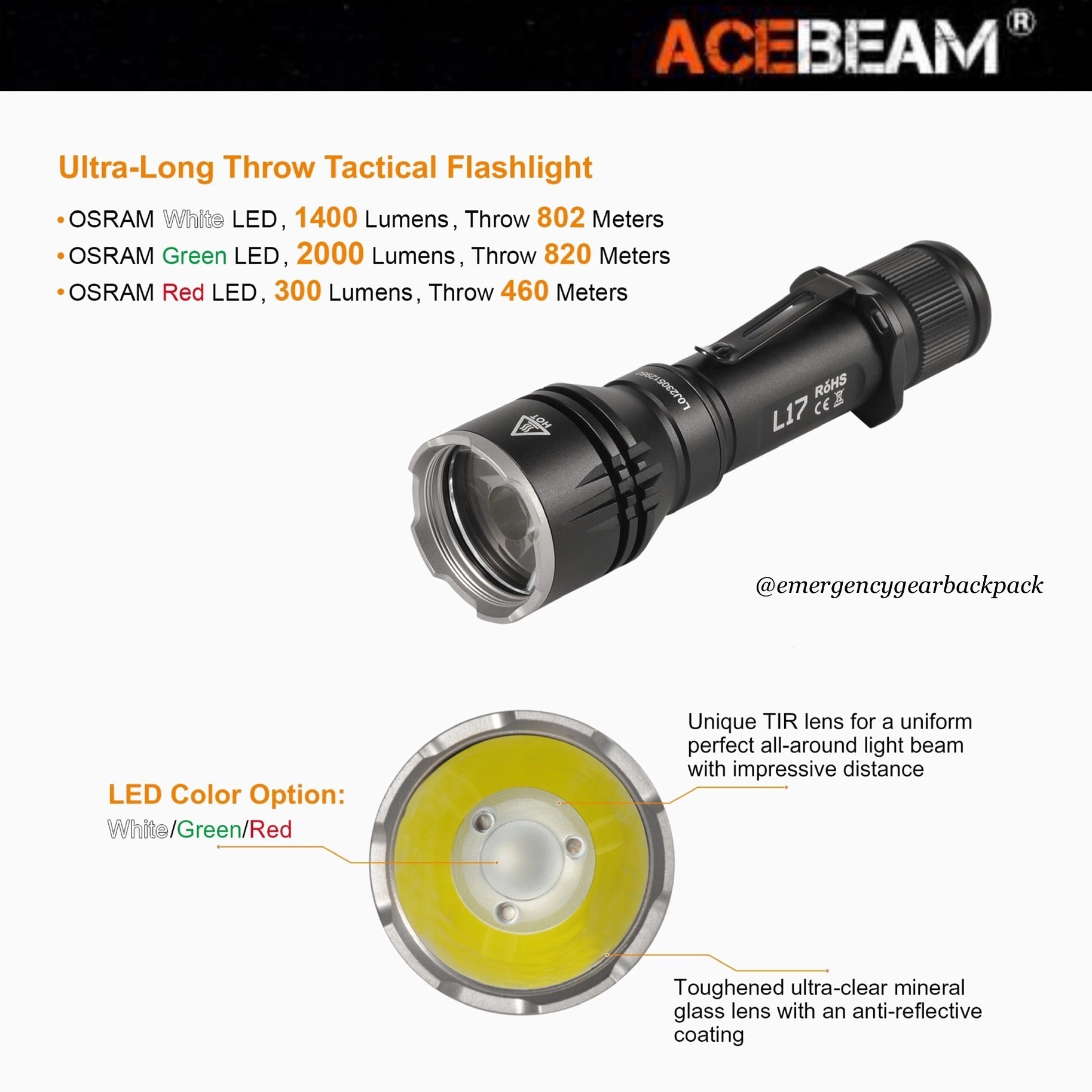 ACEBEAM L17 ไฟฉายคอมแพคแทคติคอลประสิทธิภาพสูง ขนาดพกพา ใช้หลอด Osram KW CSLNM2.TG LED ให้ความสว่างสูงสุด 1400 ลูเมนส์ / 160,801 แคนเดลา / แสงพุ่งไกล 802 เมตร