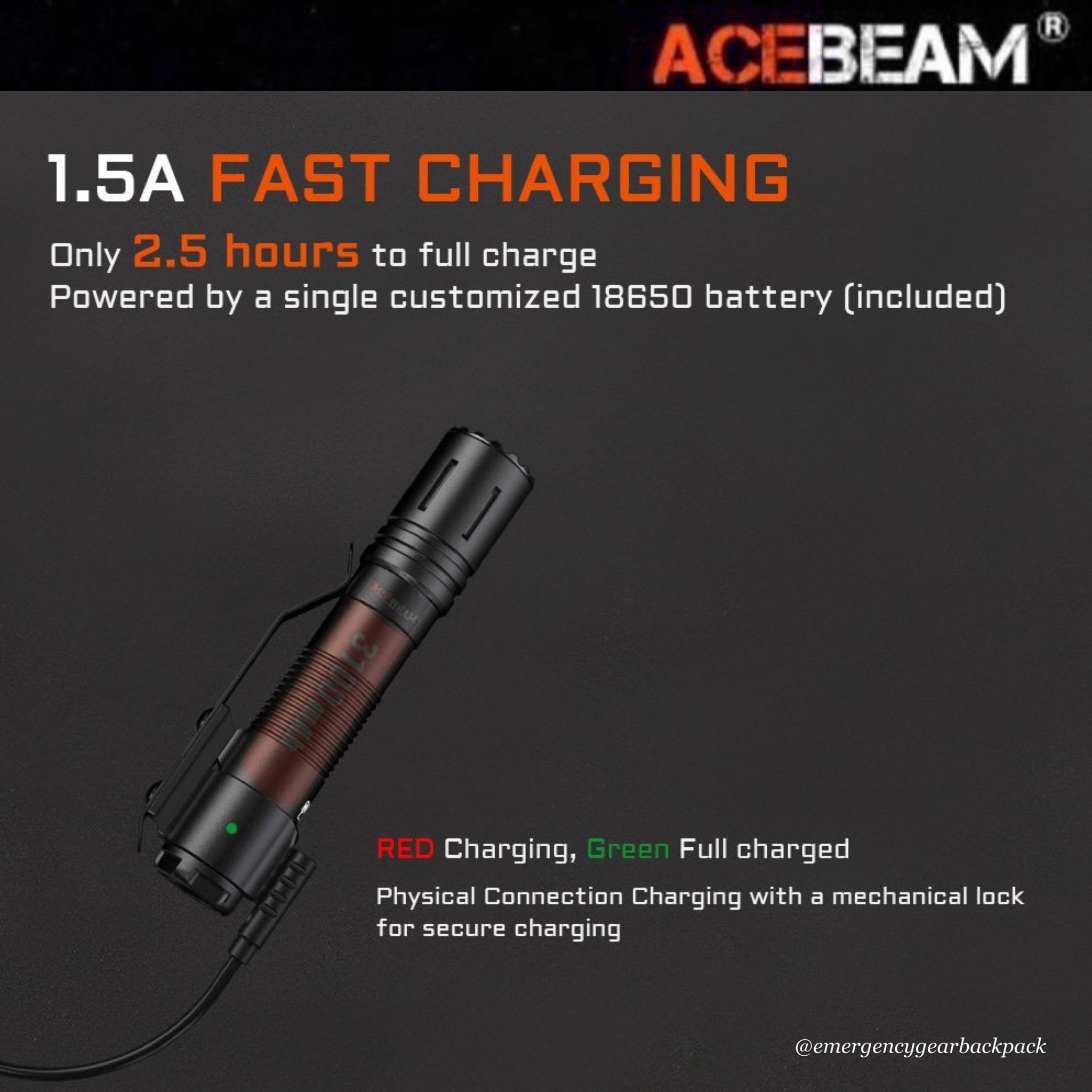 ใช้แบตเตอรี่เฉพาะทาง ACEBEAM ARC18650H-310A 3100mAh 3.6V 11.2Wh 20A ดีไซน์ขั้วบวก-ลบอยู่ด้านเดียว จ่ายไฟเสถียร และชาร์จได้ผ่านพอร์ต USB (5V/1.5A) ภายในตัวไฟฉาย ใช้เวลาเพียง 2.5 ชั่วโมง