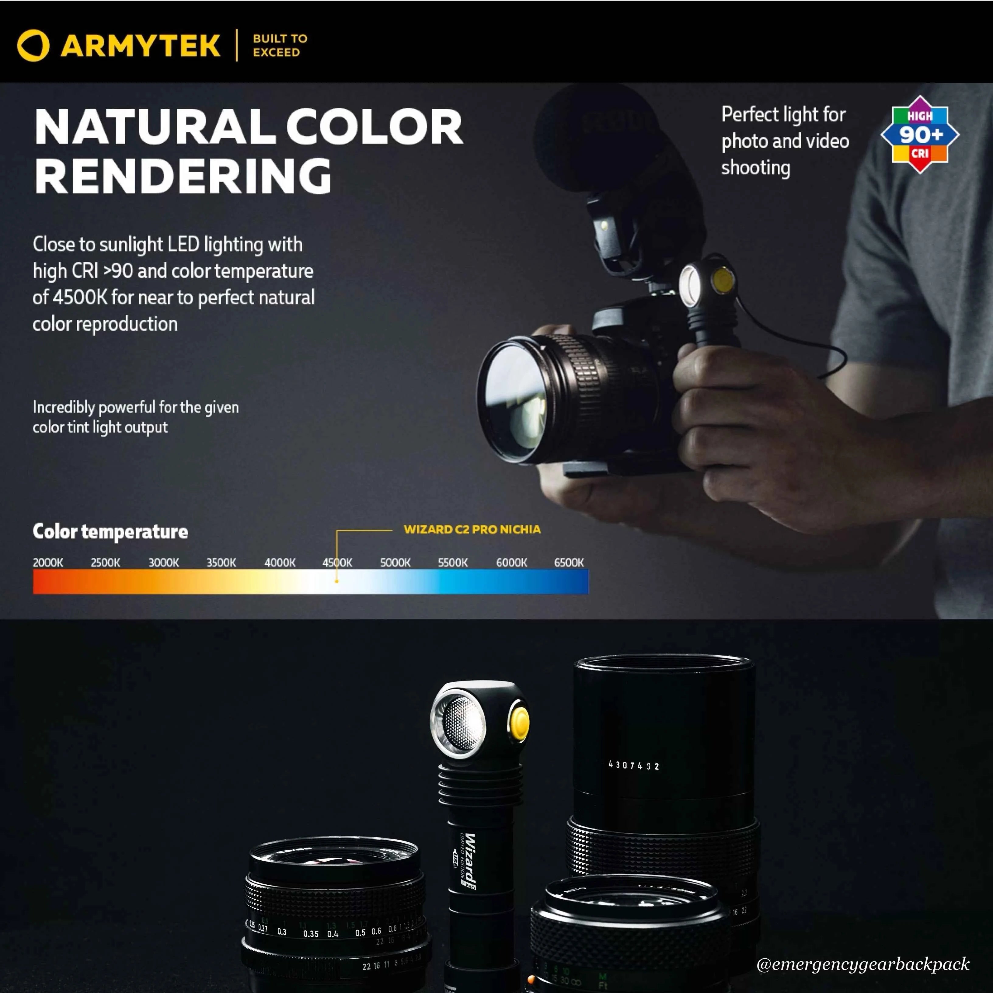 รุ่น Nichia High-CRI (CRI 90+) มาพร้อมโทนแสง Neutral Warm 4500K ที่ให้สีสันสมจริง รายละเอียดพื้นผิวคมชัด ช่วยแยกเฉดสีและคอนทราสต์ได้ดีกว่า LED ทั่วไปอย่างชัดเจน เหมาะอย่างยิ่งกับงานที่ต้องการมองเห็นรายละเอียดสูง เช่น งานไฟฟ้า งานซ่อมเครื่องจักร งานกู้ภัย งานแพทย์ งานถ่ายภาพภาคสนาม และการใช้งานใกล้ตัวที่ไม่ต้องการแสงจ้าบาดตา