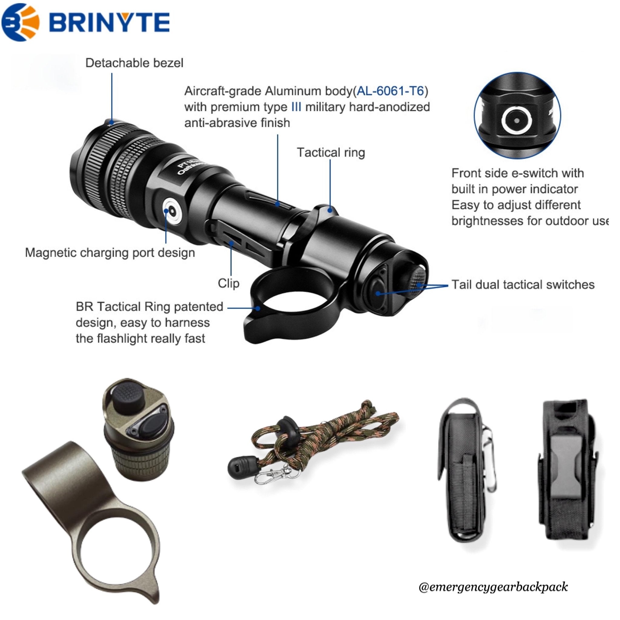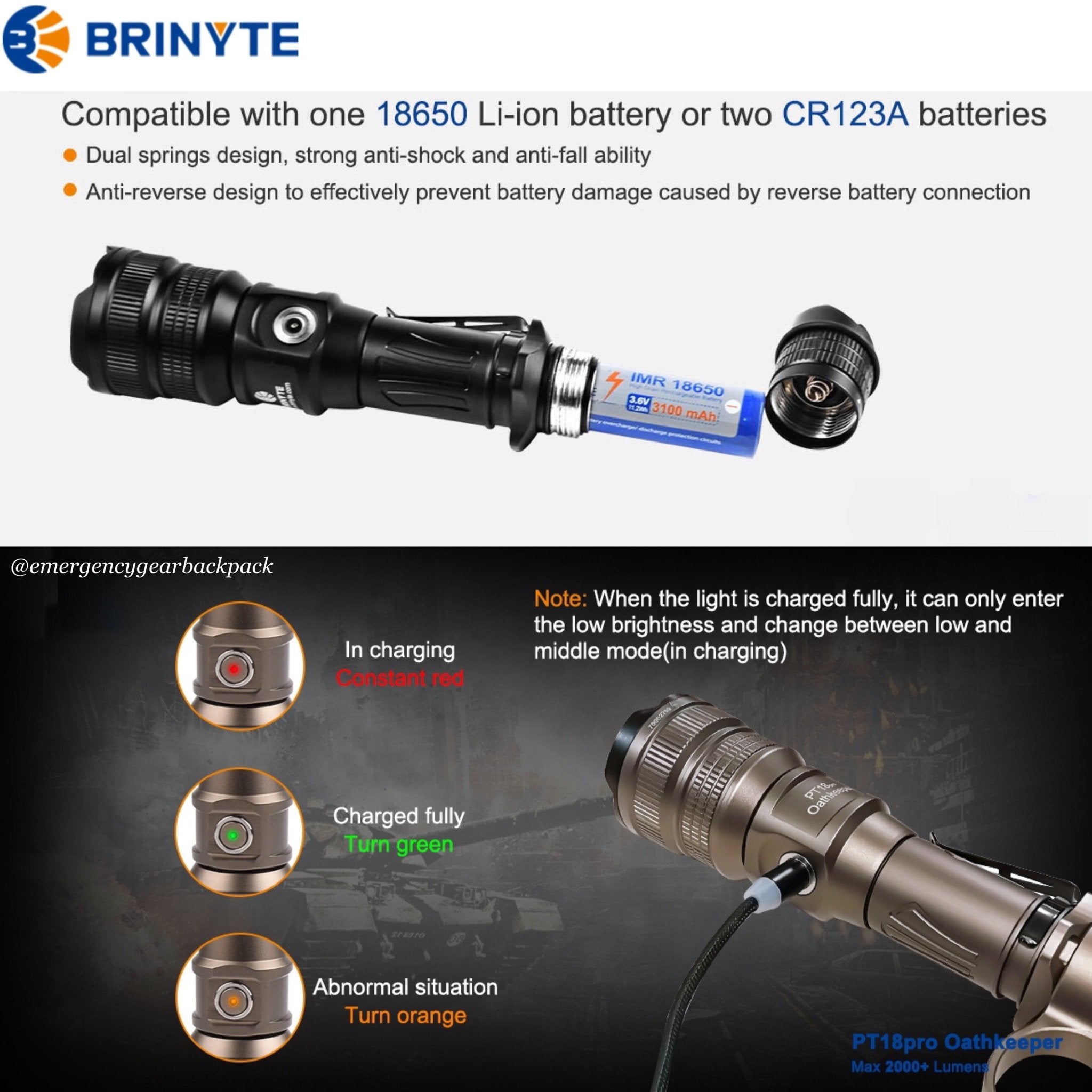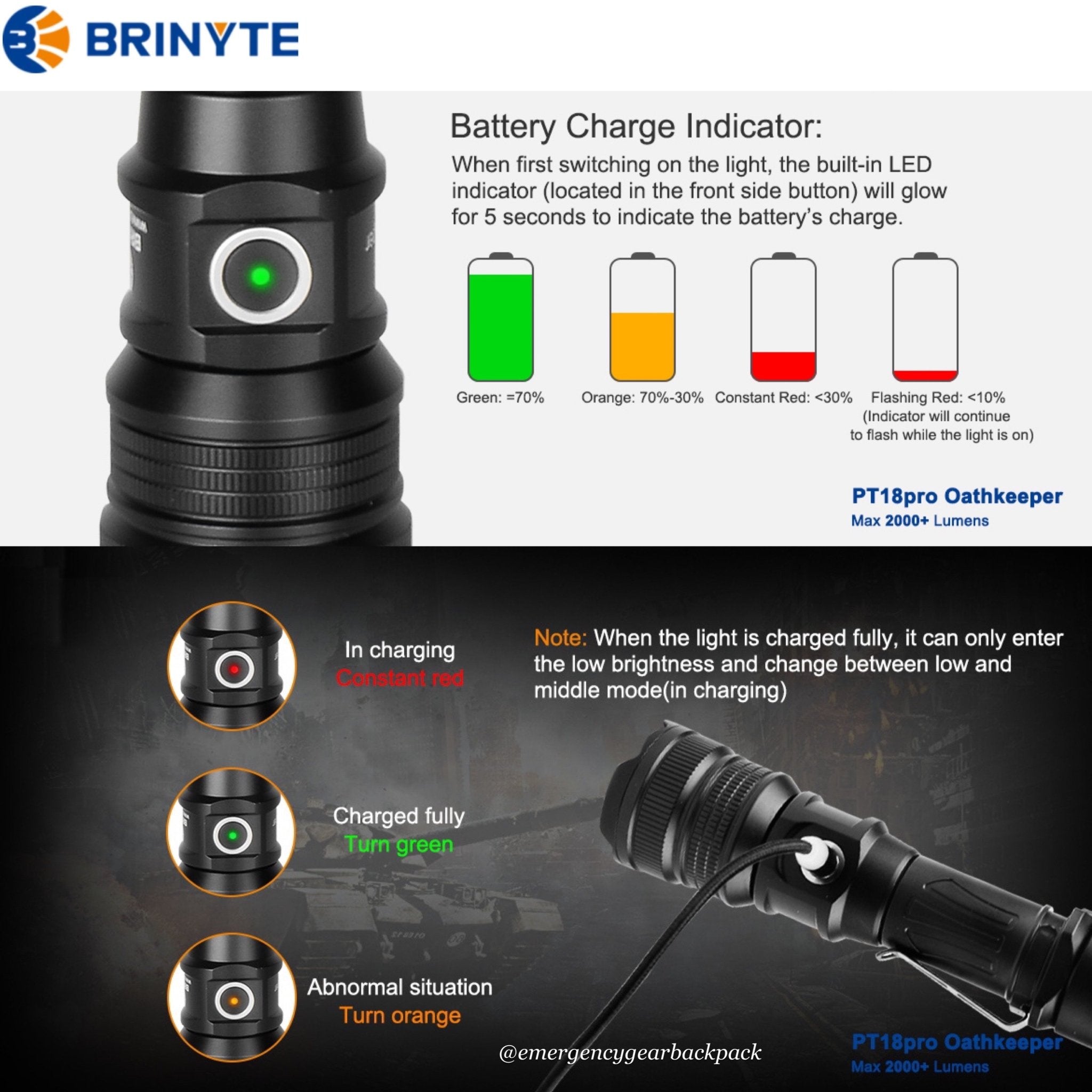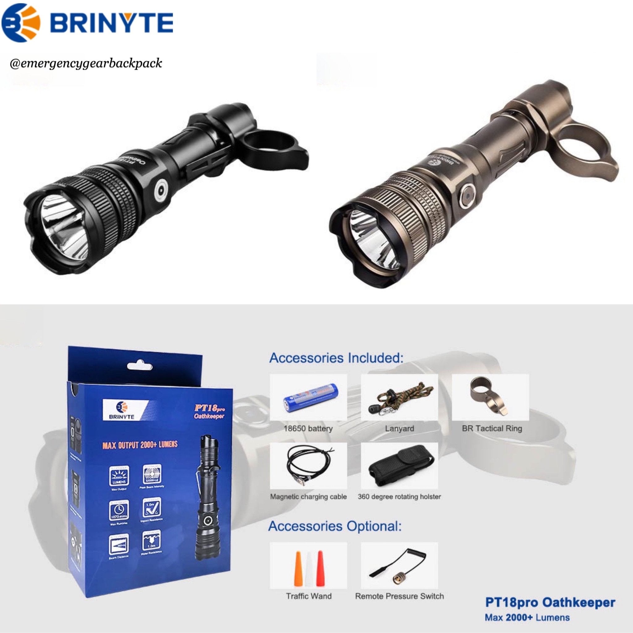 BRINYTE PT18Pro Oathkeeper ไฟฉายยุทธวิธีที่ได้รับการยอมรับในระดับสากล โดดเด่นด้วยดีไซน์ที่ผสมผสานระหว่างประสิทธิภาพสูงและความทนทาน ผลิตภัณฑ์นี้ได้รับการออกแบบมาเพื่อตอบสนองความต้องการของผู้ใช้งานระดับมืออาชีพและผู้ที่ต้องการอุปกรณ์คุณภาพสูงสุด