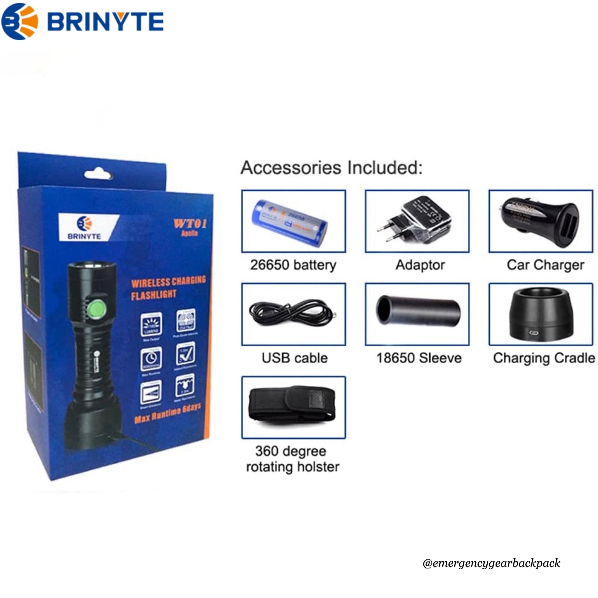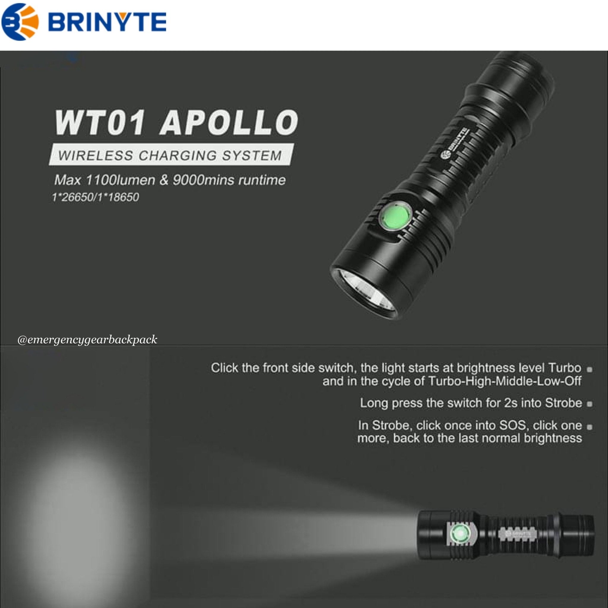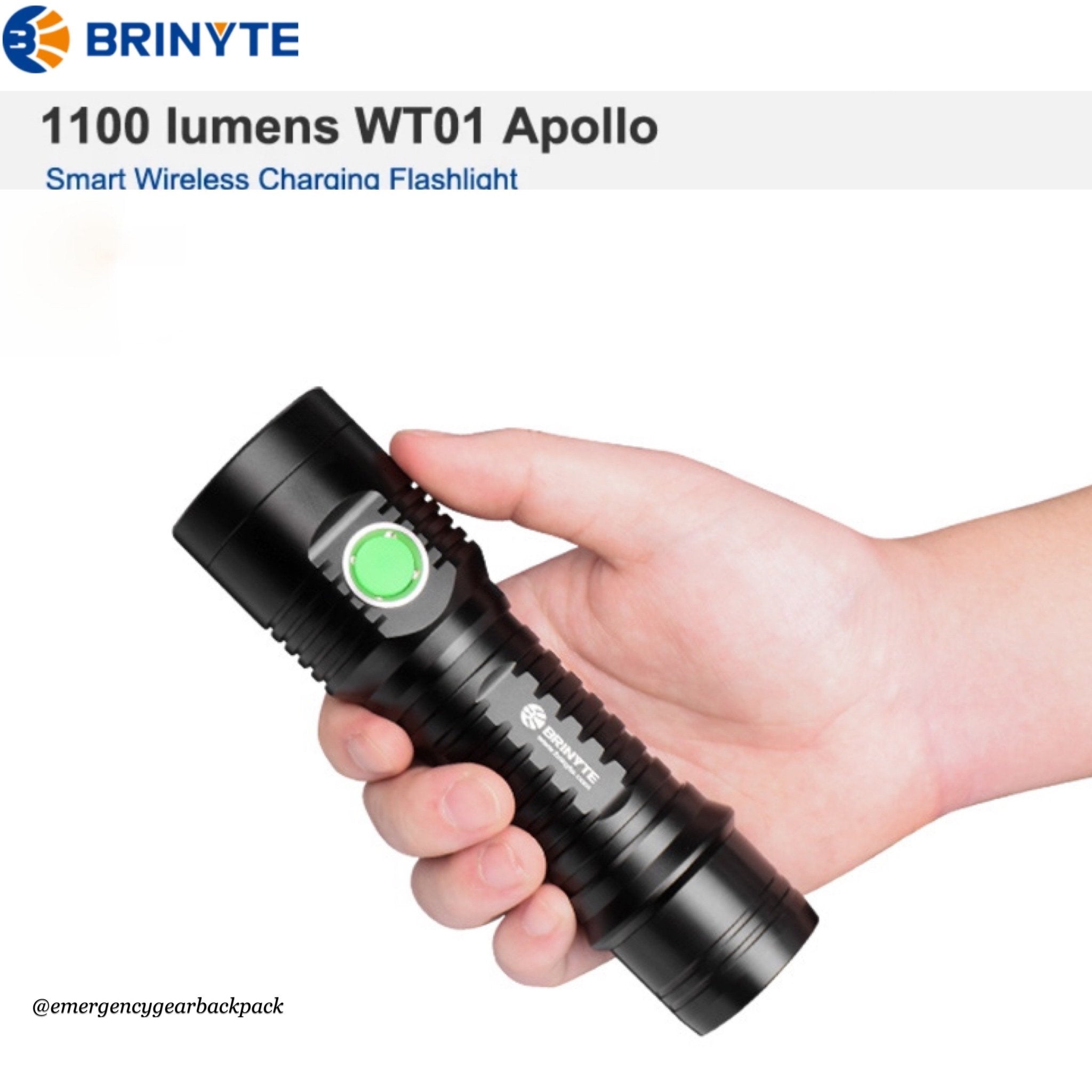 BRINYTE WT01 Apollo ไฟฉายคุณภาพสูงที่มาพร้อมแท่นชาร์จแบบไร้สาย (Wireless Charging Cradle) ออกแบบให้เป็นได้ทั้งไฟฉายพกพาและไฟฉุกเฉินอัจฉริยะ มอบประสิทธิภาพสูงสุดทั้งในบ้านและนอกสถานที่