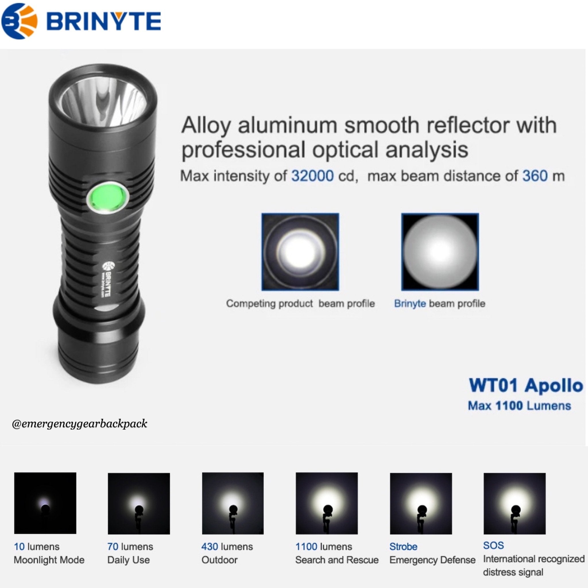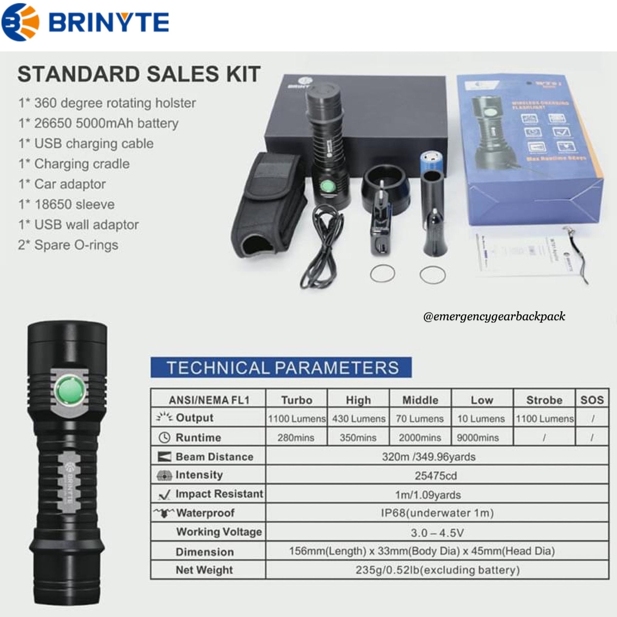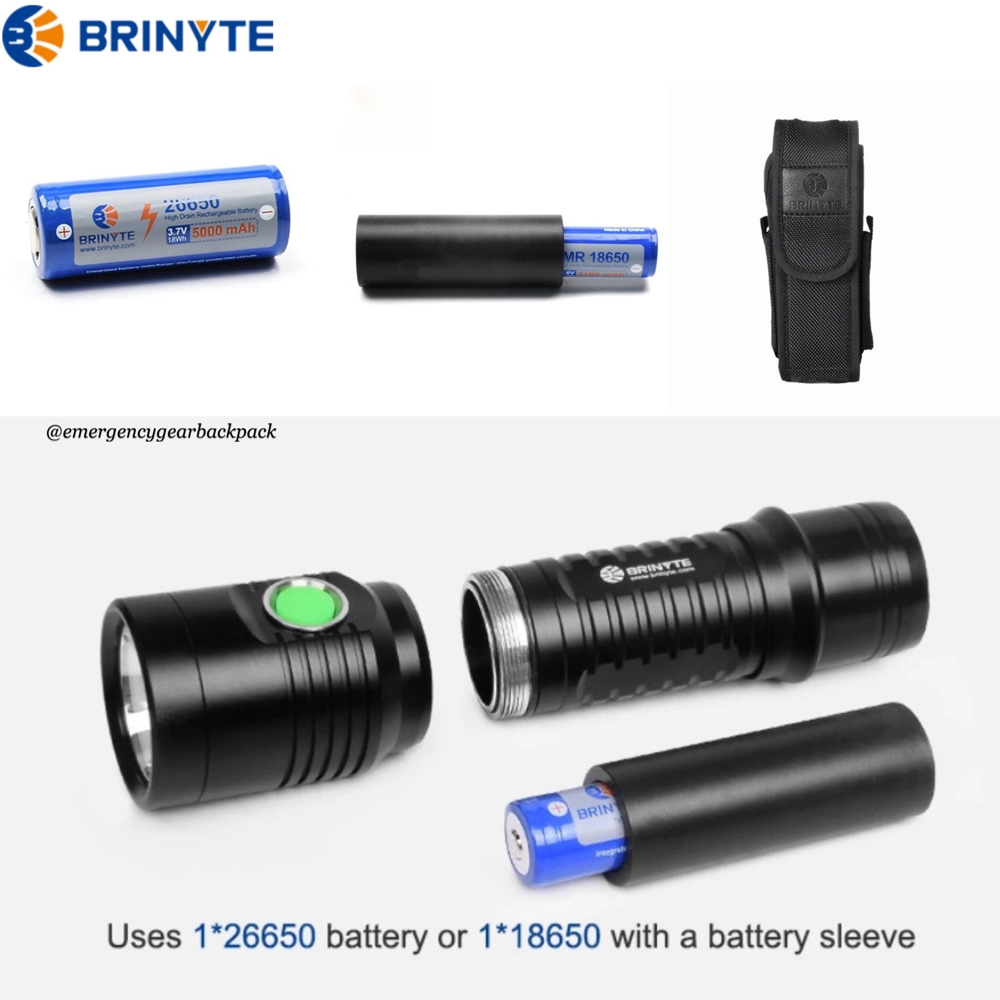 - Battery: BRINYTE IMR26650 5000mAh | Runtime up to 150 hrs