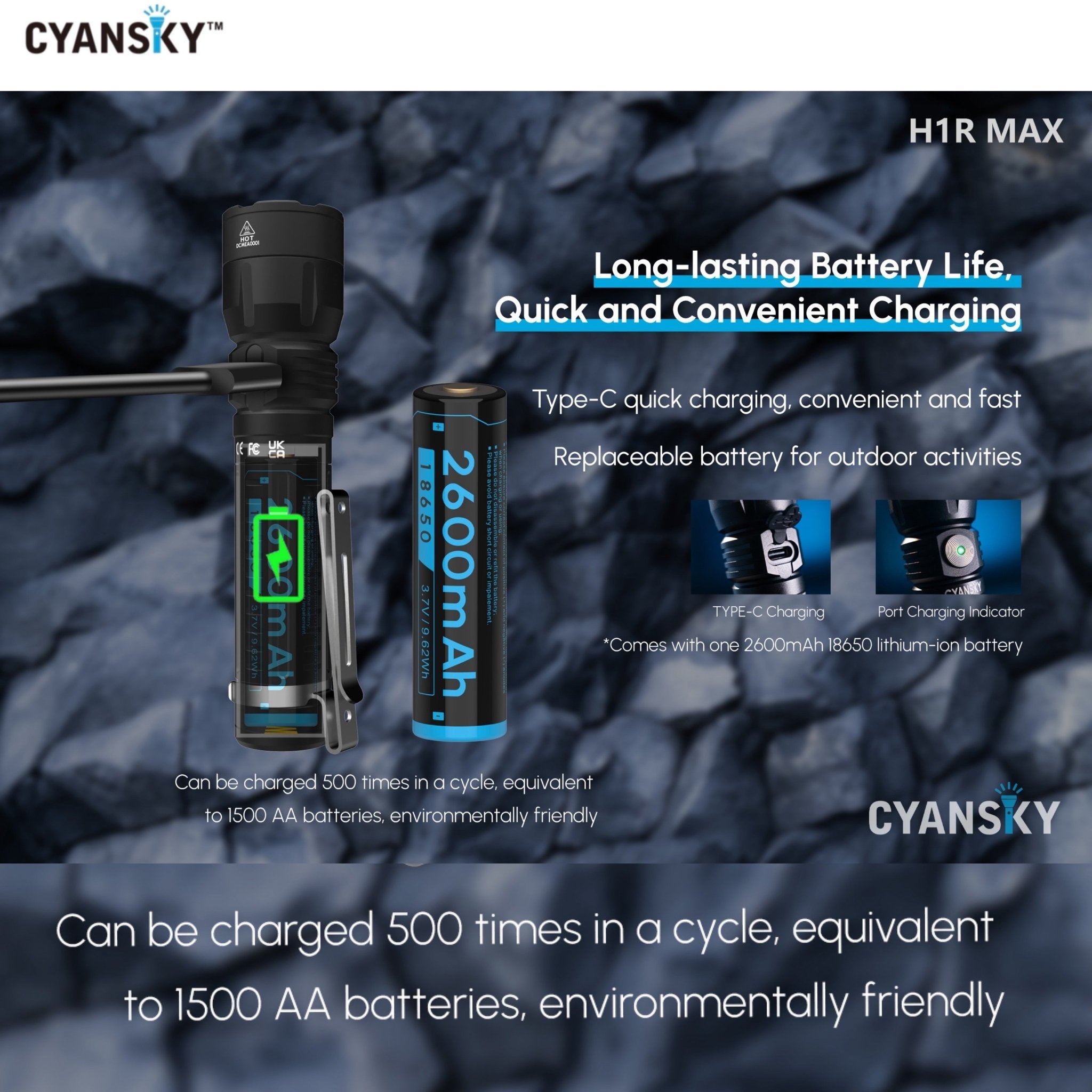 อุปกรณ์ใช้แบตเตอรี่ Cyansky BL1826 18650 2600mAh 3.6V 9.36Wh ให้รันไทม์นานสุด 120 ชั่วโมงในโหมดประหยัดไฟ และรองรับแบตเตอรี่ 18650 แบบ Flat Top/ Button Top และ CR123A/16340 x 2