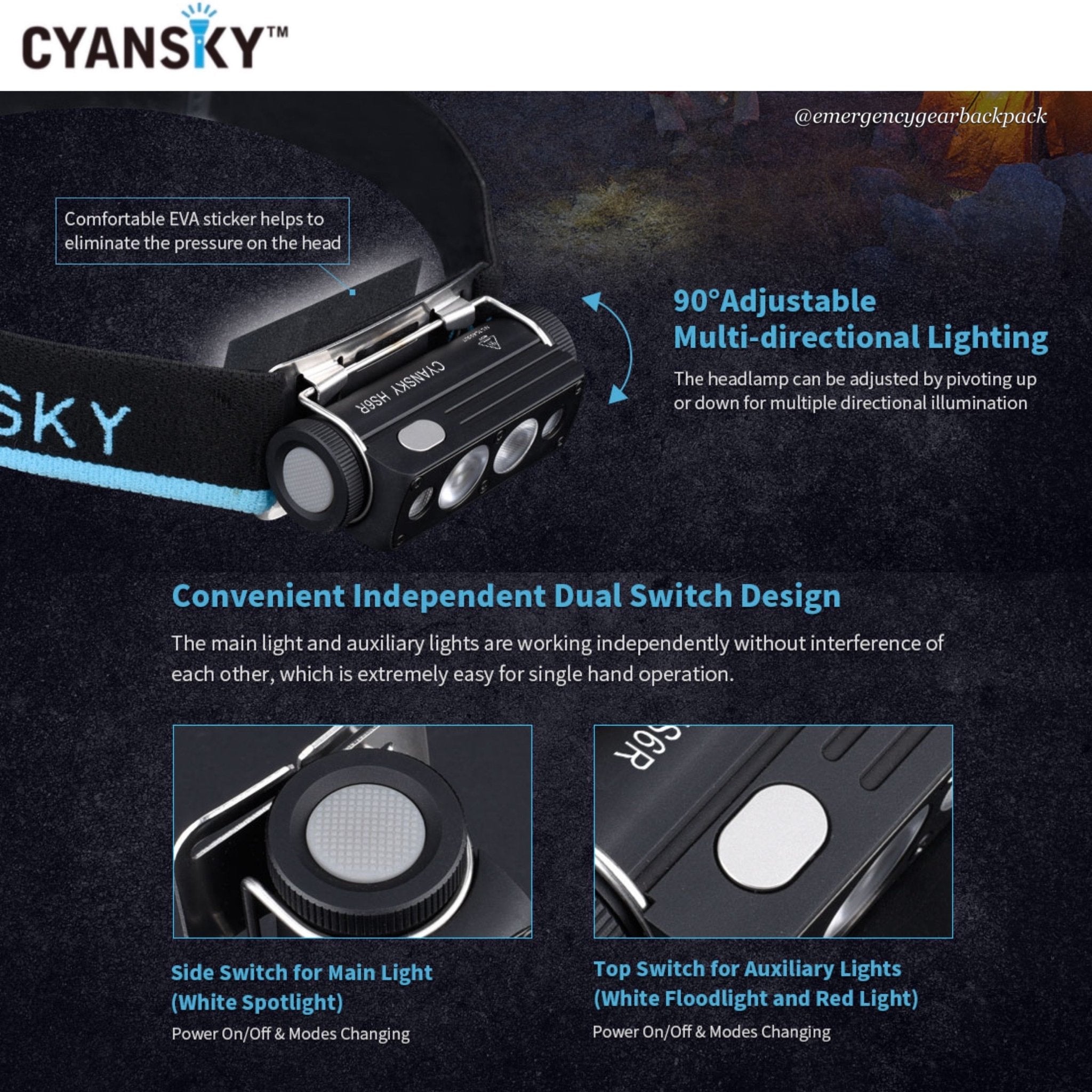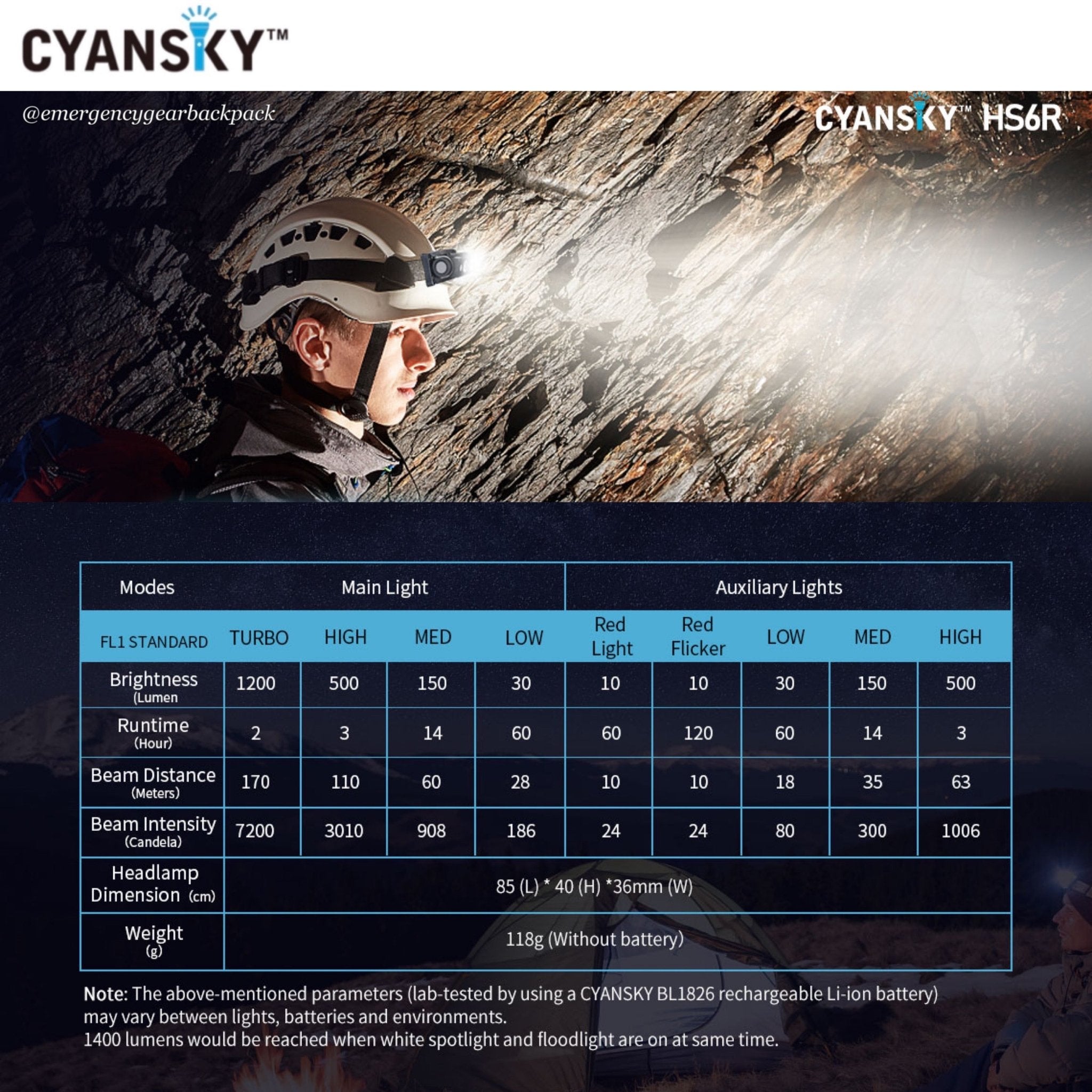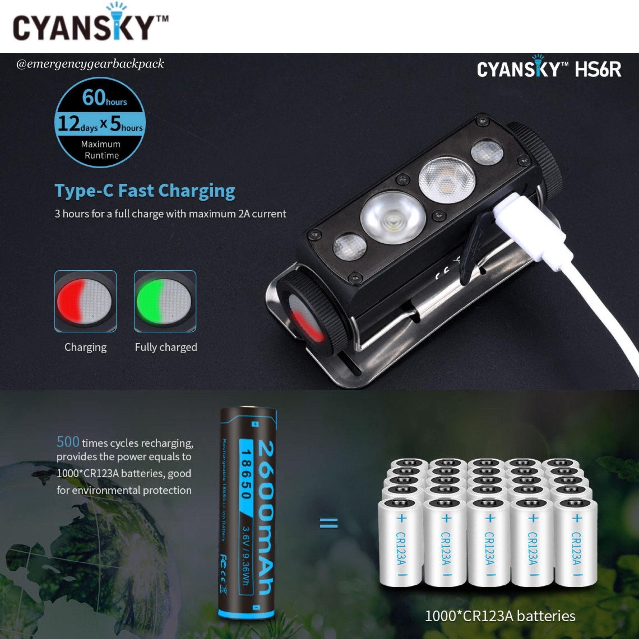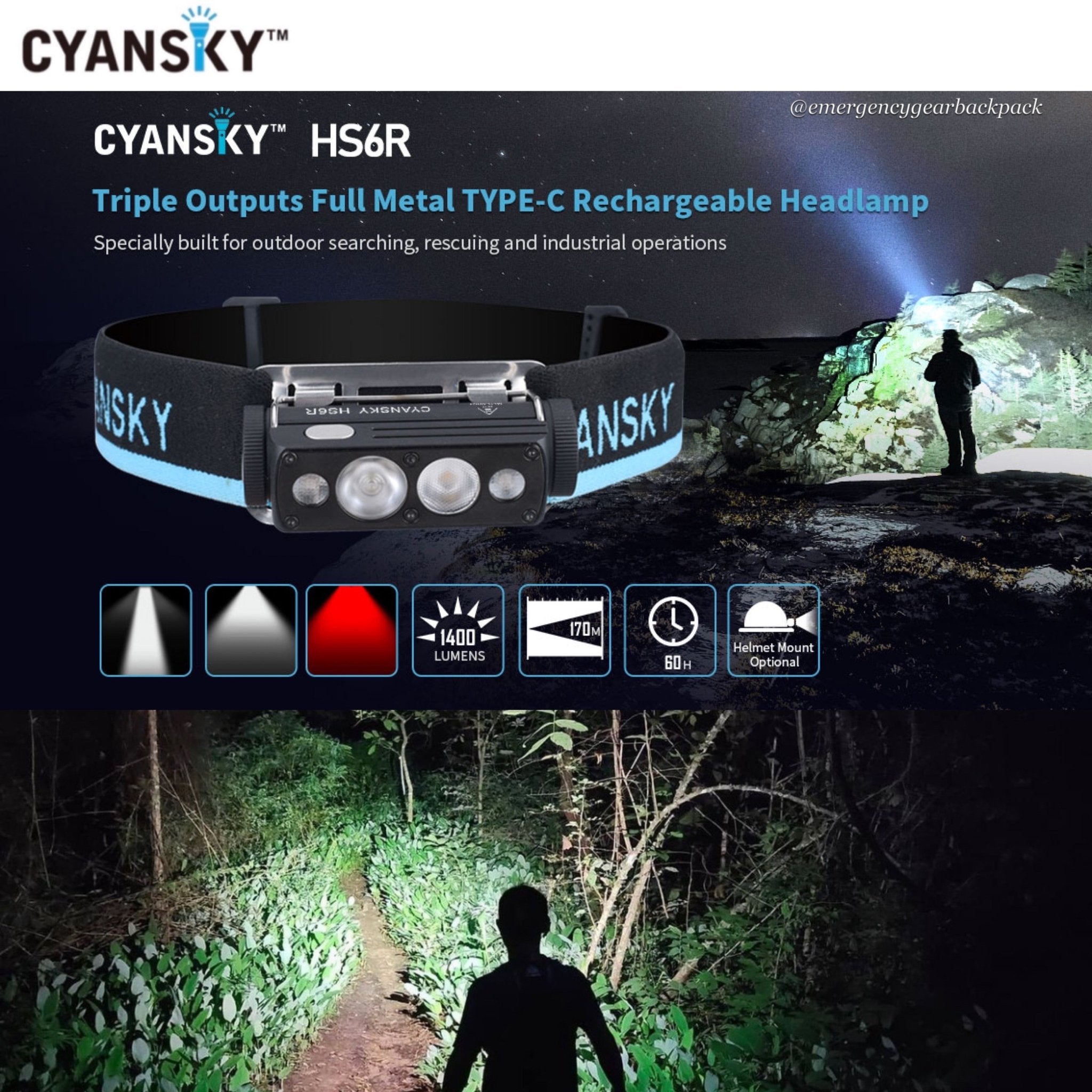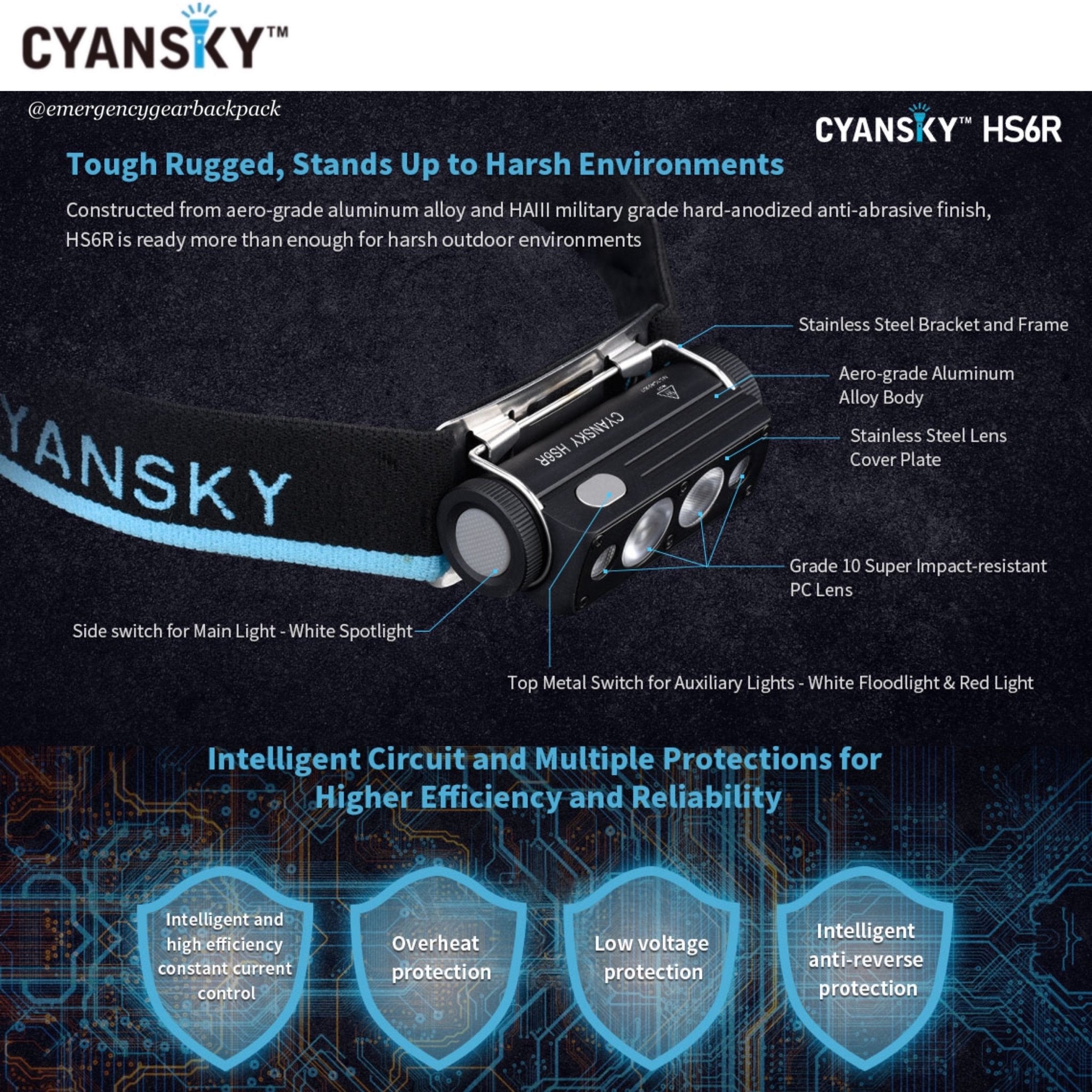 Cyansky HS6R ให้ประสิทธิภาพสูงในการส่องสว่างระยะใกล้ และระยะกลาง โครงสร้างออกแบบแข็งแรง ใช้งานได้ทุกลักษณะภูมิประเทศ ใช้สำหรับกิจกรรมกลางแจ้ง เดินป่า ออกค่ายพักแรมแคมป์ปิ้ง สำรวจถ้ำ งานค้นหากู้ภัย ใช้ตรวจสอบบริเวณสถานที่ ใช้งานแบบ close up สำหรับอ่านหนังสือ งานช่าง การตรวจสอบ ซ่อมแซมอุปกรณ์ หรือใช้งานทั่วไป