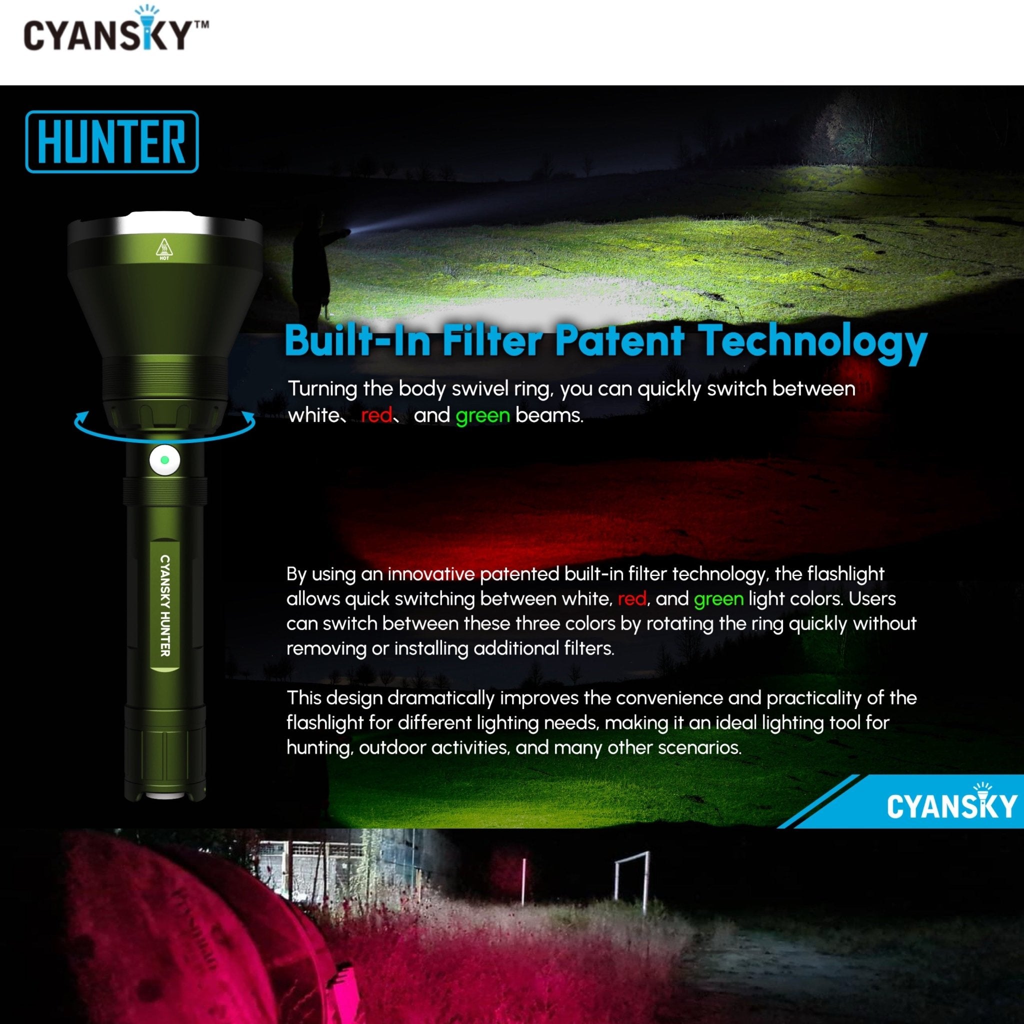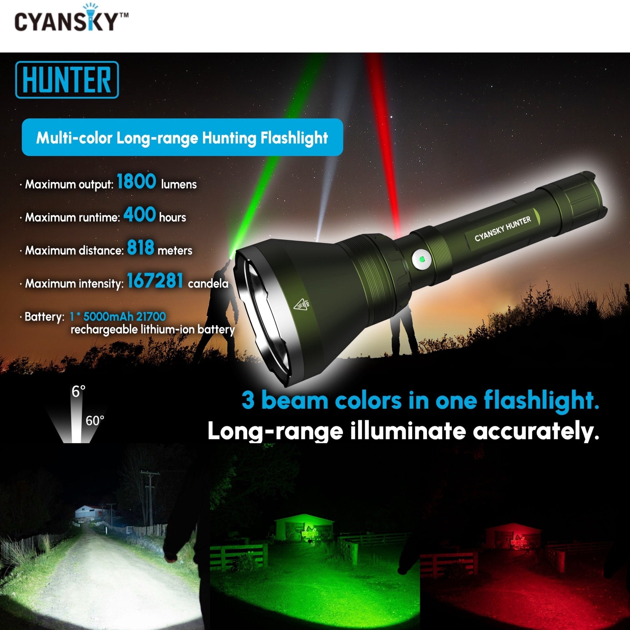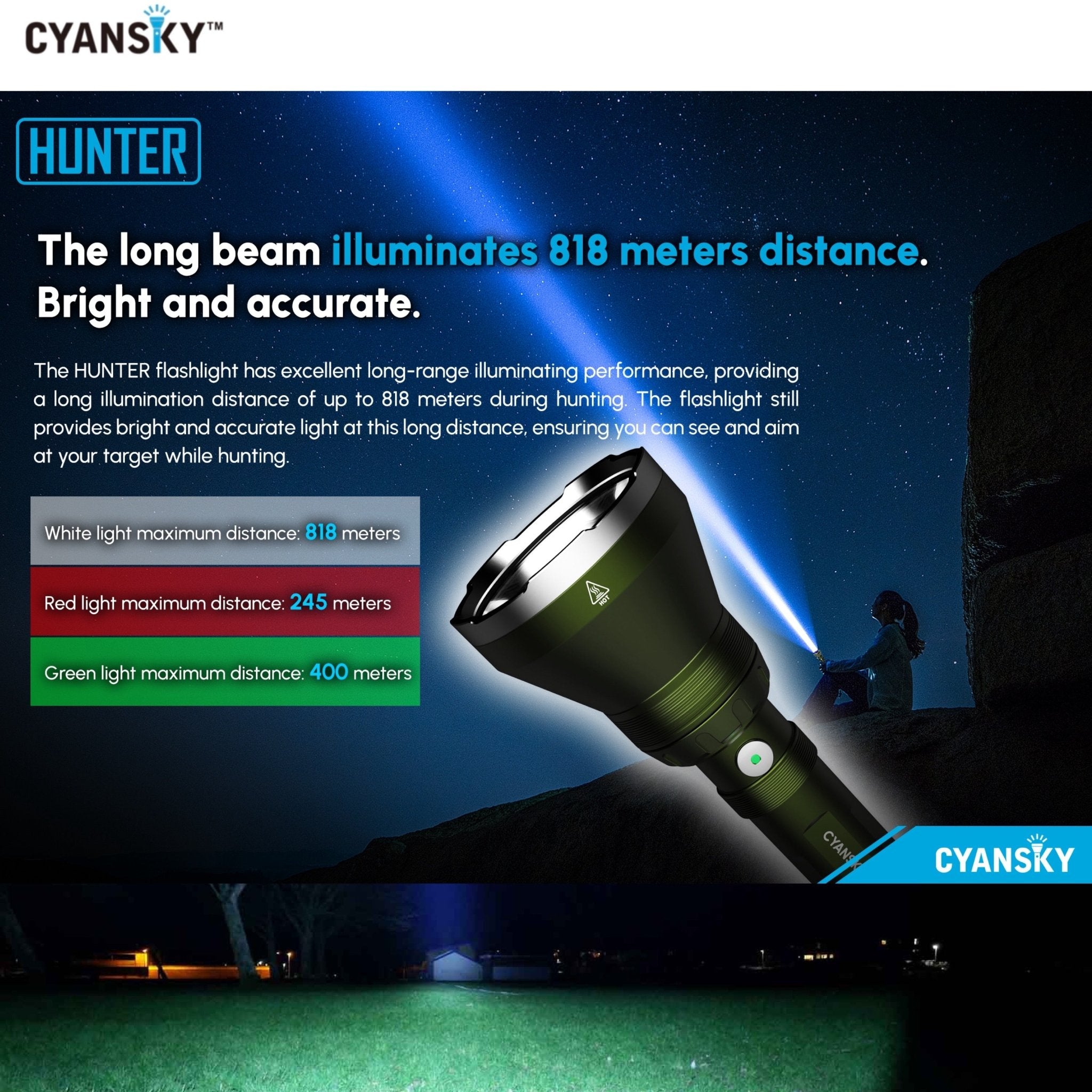 Cyansky HUNTER เหมาะสำหรับการใช้งานการสำรวจพื้นที่จากระยะไกล การใช้งานเชิงยุทธวิธี การพรางแสงส่องสว่าง การใช้งานในป่า แคมปิ้ง ใช้เป็นไฟค้นหา หรือส่องดูสัตว์เวลากลางคืน