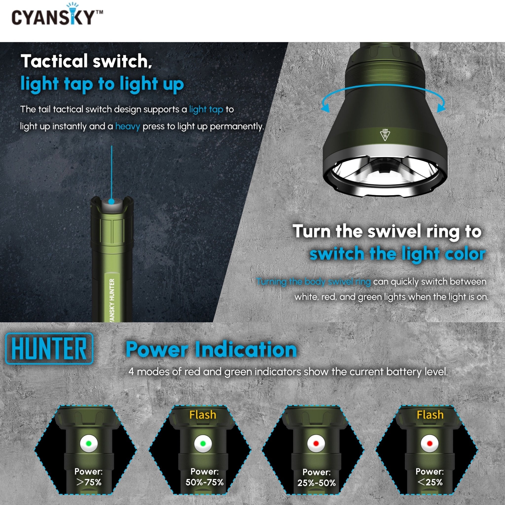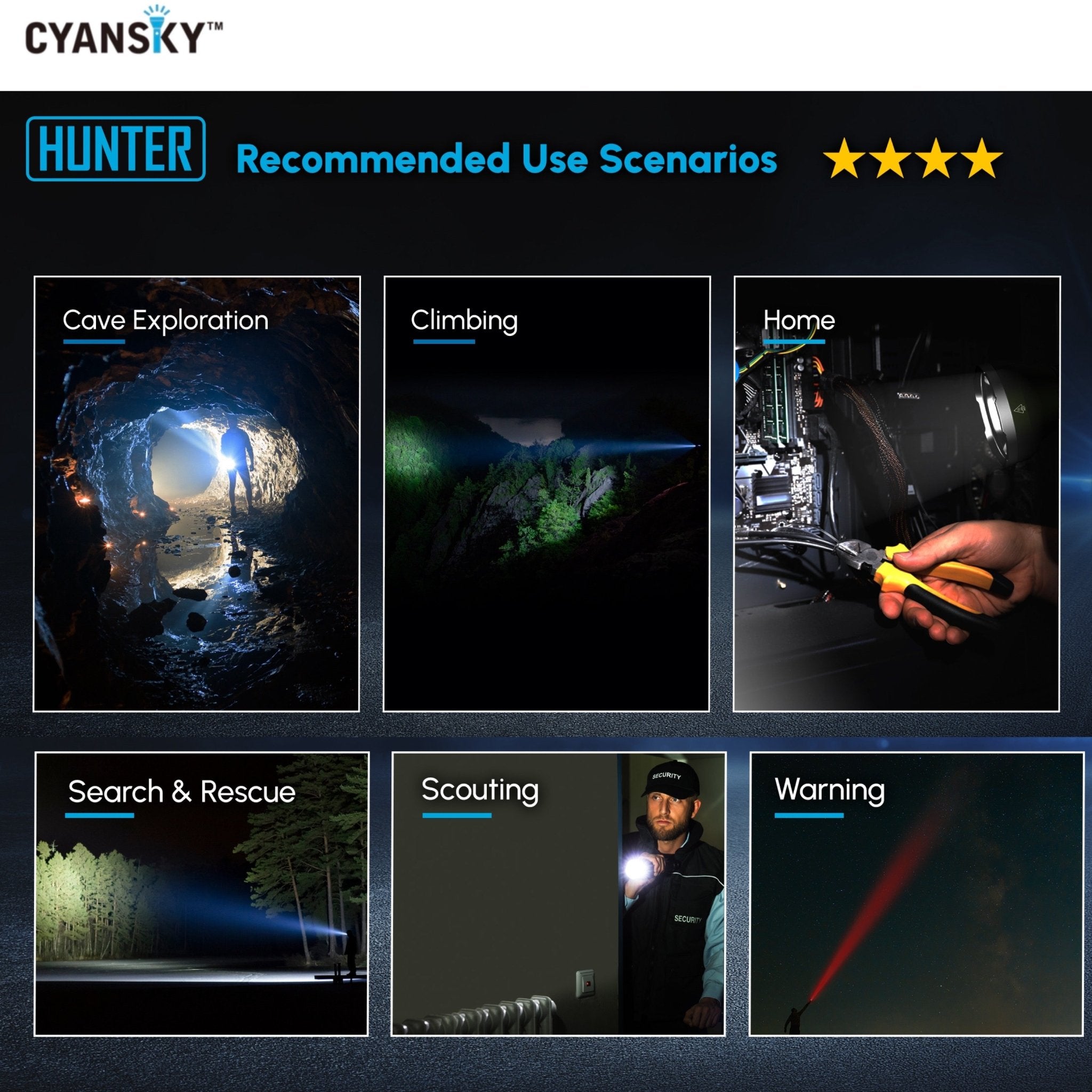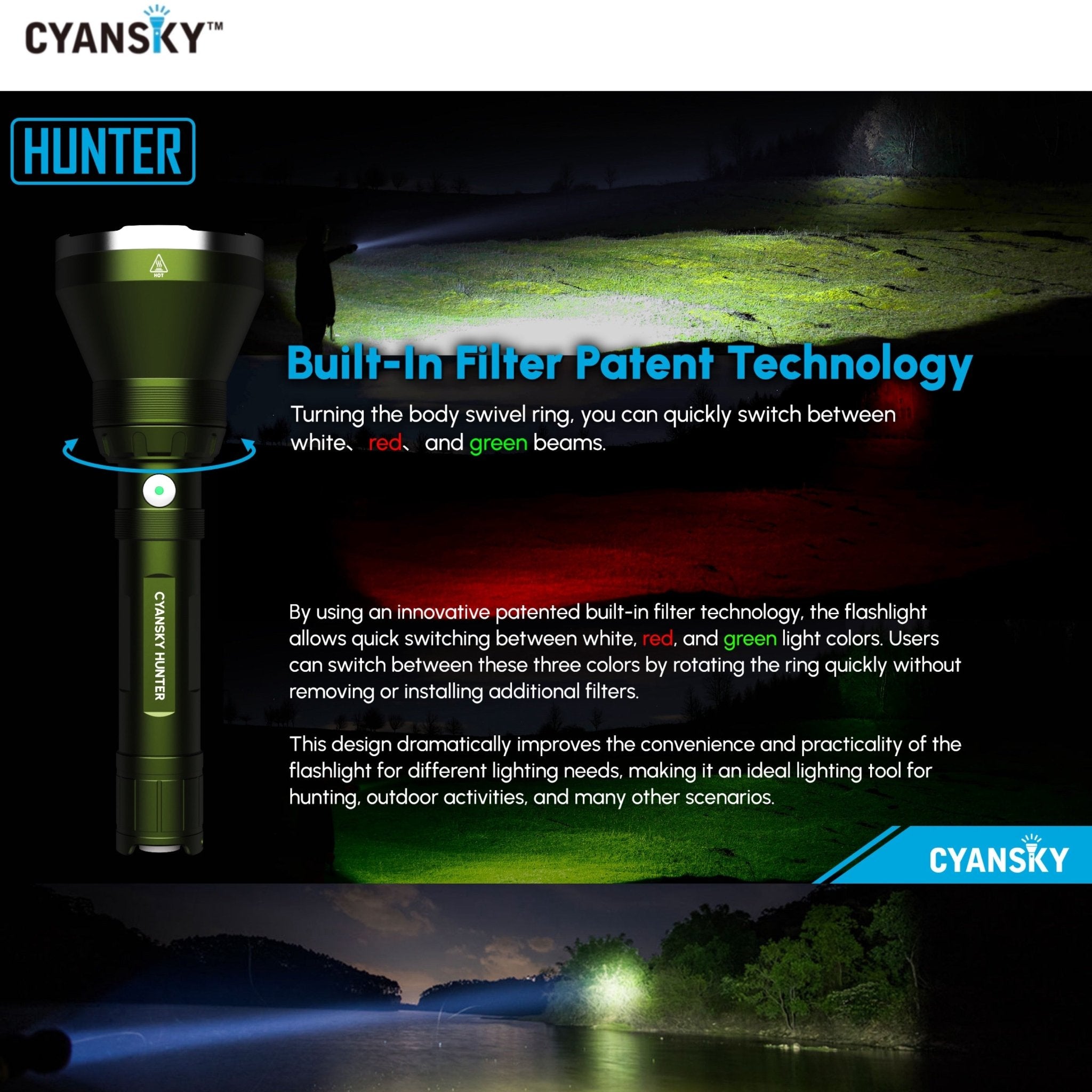 Cyansky HUNTER เหมาะสำหรับการใช้งานการสำรวจพื้นที่จากระยะไกล การใช้งานเชิงยุทธวิธี การพรางแสงส่องสว่าง การใช้งานในป่า แคมปิ้ง ใช้เป็นไฟค้นหา หรือส่องดูสัตว์เวลากลางคืน