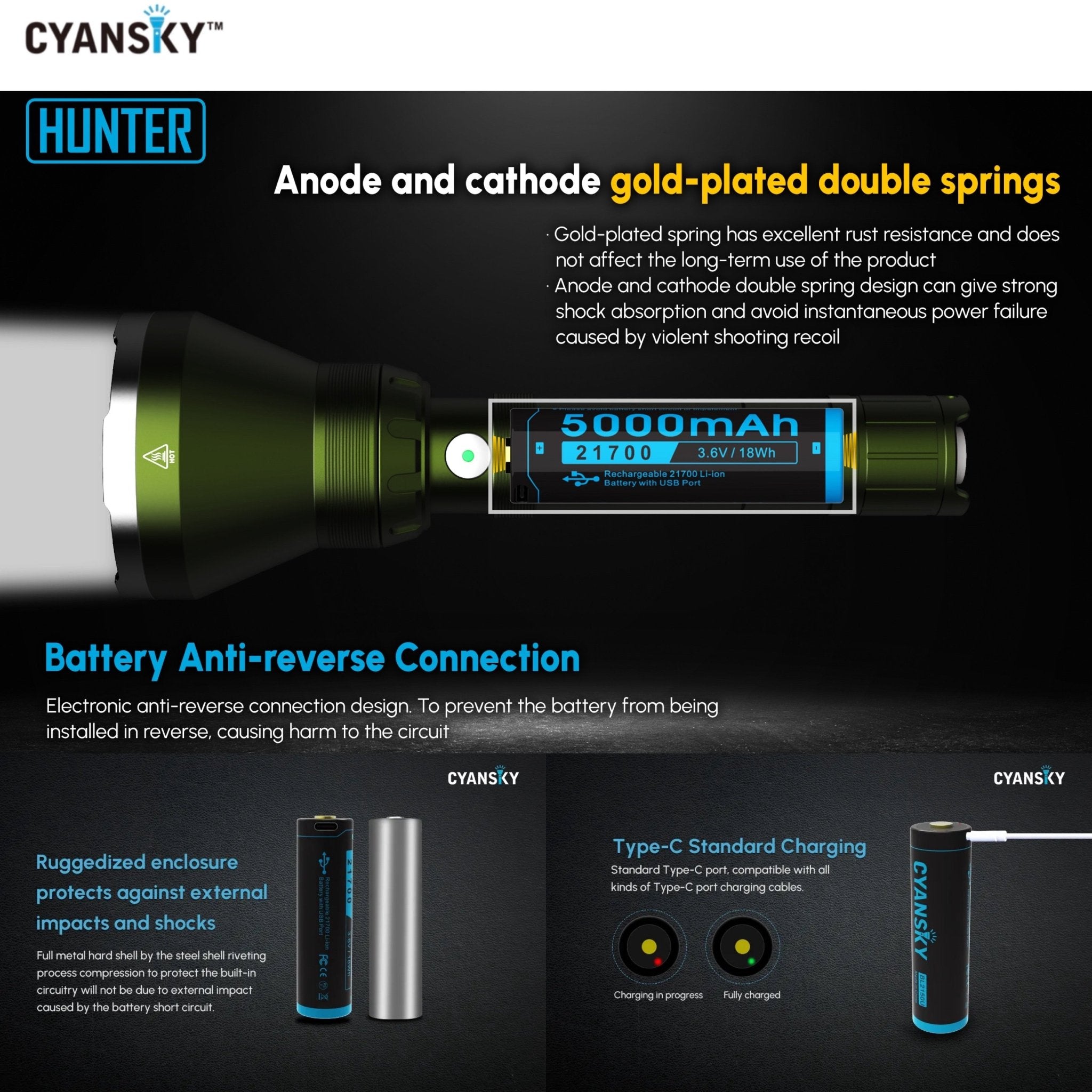 - ชุดอุปกรณ์มาพร้อมแบตเตอรี่ Cyansky BL2150U 21700 5000mAh 3.6V 18Wh 8A ชาร์จไฟผ่านพอร์ต USB-C ที่ขั้วบวกของแบตเตอรี่ ที่กระแสไฟ 2A