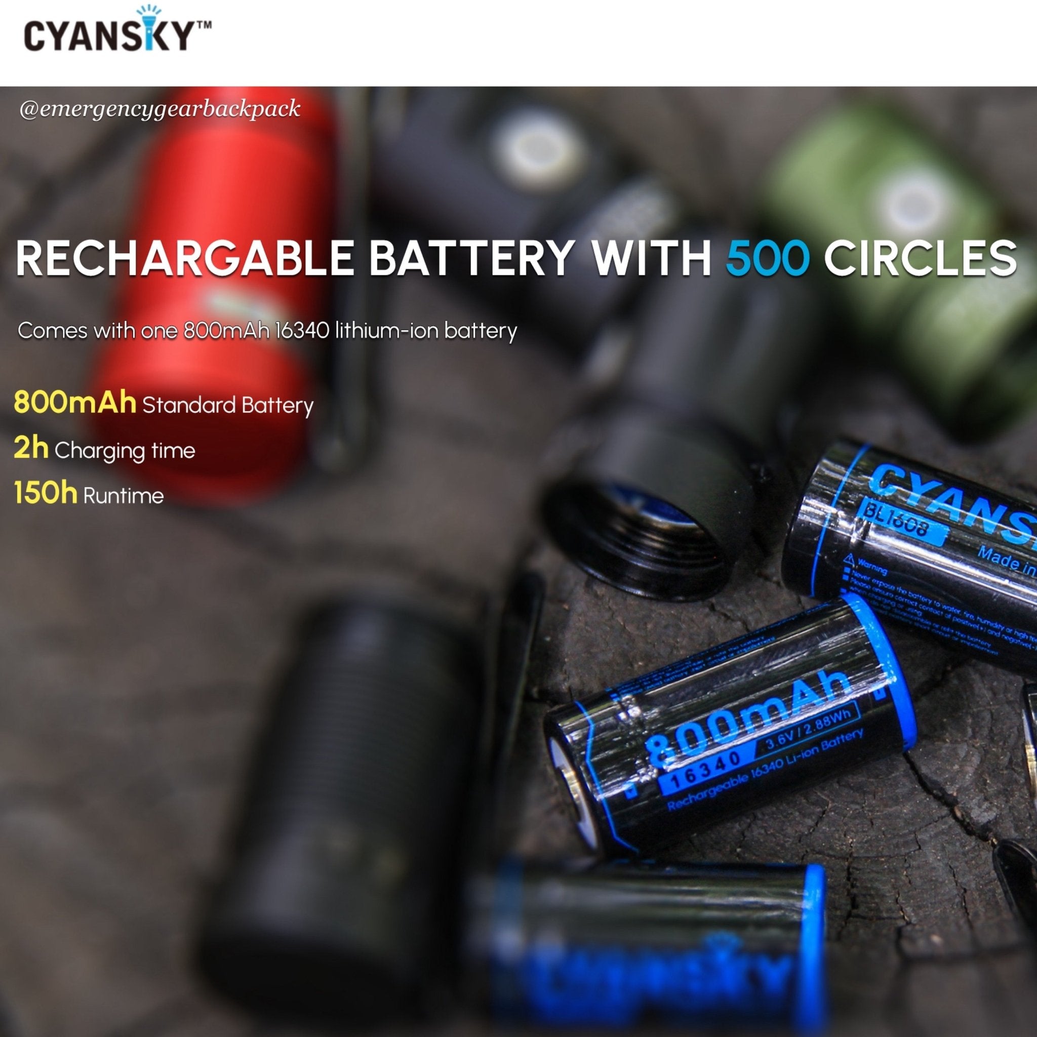อุปกรณ์มาพร้อมแบตเตอรี่ Cyansky BL1608 16340 800mAh 3.6V 2.88Wh ชาร์จไฟผ่านพอร์ต USB-C ที่ลำตัวไฟฉายที่ 5V/2A ชาร์จไฟเต็มภายในเวลา 2  ชั่วโมง ให้รันไทม์นานสุด 150 ชั่วโมง ในโหมดประหยัดไฟ