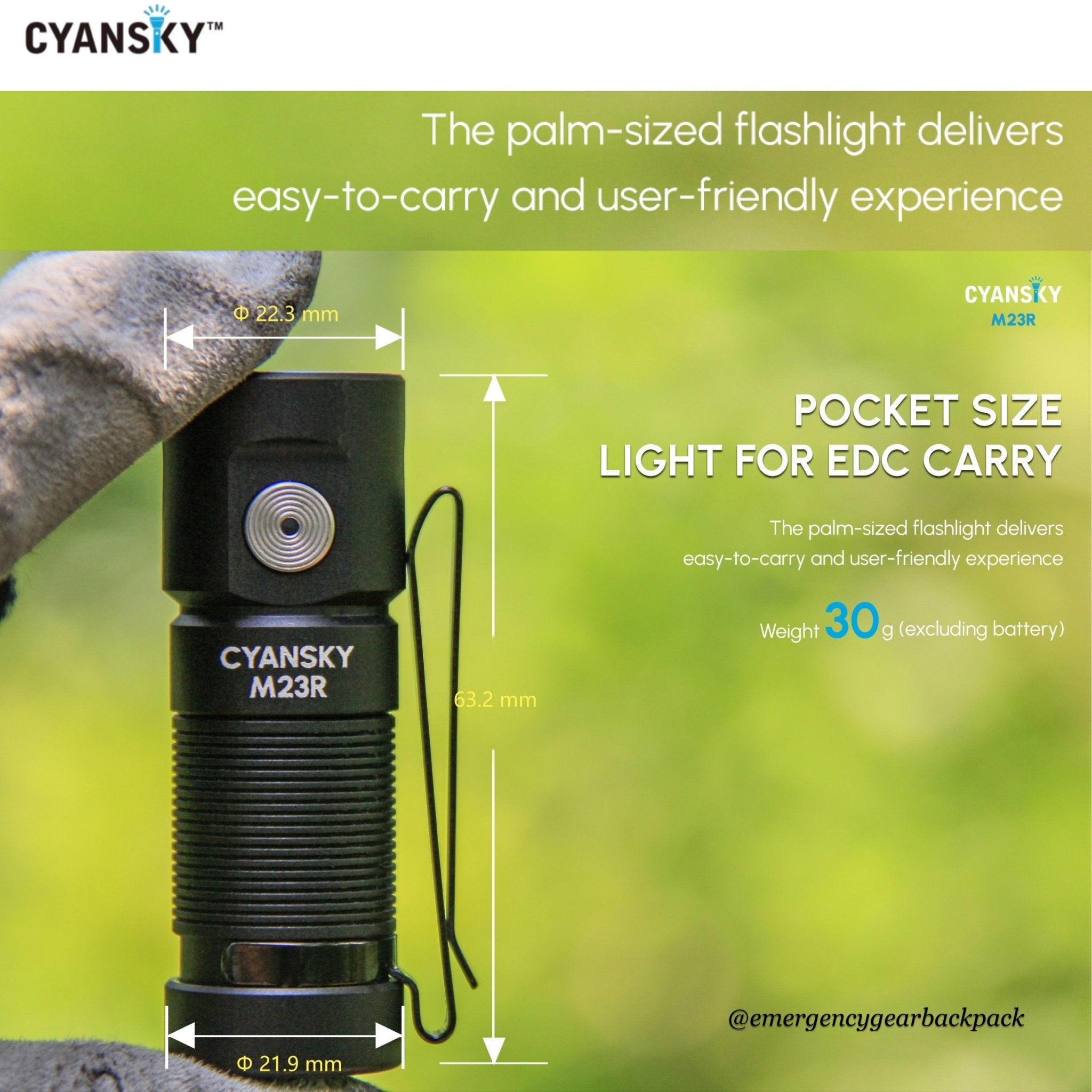 Cyansky M23R  ไฟฉายพกพาขนาดเล็ก รองรับโหมดแสง 9 ระดับ  อุปกรณ์มาพร้อมสายคล้องมือ คลิปสองทาง และฝาท้ายแม่เหล็ก เพิ่มความสะดวกในการใช้งานในทุกสถานการณ์