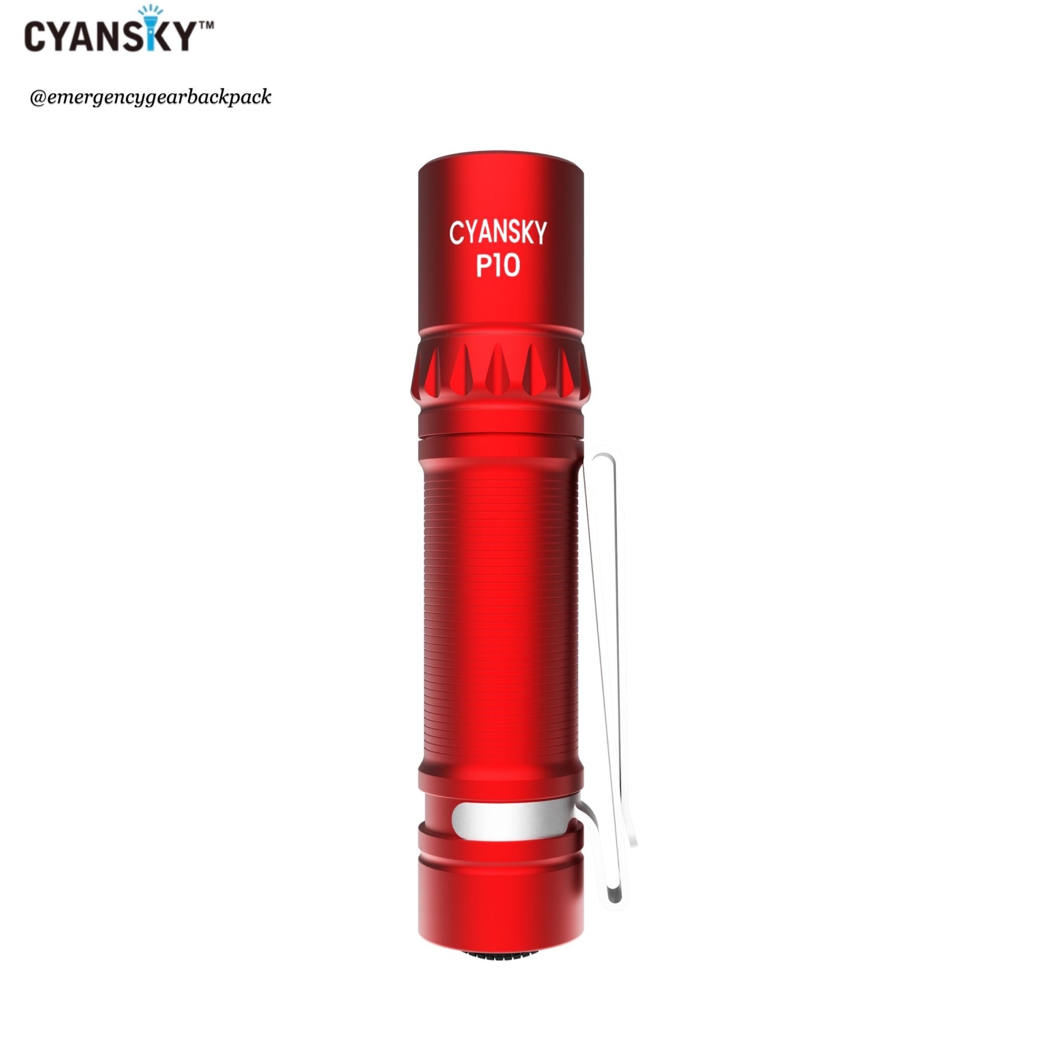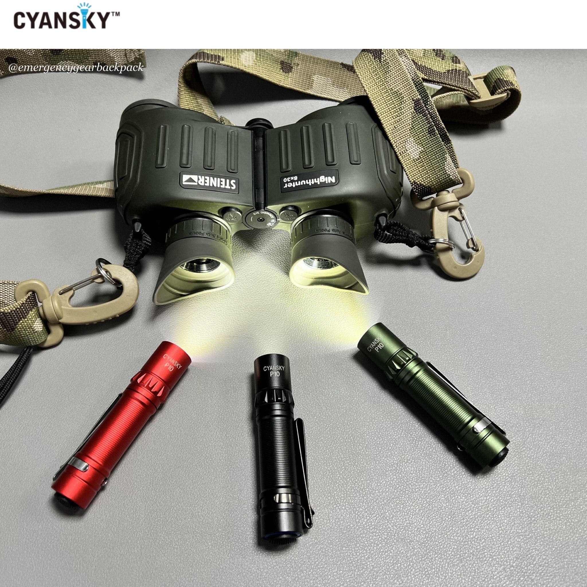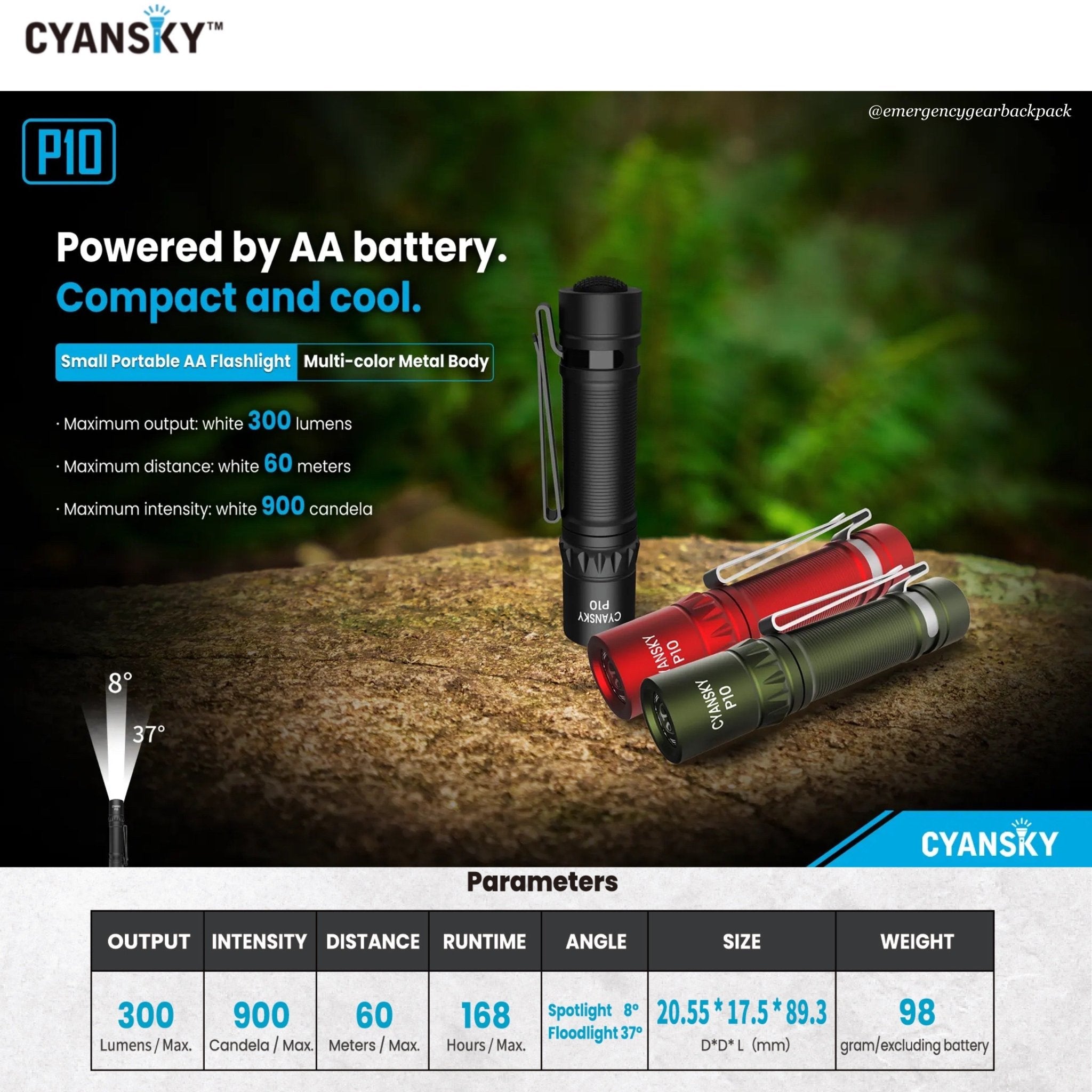Cyansky P10 ไฟฉายพกพาขนาดเล็ก ใช้หลอด OSRAM Duris P9 300LMS 6500K กระจายแสงแบบฟลัดไลท์ผ่าน TIR Lens ให้มุมแสงพุ่งที่ 8° มุมแสงกว้างที่ 37° เกลี่ยแสงได้สม่ำเสมอ ลำแสงเข้ม แสงพุ่งกว้างไกล 60 เมตร ให้ความสว่างเพียงพอต่อการใช้งาน กระจายแสงได้นิ่มนวลตาในโหมดไฟต่ำ ใช้อ่านหนังสือ หรือใช้งานในระยะใกล้ได้ดี
