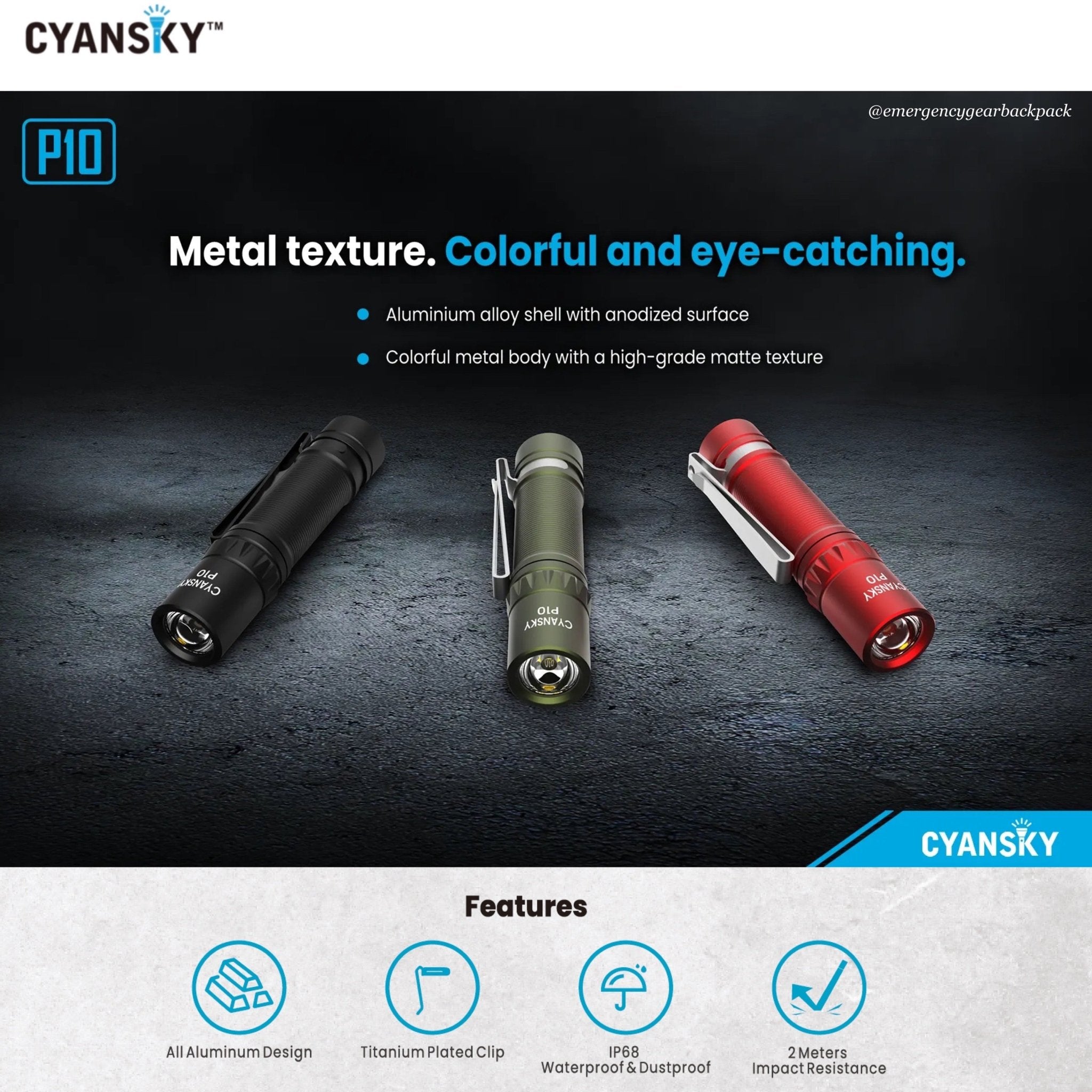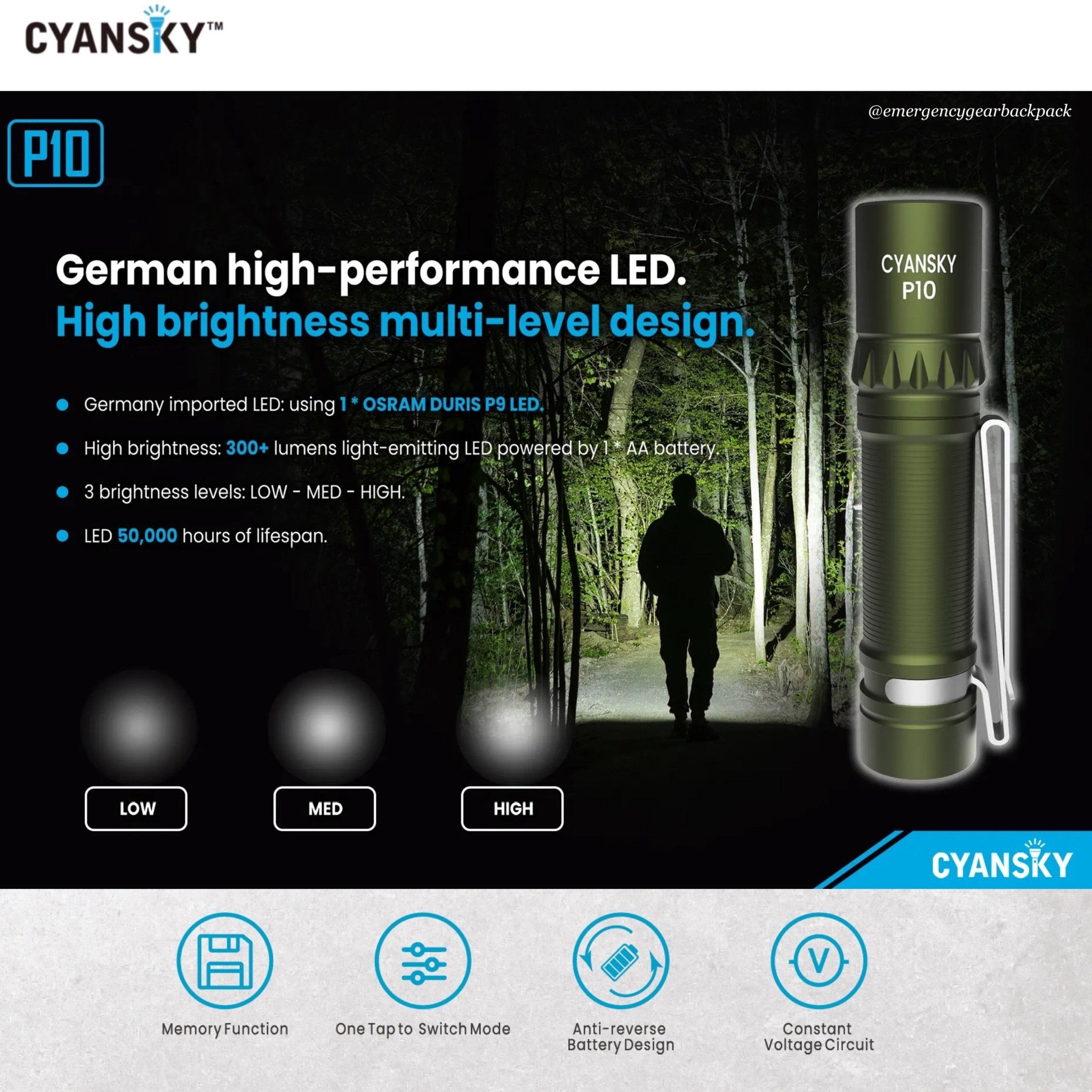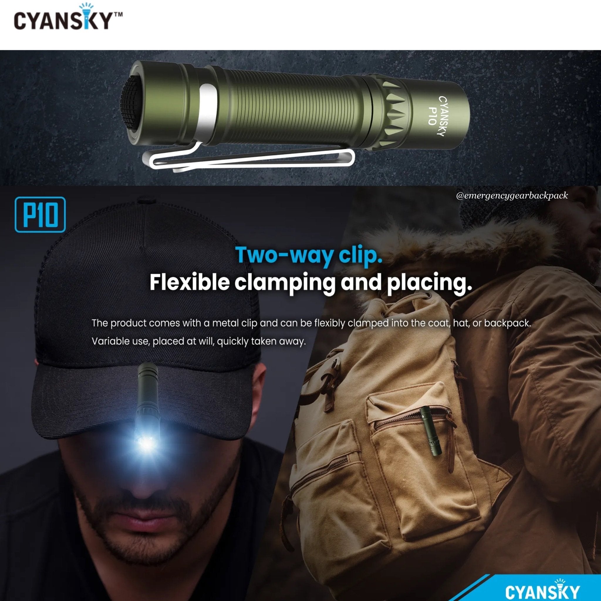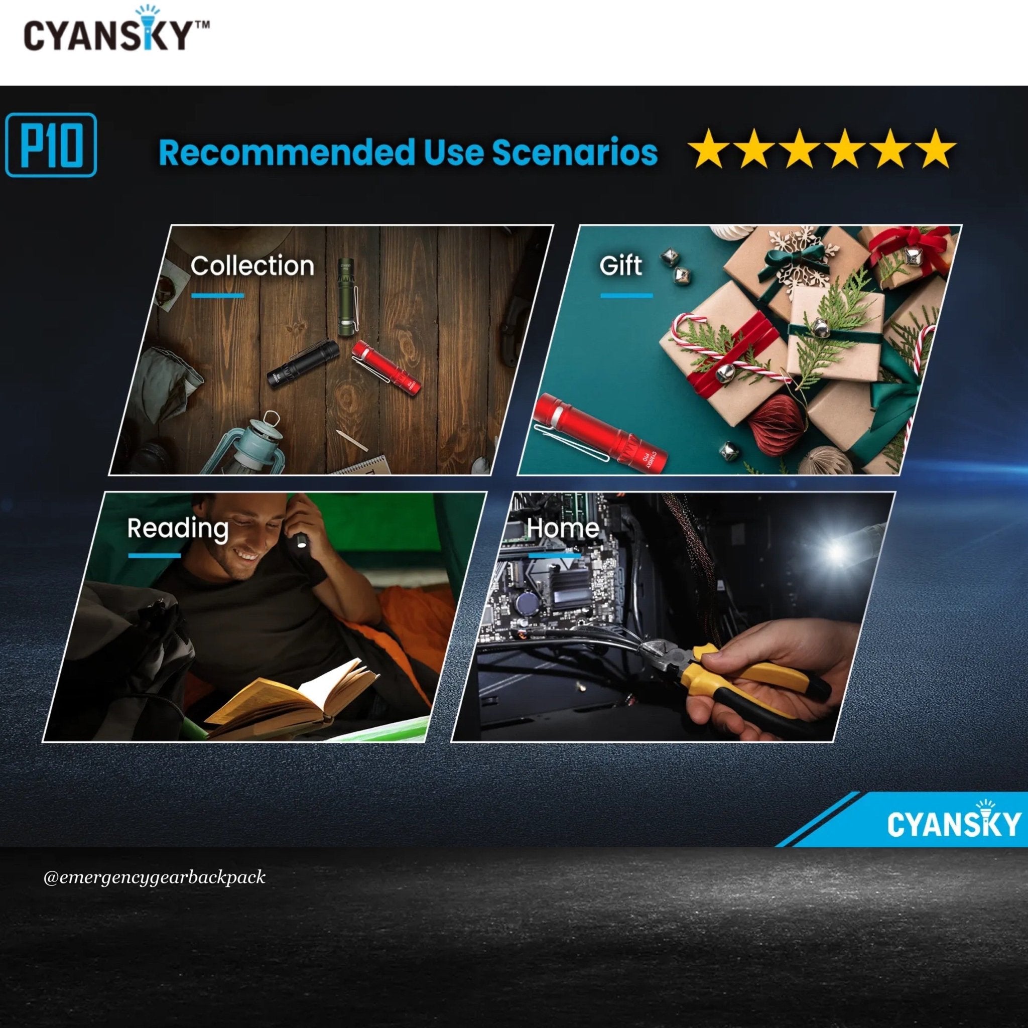 Cyansky P10 ไฟฉายพกพาขนาดเล็ก ใช้หลอด OSRAM Duris P9 300LMS 6500K กระจายแสงแบบฟลัดไลท์ผ่าน TIR Lens ให้มุมแสงพุ่งที่ 8° มุมแสงกว้างที่ 37° เกลี่ยแสงได้สม่ำเสมอ ลำแสงเข้ม แสงพุ่งกว้างไกล 60 เมตร ให้ความสว่างเพียงพอต่อการใช้งาน กระจายแสงได้นิ่มนวลตาในโหมดไฟต่ำ ใช้อ่านหนังสือ หรือใช้งานในระยะใกล้ได้ดี