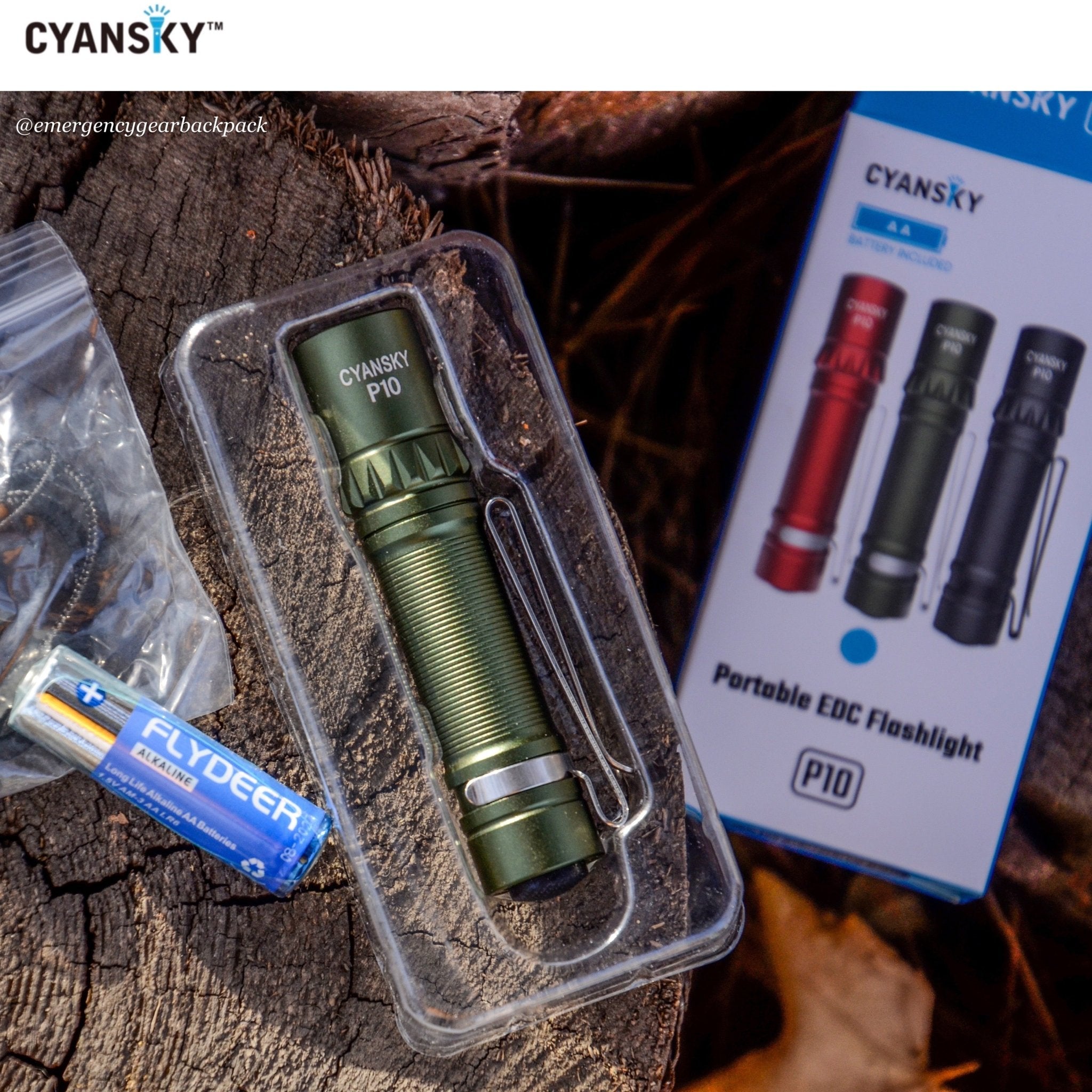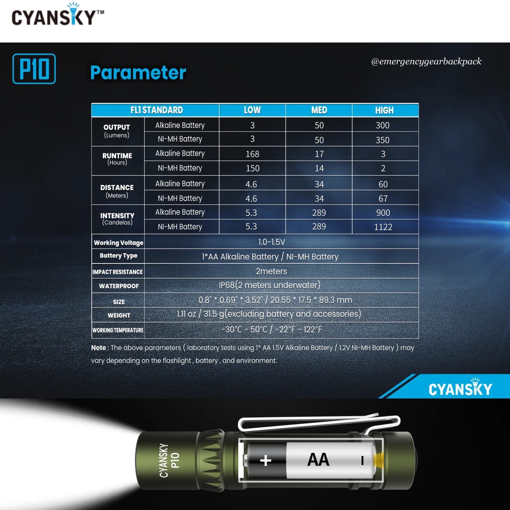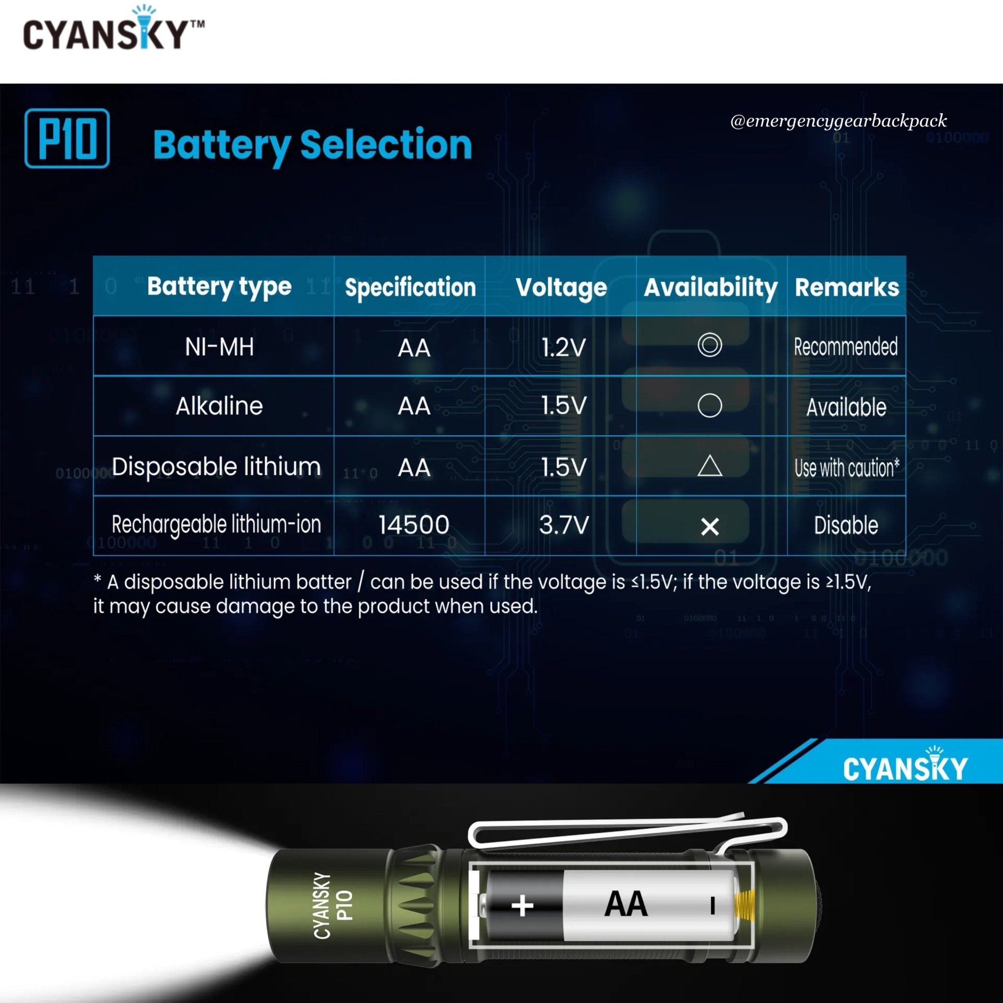 Cyansky P10 ออกแบบวงจรรองรับถ่านอัลคาไลน์ 1.5V ให้รันไทม์นานสุด 168 ชั่วโมง ในโหมดประหยัดไฟ สวิตช์ท้ายแบบ Forward click ปรับระดับแสงได้ 3 ระดับ และจำแสงสุดท้ายที่ใช้