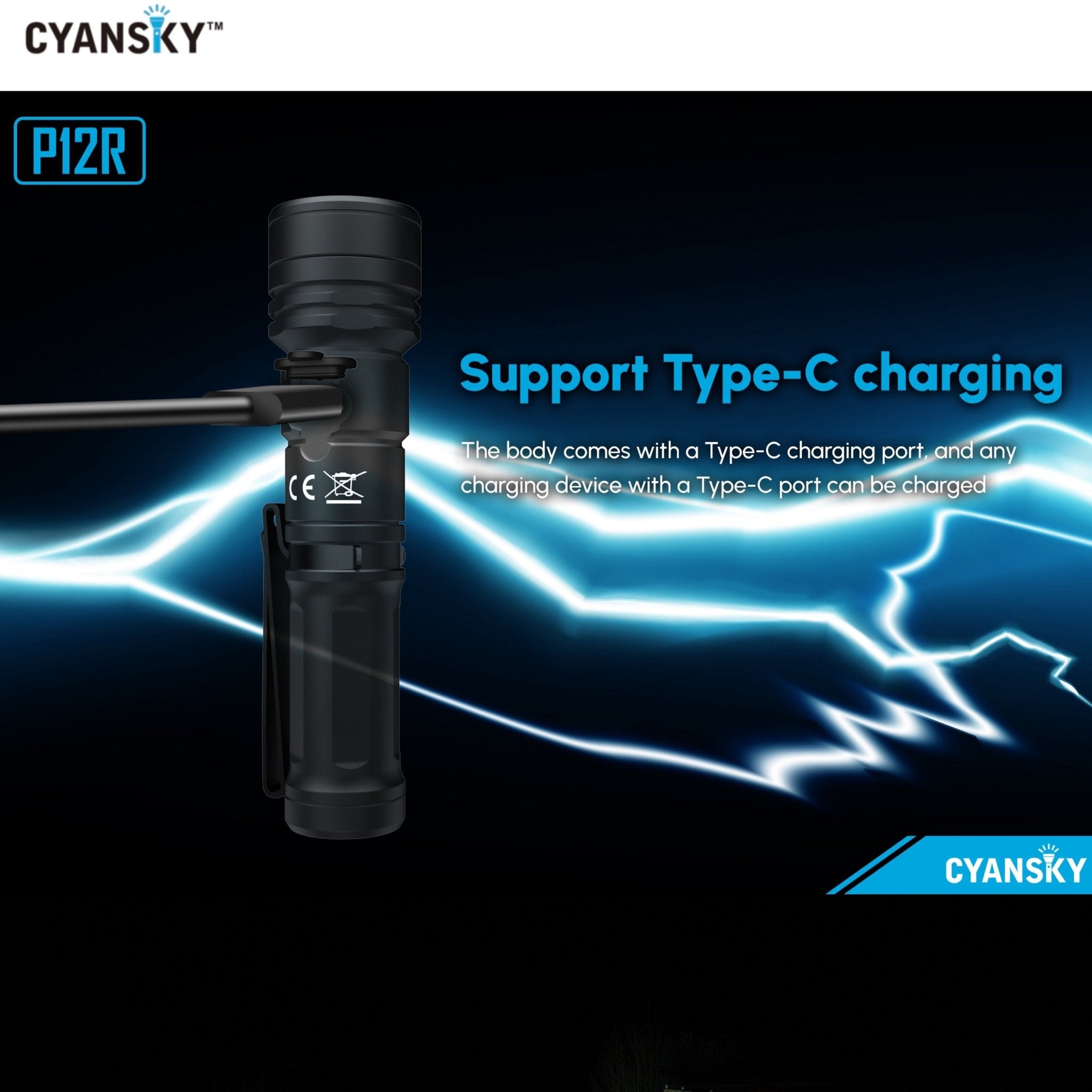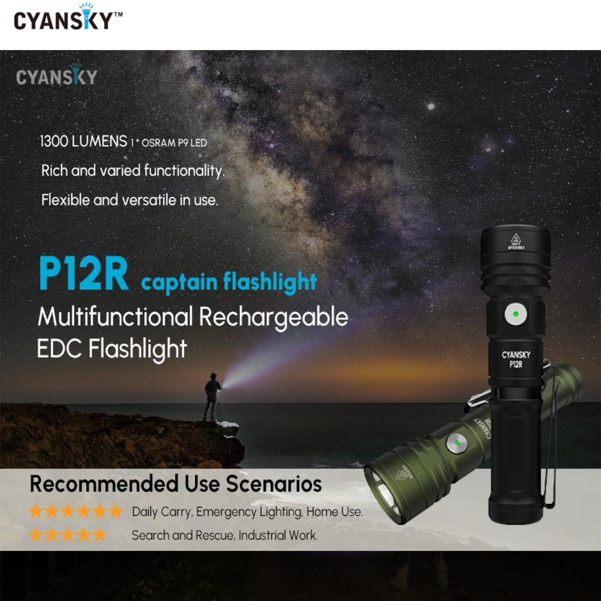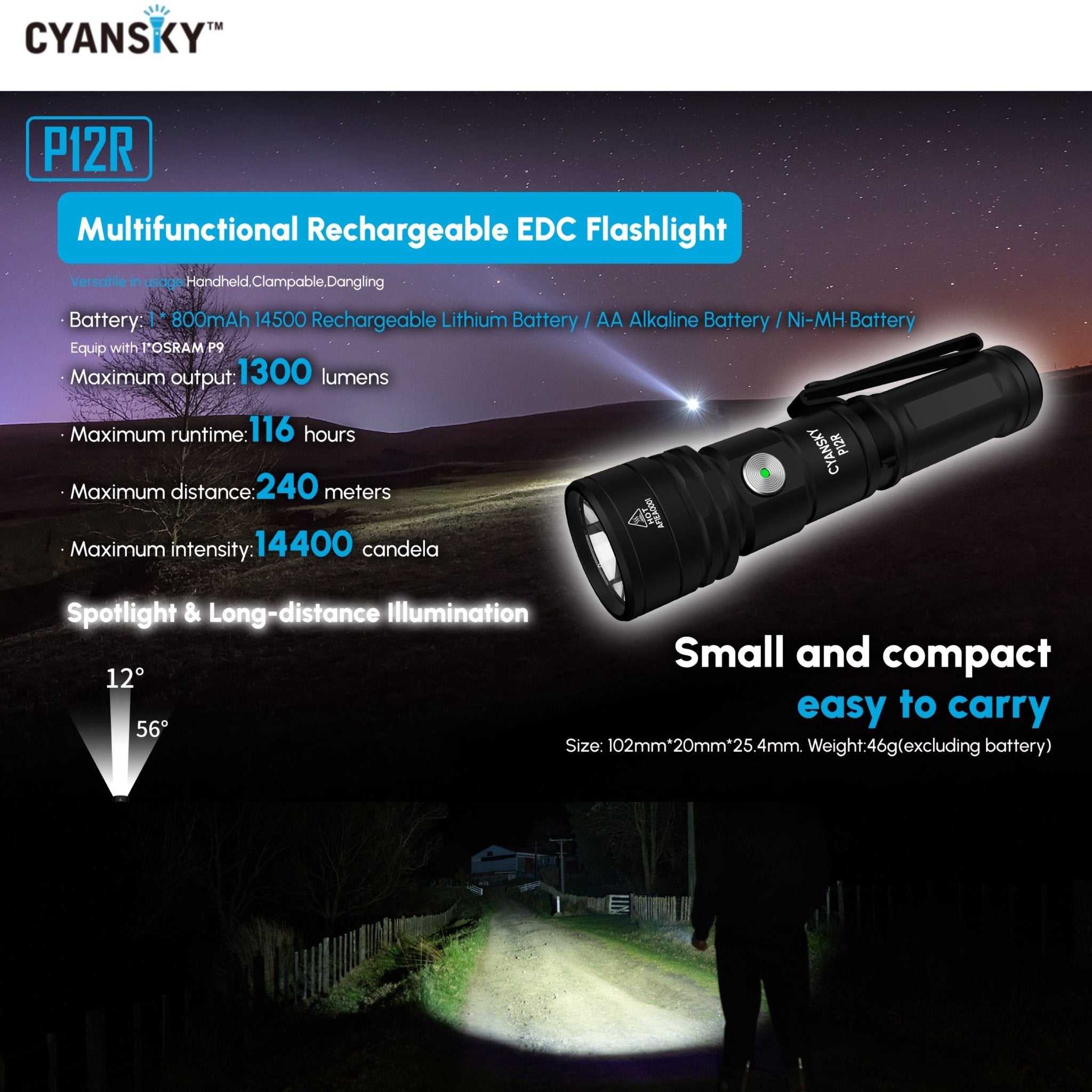 Cyansky P12R ไฟฉายพกพาประสิทธิภาพสูงขนาดเล็ก ใช้หลอด OSRAM P9 1300LMS 6500K แสงพุ่งไกล 240 เมตร ออกแบบให้มุมแสงพุ่งที่ 12° และมุมแสงกว้างที่ 56° ผสมผสานระหว่างไฟพุ่งกับไฟกว้างอย่างลงตัว