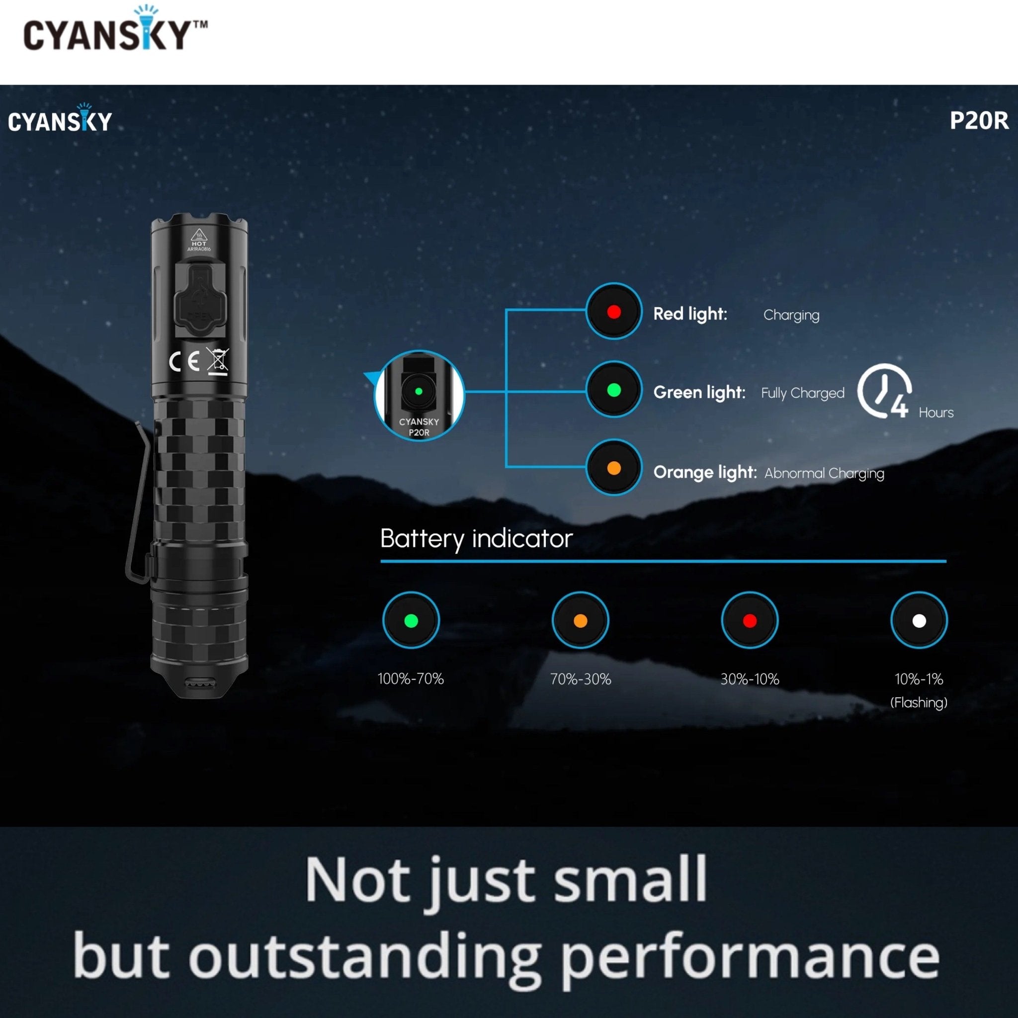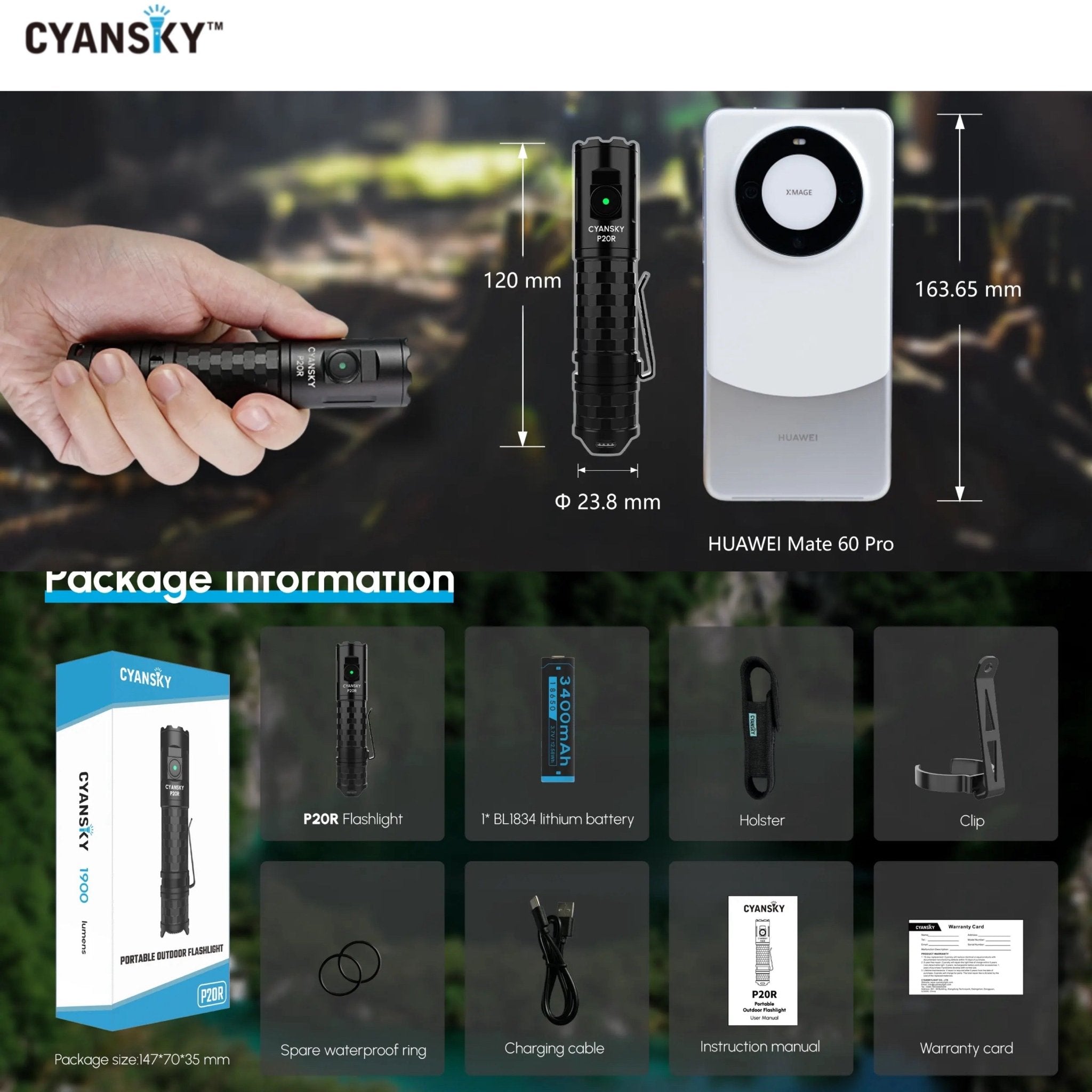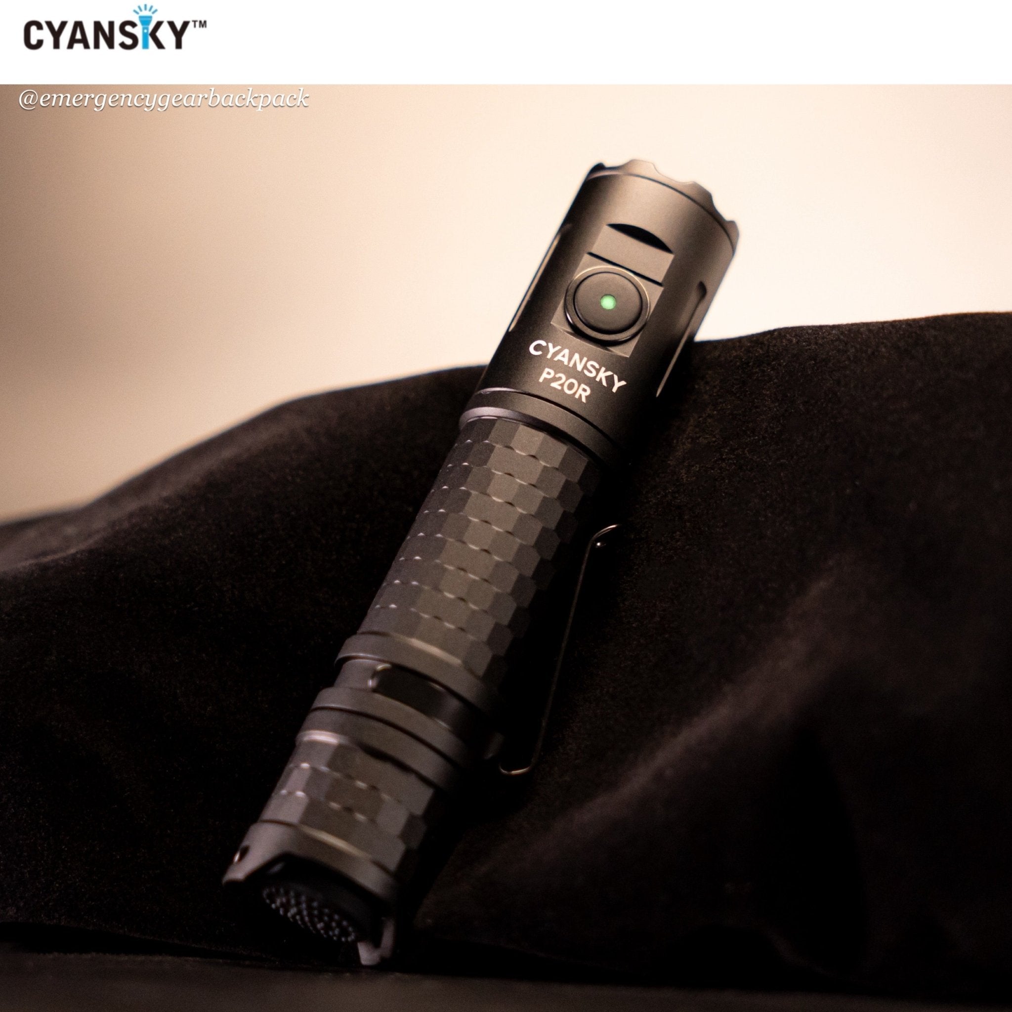 Cyansky P20R ไฟฉายขนาดคอมแพคใช้หลอด Luminus SST-40 LED 1900 Lumens อุณหภูมิสี 6500K โคมสะท้อนแสงอลูมิเนียมผิวเรียบ สะท้อนผิวส้มช่วยกระจายแสงในแนวกว้าง กระจายแสงแบบฟลัดไลท์ผ่าน TIR Lens ให้มุมแสงพุ่งที่ 24° มุมแสงกว้างที่ 44° สร้าง Hotspot ดวงกลมใหญ่ สปิลแสงวงกว้าง เกลี่ยแสงสม่ำเสมอ ลำแสงเข้ม ระยะส่องสว่างไกลสุด 210 เมตร