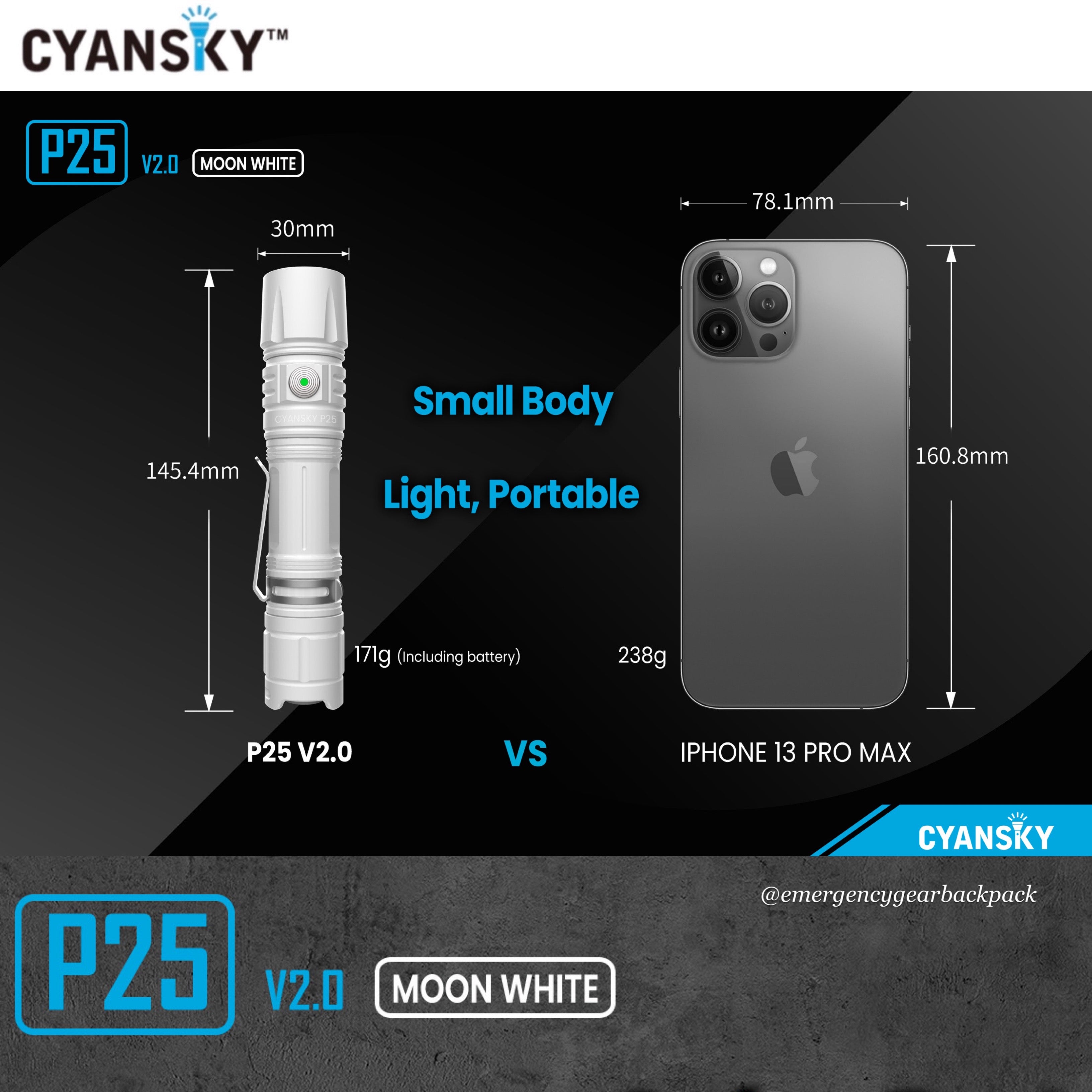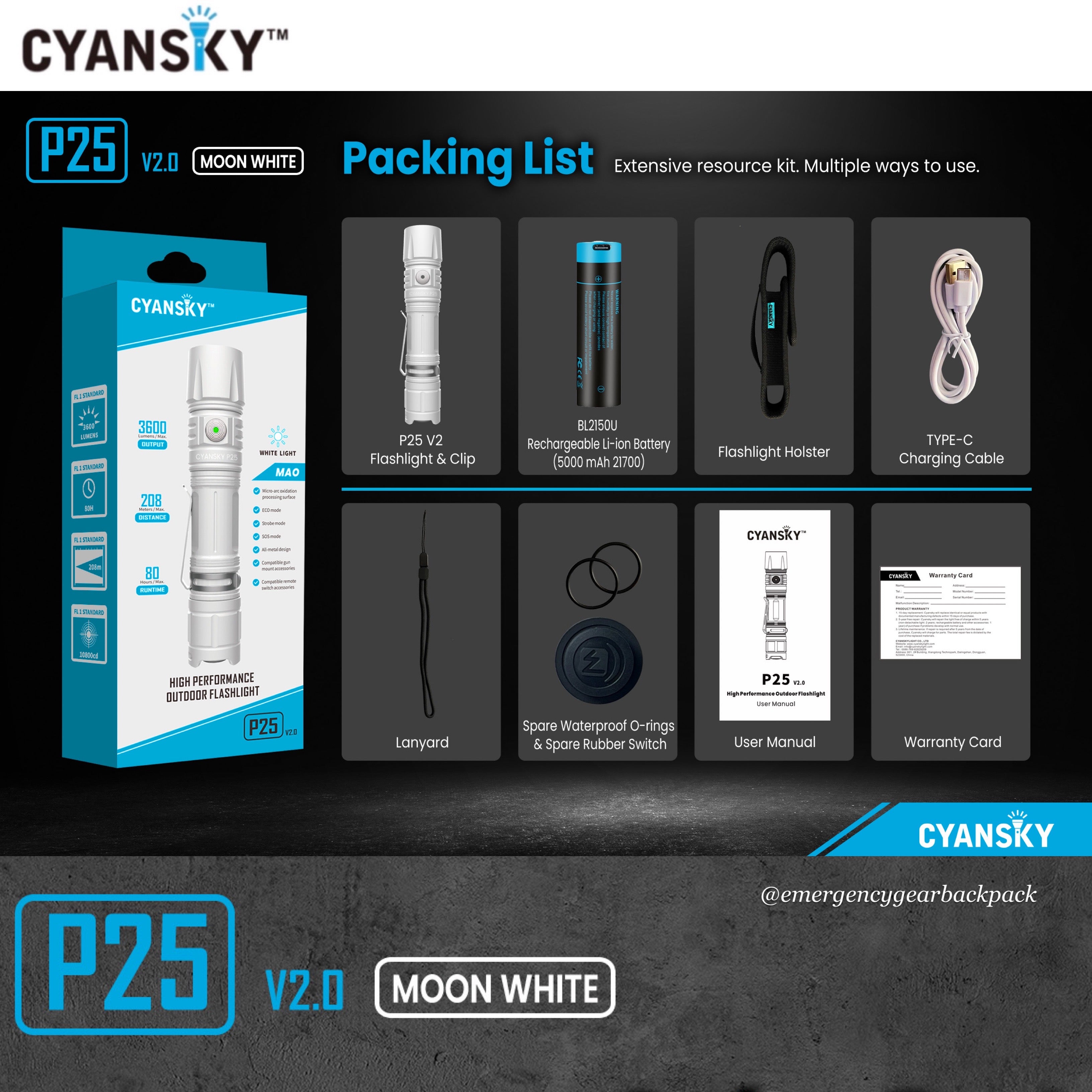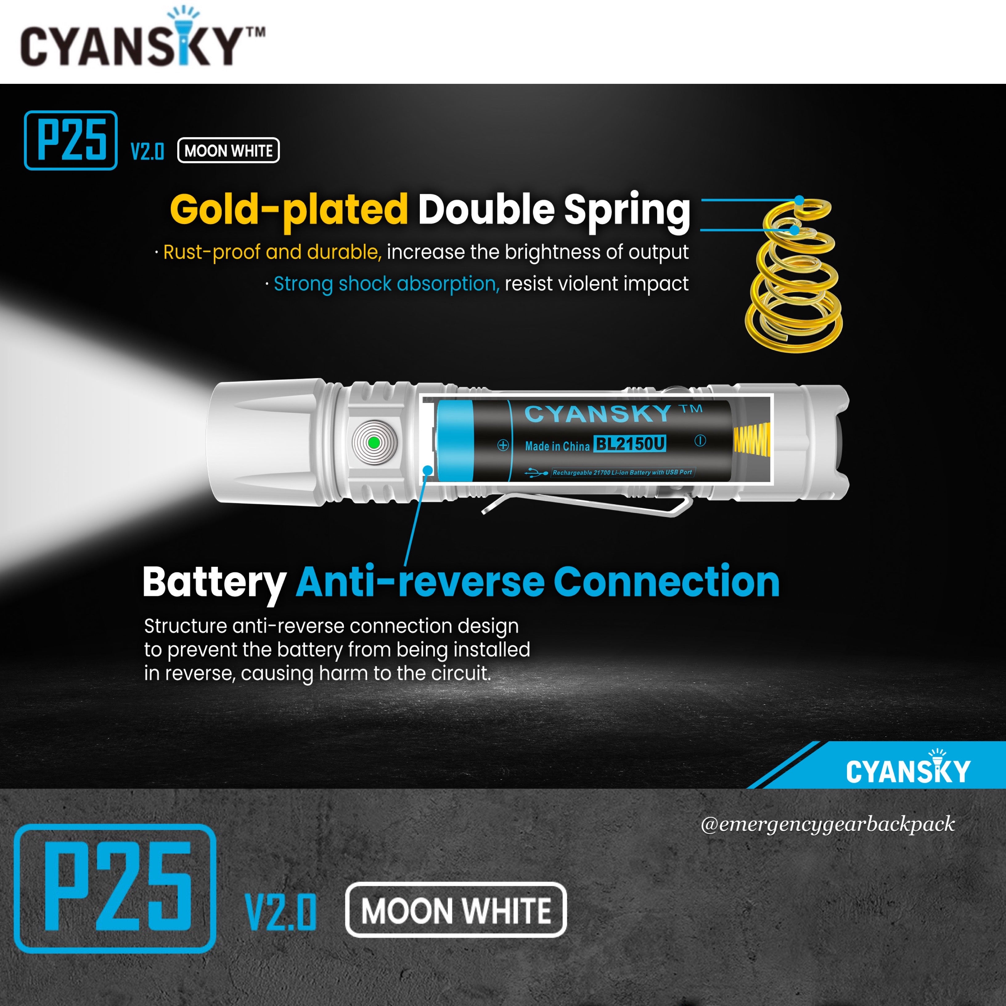 Cyansky P25 V2.0 ไฟฉายเกรดพรีเมียม ขนาดคอมแพคสี Moon White โครงสร้างหล่อขึ้นรูปด้วย Aluminum alloy 6061-T6 anodized aircraft เคลือบสีผิวชั้นนอกด้วยกระบวนการทางเคมี Micro-arc Oxidation Processing Surface สร้างชั้นเซรามิคเคลือบผิวให้สัมผัสที่ลื่นมือ มีความแข็งแรง ทนทานต่อการกัดกร่อน และทำความสะอาดได้ง่าย