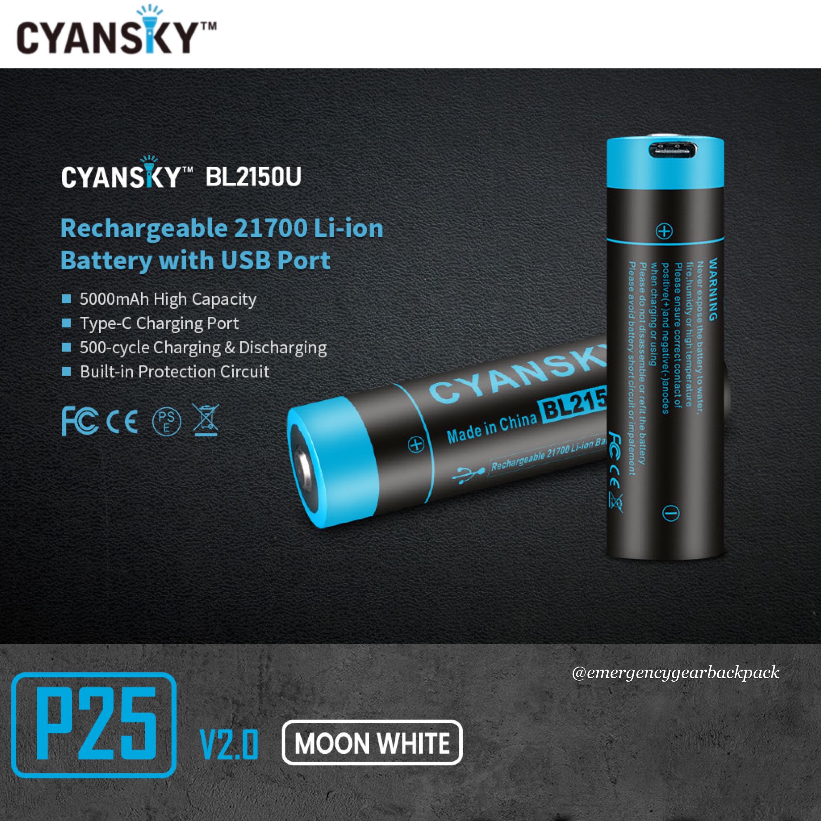 ชุดอุปกรณ์มาพร้อมแบตเตอรี่ Cyansky BL2150U 21700 5000mAh 3.6V 18Wh 8A ชาร์จไฟผ่านพอร์ตUSB-C ที่ขั้วบวกของแบตเตอรี่ ที่กระแสไฟ 2A