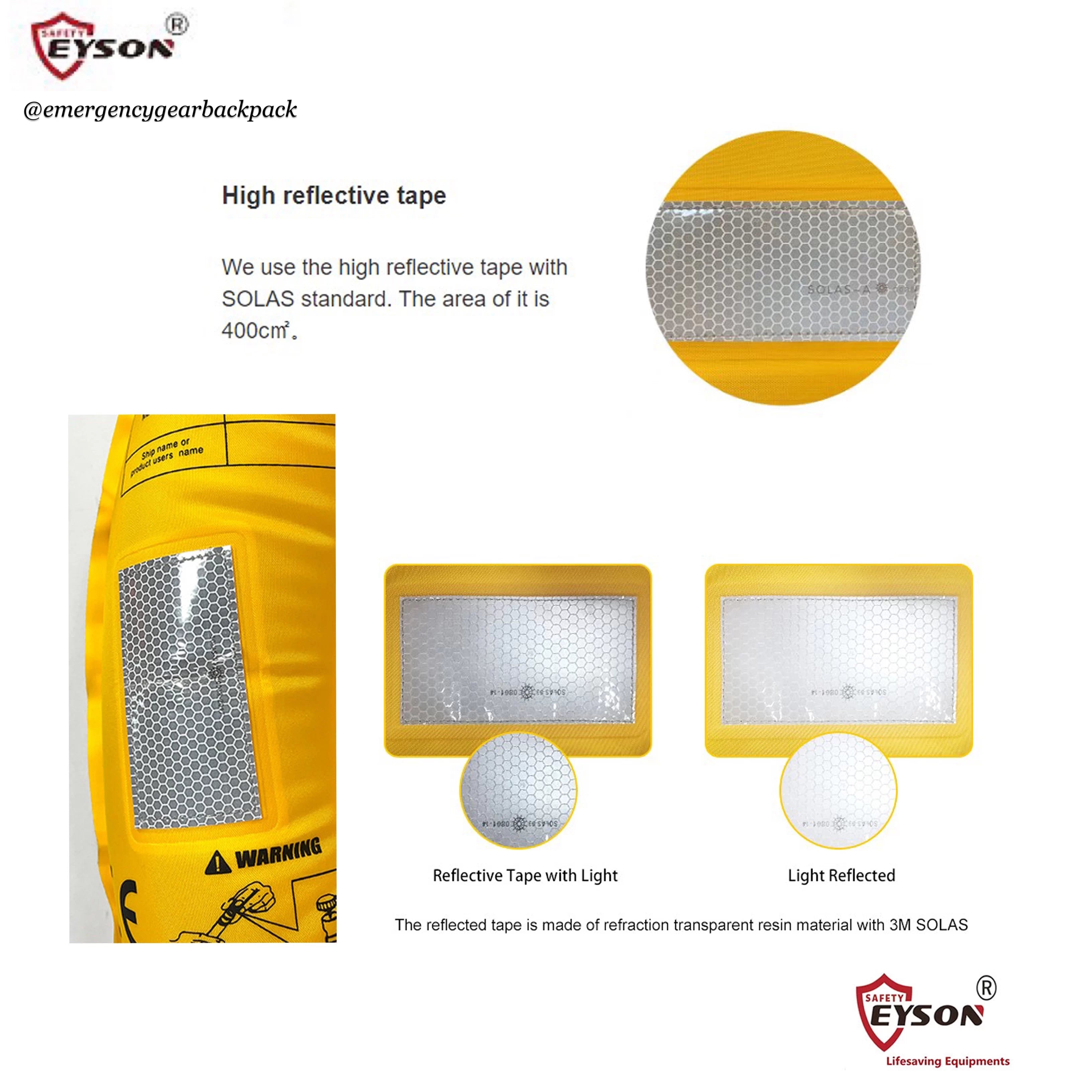 การมองเห็นสูง: ติดตั้งแผ่นสะท้อนแสง 3M SOLAS Approved Reflector ขนาด 5 x 10cms 2 จุด และมีแถบสะท้อนแสงเย็บติดขอบเสื้อรอบตัว ช่วยให้มองเห็นได้ง่ายในที่มืด เพิ่มความปลอดภัยในการกู้ภัย