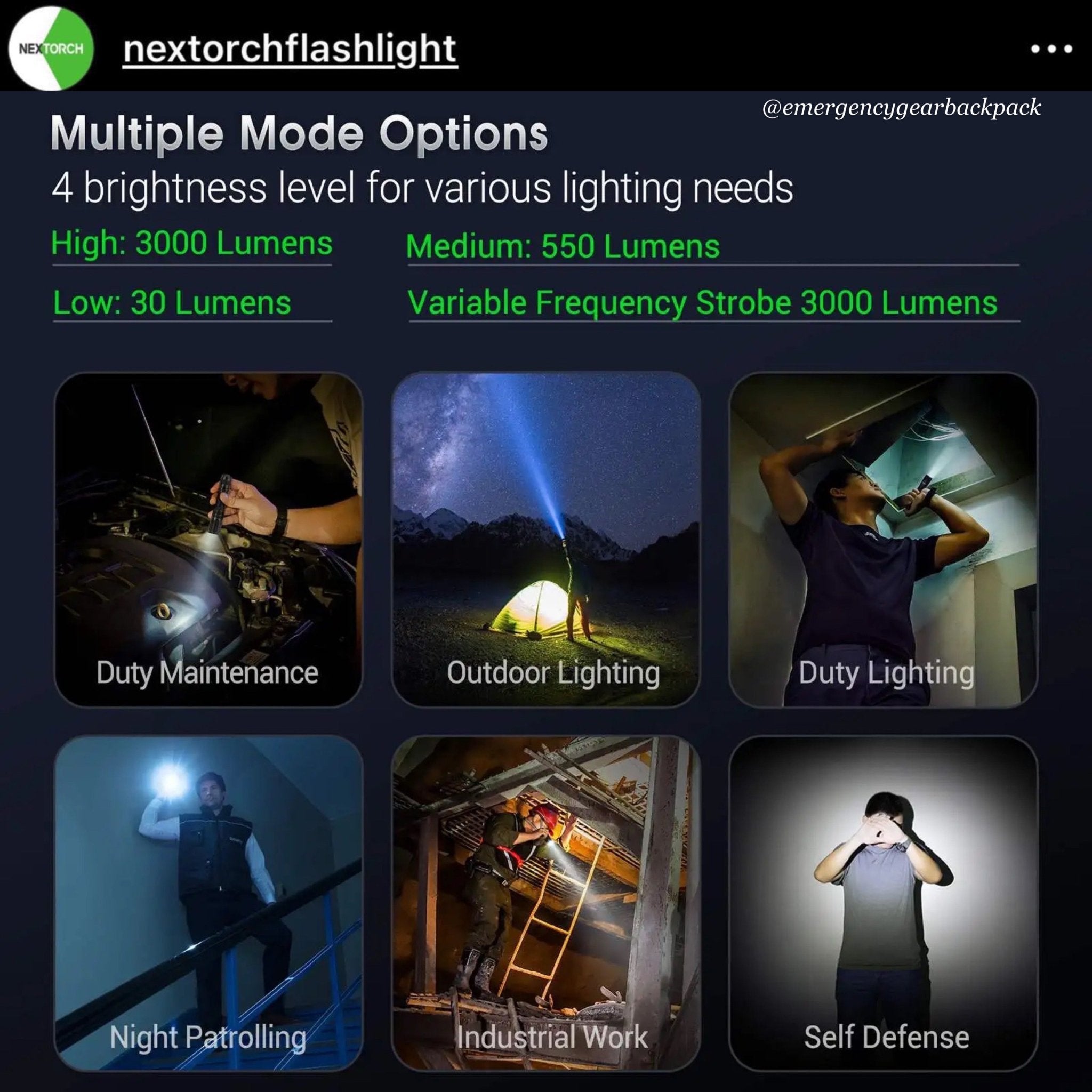 ไฟฉายได้รับการออกแบบโหมดแสงที่เหมาะสำหรับกิจกรรมกลางแจ้ง หรือใช้งานทั่วไป ไฟฉายจะเริ่มทำงานที่โหมด High 3000LMS และปรับระดับแสงลงมาที่ Med 550LMS ซึ่งเป็นระดับแสงที่เพียงพอต่อการใช้งานทั่วไป