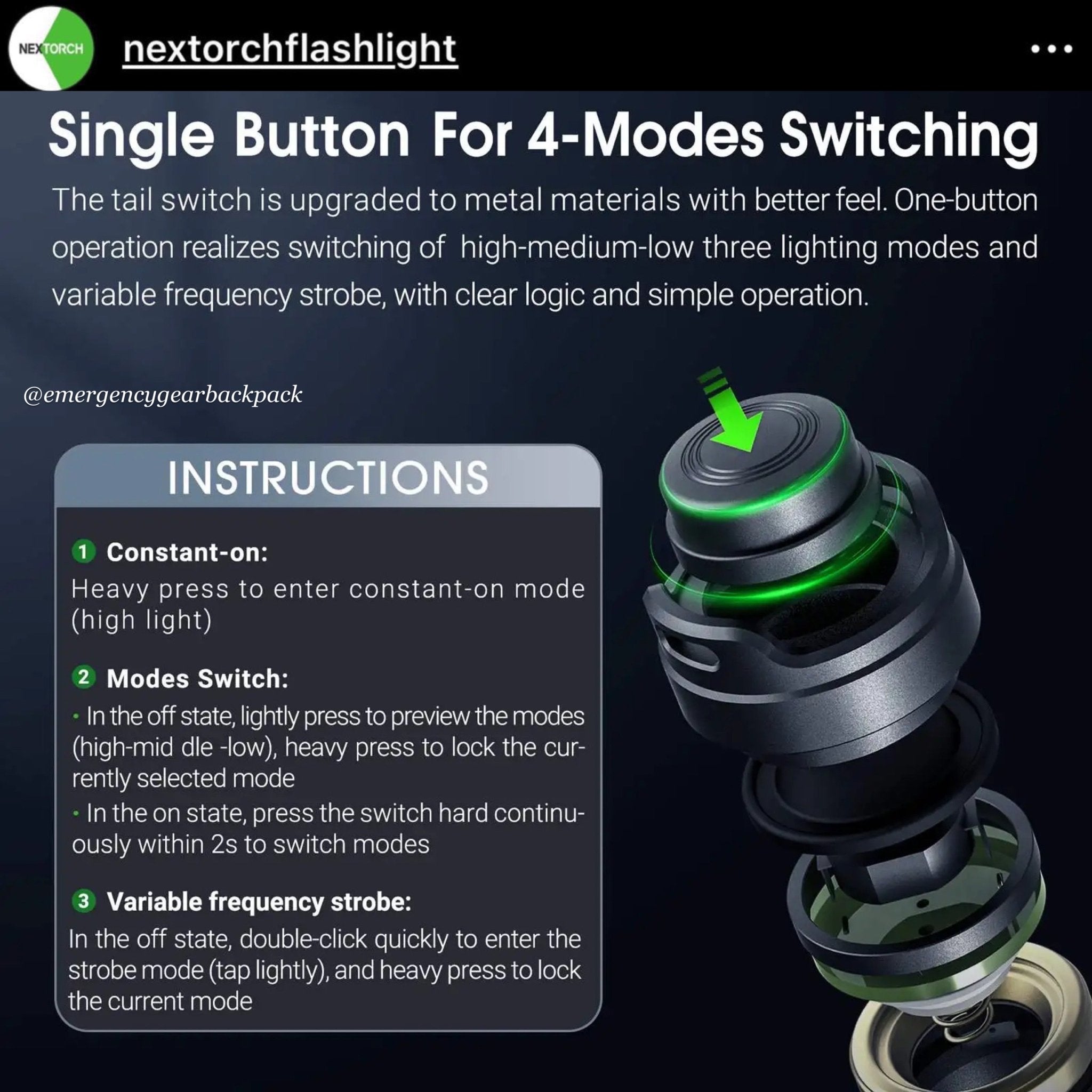 Forward click metal tail switch: สวิตช์ท้ายแบบแตะติดปล่อยดับ ใช้เปิดปิดไฟฉาย และเปลี่ยนโหมดแสง ปุ่มกดสวิตช์ท้ายทำจากโลหะที่มีความแข็งแรงและทนทานให้สัมผัสในการกดได้ดี ตอบสนองการใช้งานอย่างรวดเร็ว ปรับการใช้งานได้ 3 โหมด Low-Med-High และไฟกะพริบ 1 โหมด
