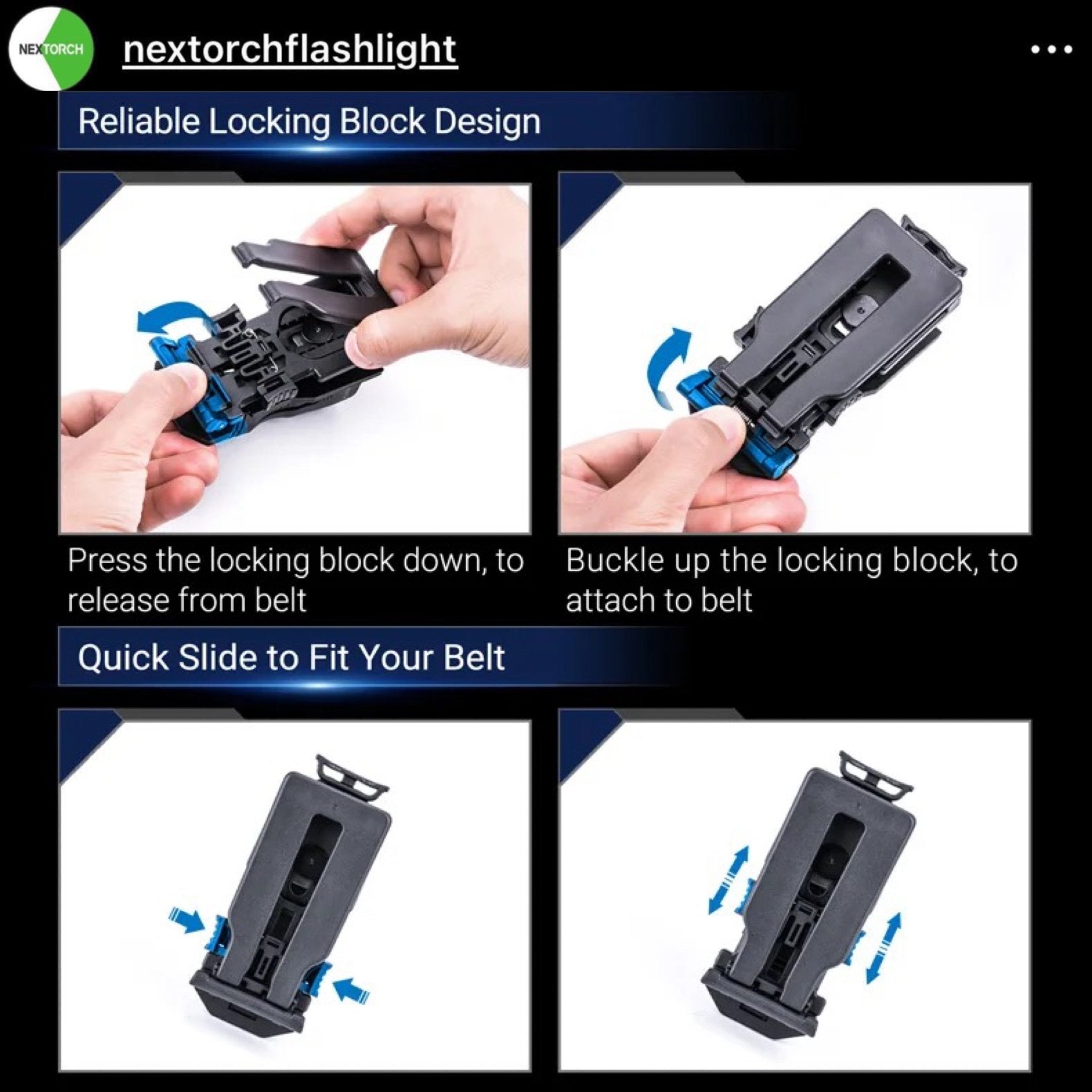 Holster Body: ใช้ใส่ไฟฉายและประกบล็อคเข้ากับ Belt Clamp สามารถถอดออกได้อย่างรวดเร็วโดยดันสลักล็อคไปด้านหน้า Holster Body หมุนรอบตัวได้ 360° ปรับล็อคองศาได้ 16 ตำแหน่ง รองรับไฟฉายที่มีเส้นผ่านศูนย์กลางส่วนหัวและลำตัว 27-30mm