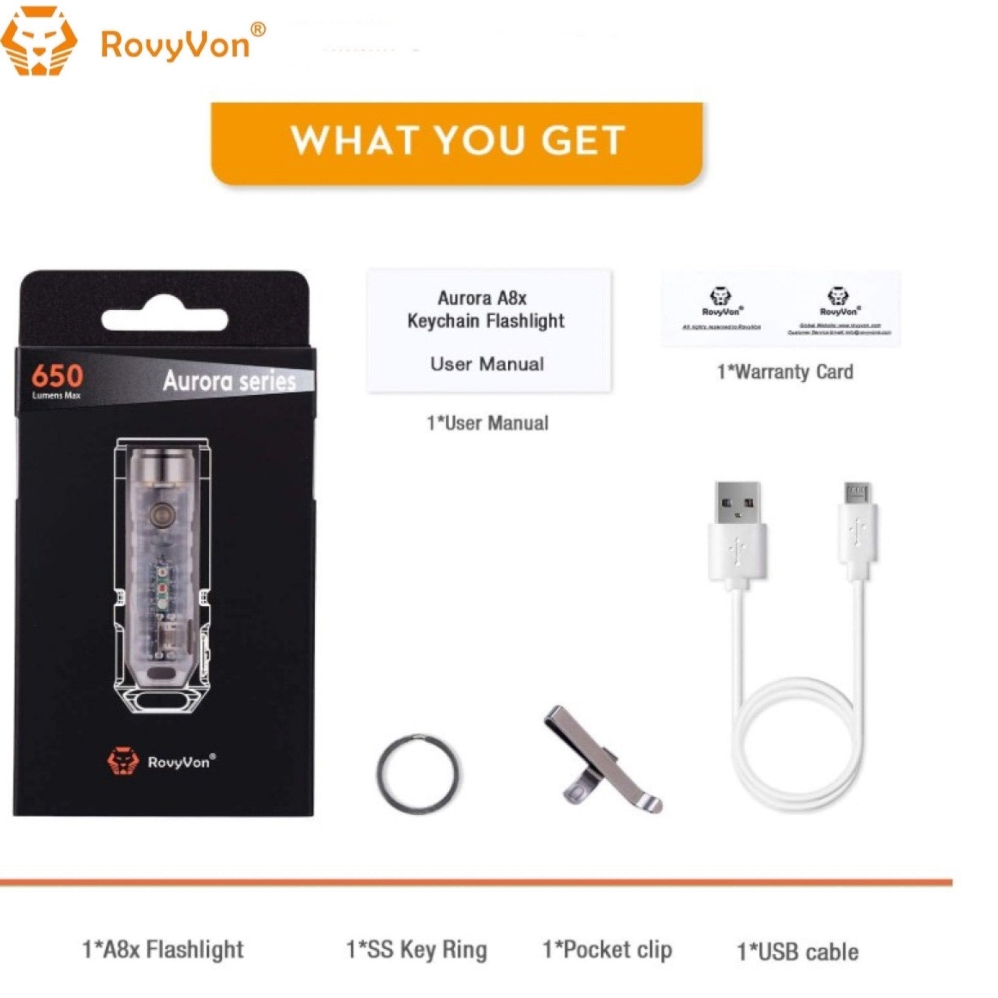 Aurora A8x ใช้แบตเตอรี่ Lithium polymer 330mAh ชาร์จไฟในตัวผ่านพอร์ต Micro USB รันไทม์ได้นานสุด 66 ชั่วโมง ในโหมดประหยัดไฟ อุปกรณ์มาพร้อมคลิปสแตนเลสติดสลับข้างได้ เพิ่มความสะดวกในการใช้งาน เหมาะสำหรับพกพาใช้งานแบบ Every Day Carry