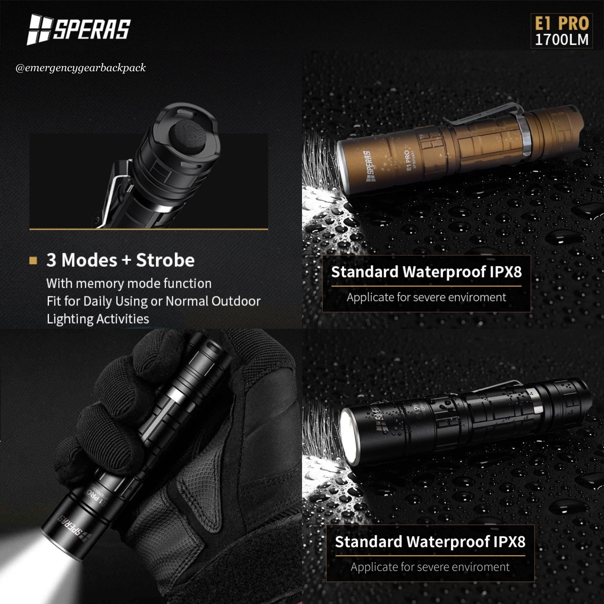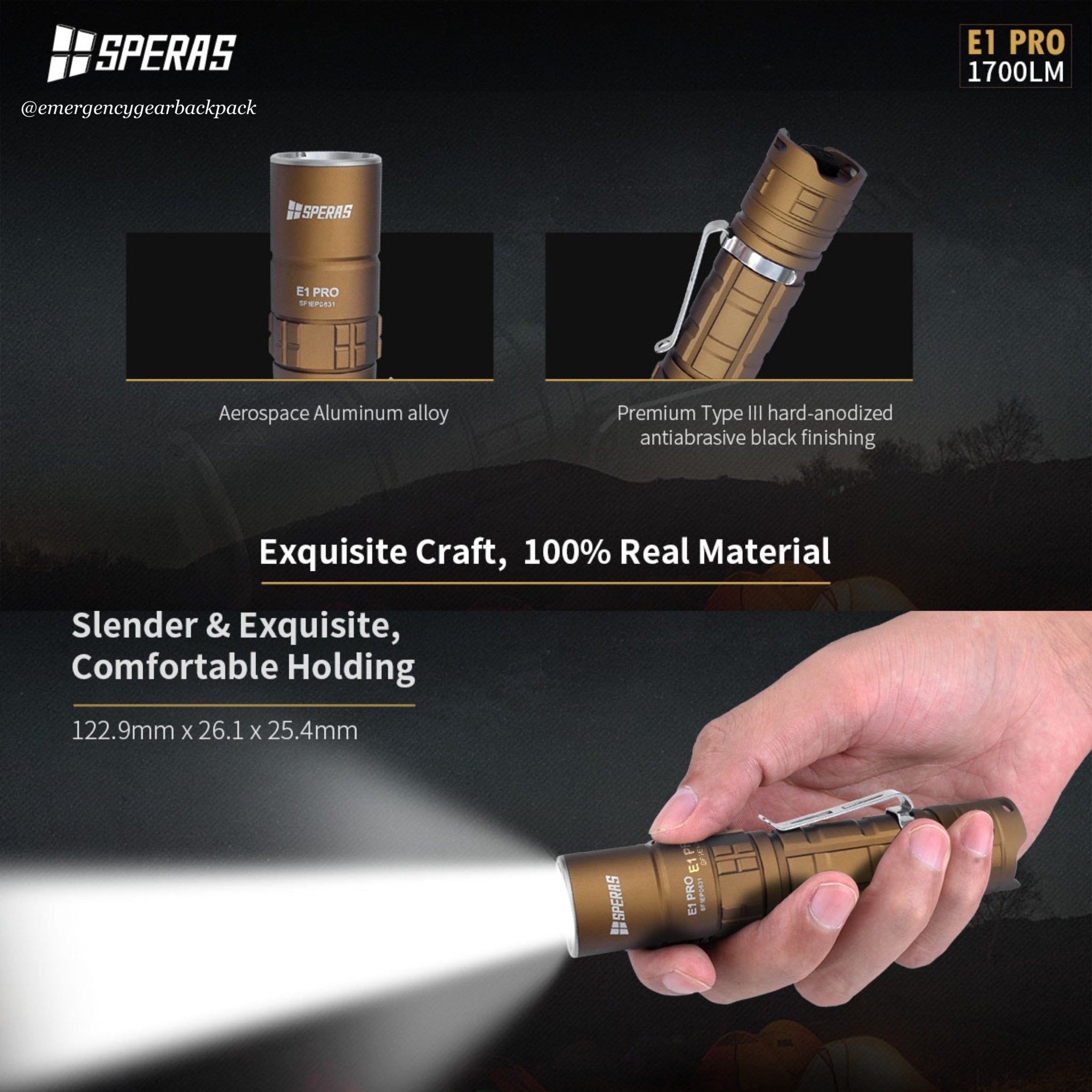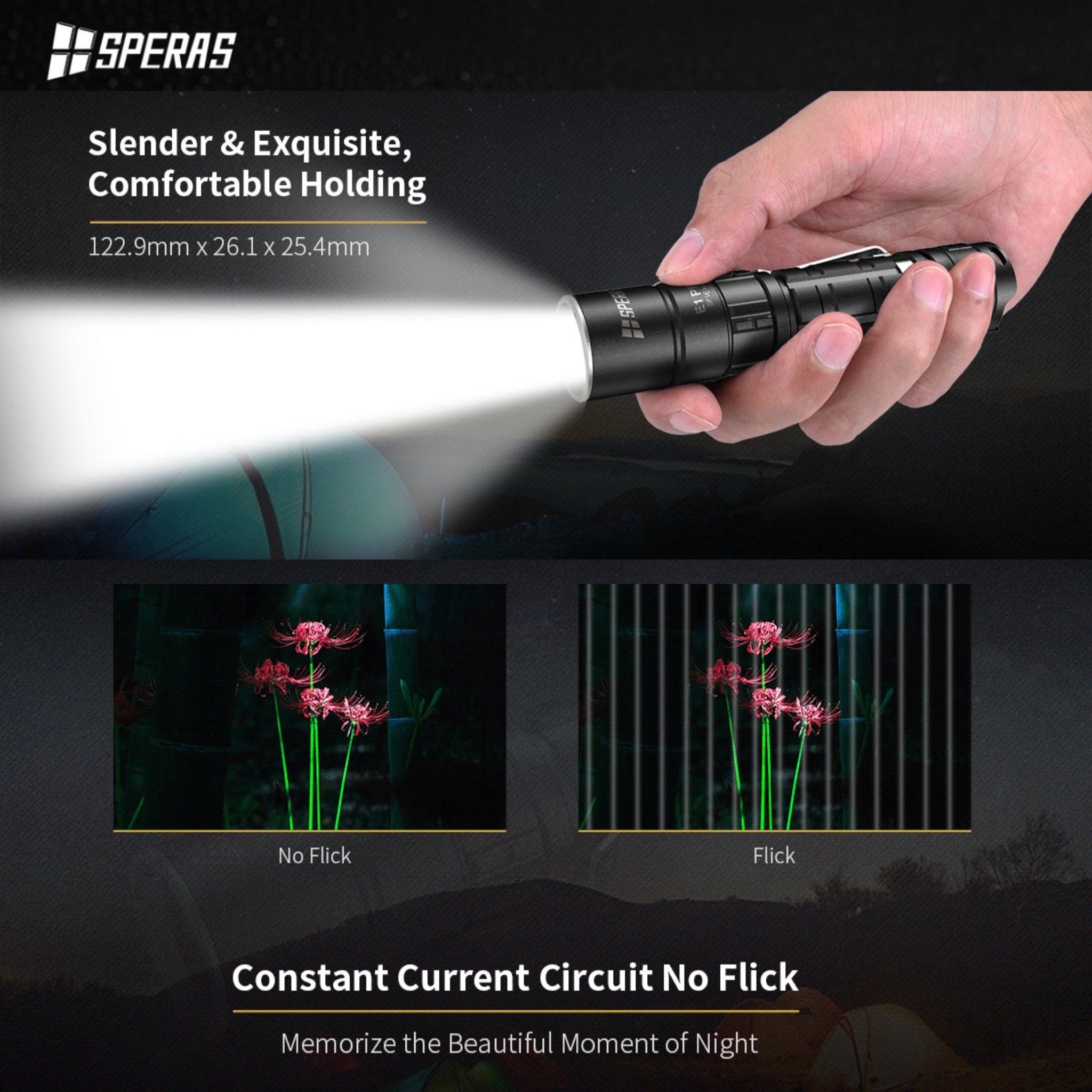 ไฟฉายขนาดคอมแพ็คประสิทธิภาพสูงจาก SPERAS ออกแบบสำหรับการใช้งานทั่วไป และเชิงยุทธวิธี รองรับการทำงานในทุกสภาพแวดล้อม ลำแสงพุ่งแรงถึง 284 เมตร ด้วยหลอด LUMINUS SST40 1700 ลูเมน ให้แสงสีขาว 6500 เคลวิน สวิตช์ท้ายแบบ Forward Click ควบคุมได้ทุกโหมดด้วยมือเดียว ตอบสนองไว เหมาะสำหรับ EDC งานภาคสนาม และ เจ้าหน้าที่ First Responder