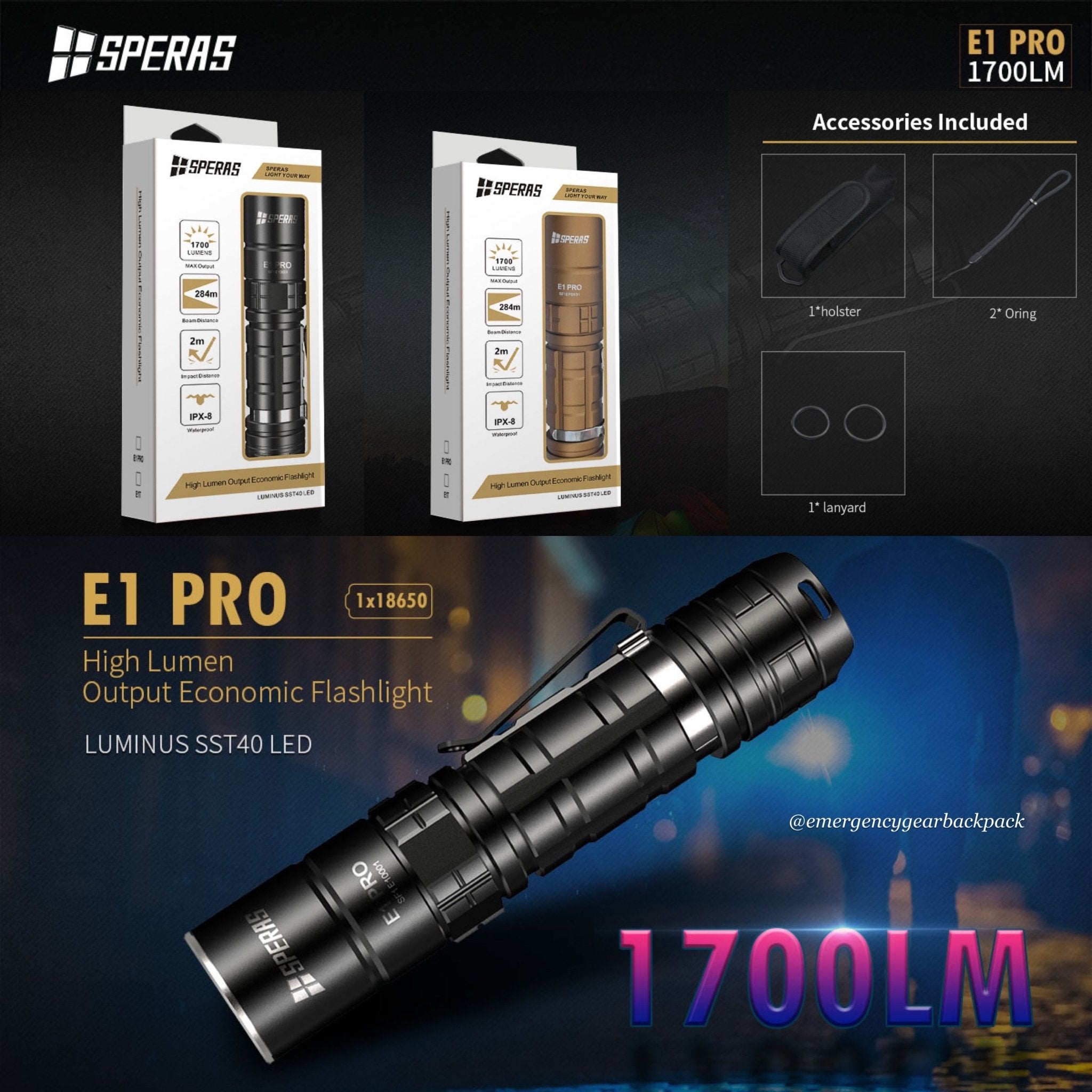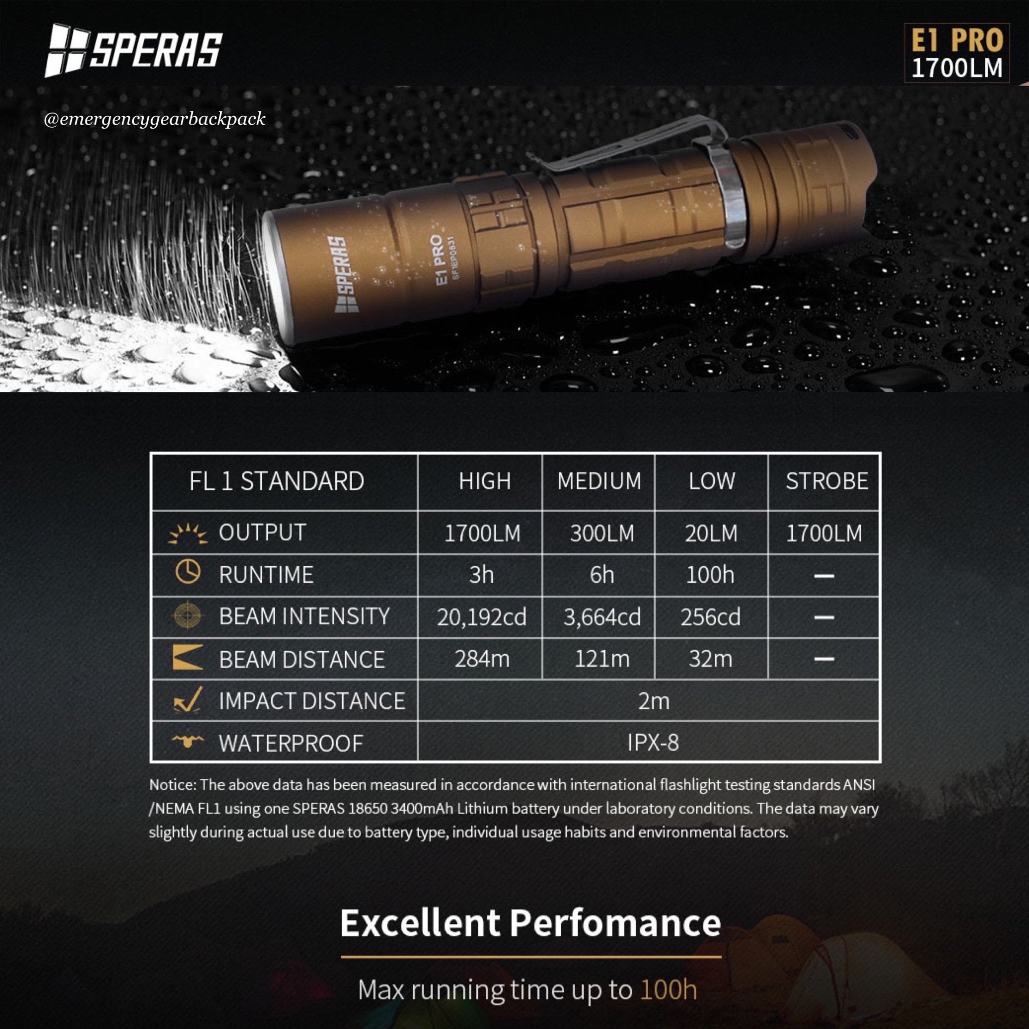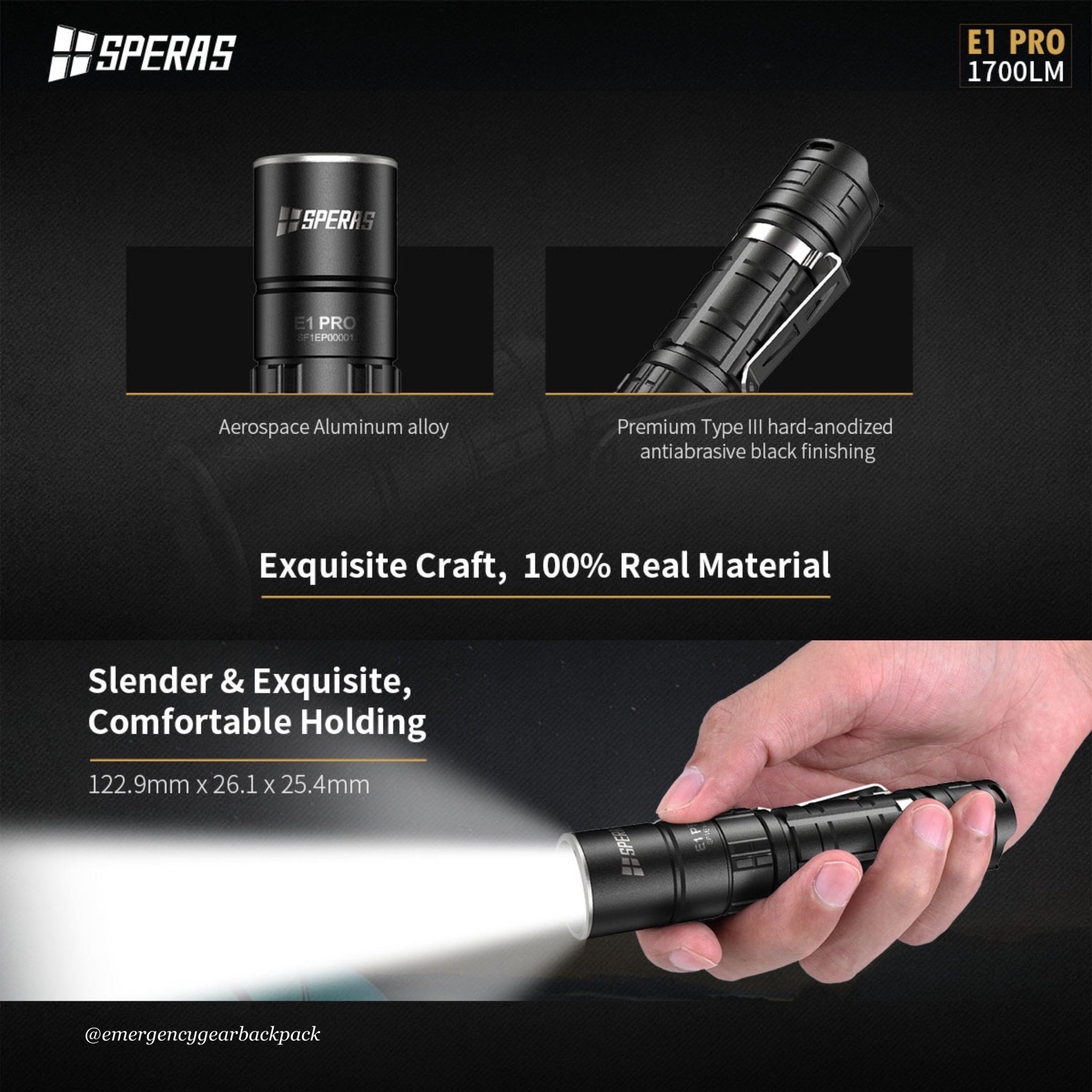 ไฟฉายขนาดคอมแพ็คประสิทธิภาพสูงจาก SPERAS ออกแบบสำหรับการใช้งานทั่วไป และเชิงยุทธวิธี รองรับการทำงานในทุกสภาพแวดล้อม ลำแสงพุ่งแรงถึง 284 เมตร ด้วยหลอด LUMINUS SST40 1700 ลูเมน ให้แสงสีขาว 6500 เคลวิน สวิตช์ท้ายแบบ Forward Click ควบคุมได้ทุกโหมดด้วยมือเดียว ตอบสนองไว เหมาะสำหรับ EDC งานภาคสนาม และ เจ้าหน้าที่ First Responder