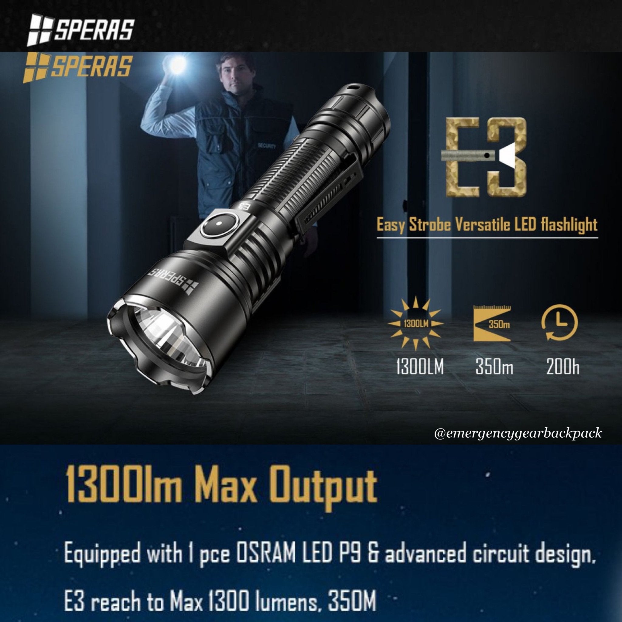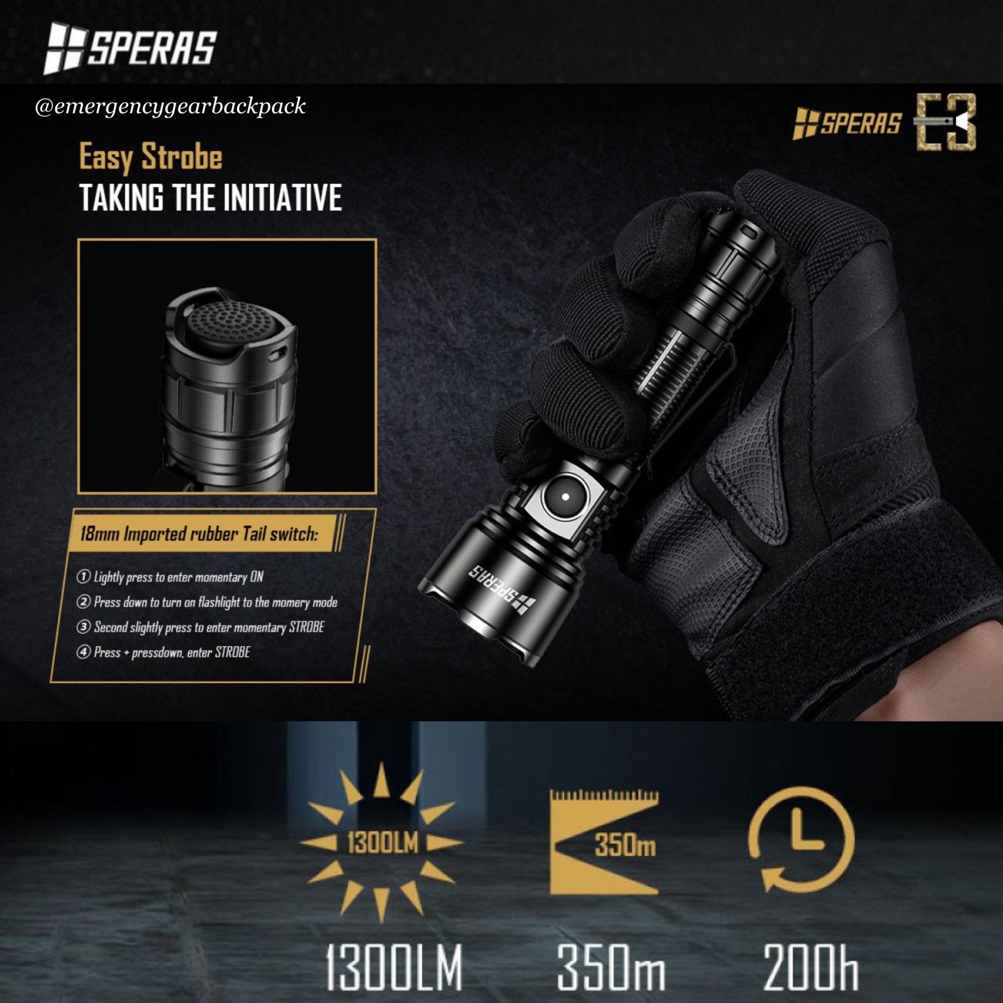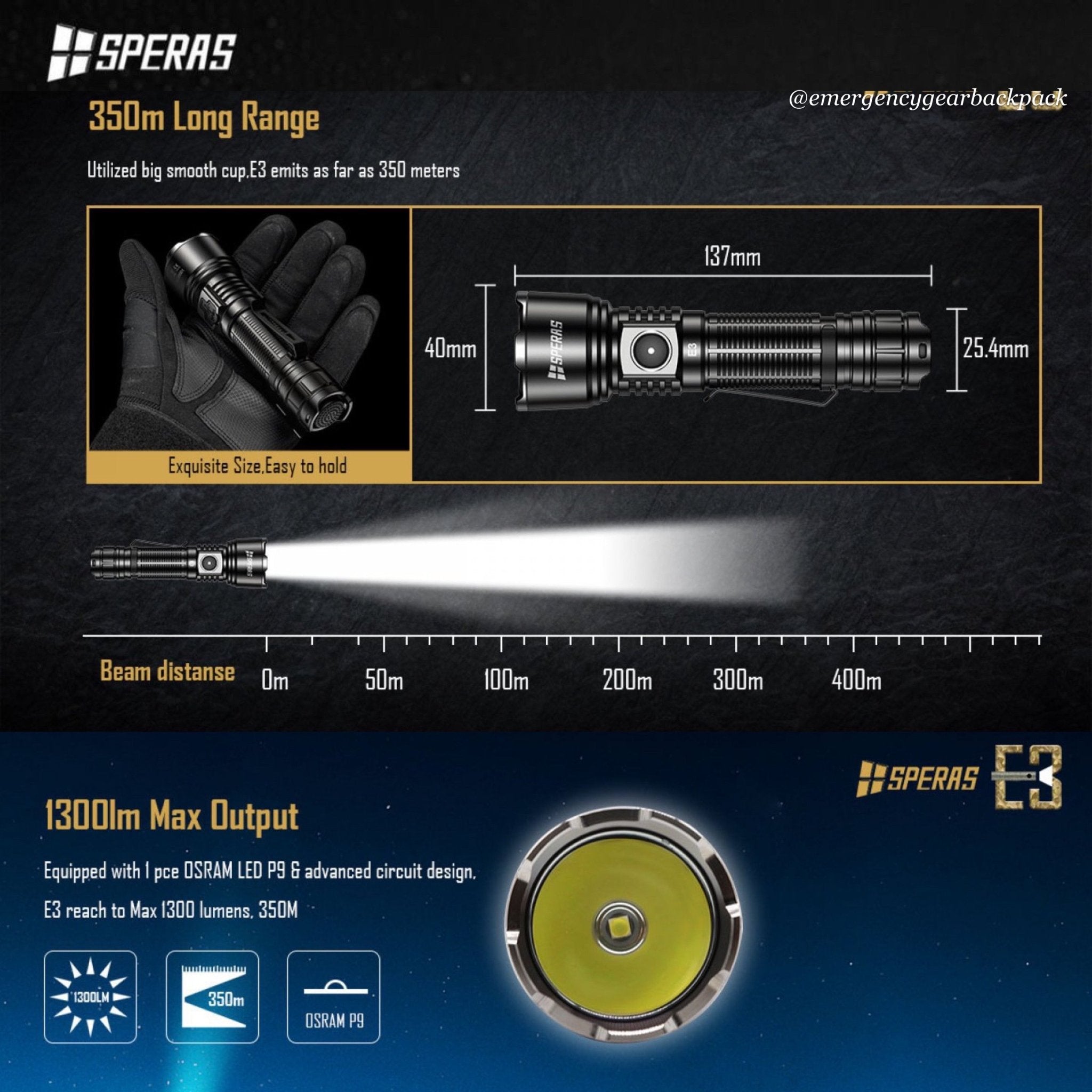 ไฟฉายขนาดคอมแพ็คประสิทธิภาพสูงจาก SPERAS ออกแบบให้ใช้งานได้ยาวนาน ความร้อนต่ำ ให้ลำแสงสว่างพุ่งแรงถึง 350 เมตร ด้วยหลอด OSRAM P9 1300 ลูเมน 6500 เคลวิน พร้อมโคมสะท้อนแสงอลูมิเนียมผิวเรียบและลึก ให้ Spill กว้าง Hotspot ดวงใหญ่ เหมาะสำหรับการใช้งานภาคสนาม ภารกิจยุทธวิธี หรือกิจกรรม Outdoor ทุกประเภท