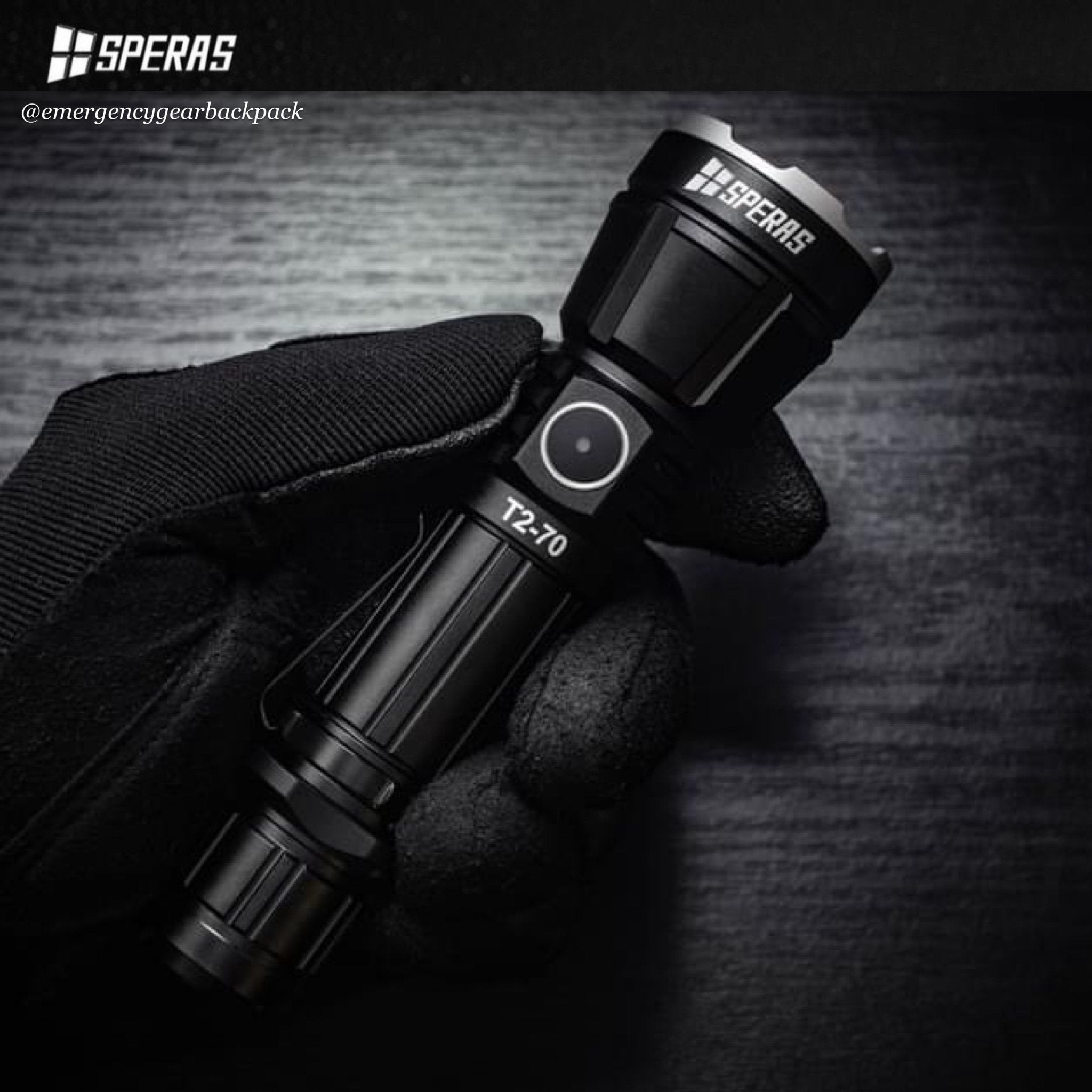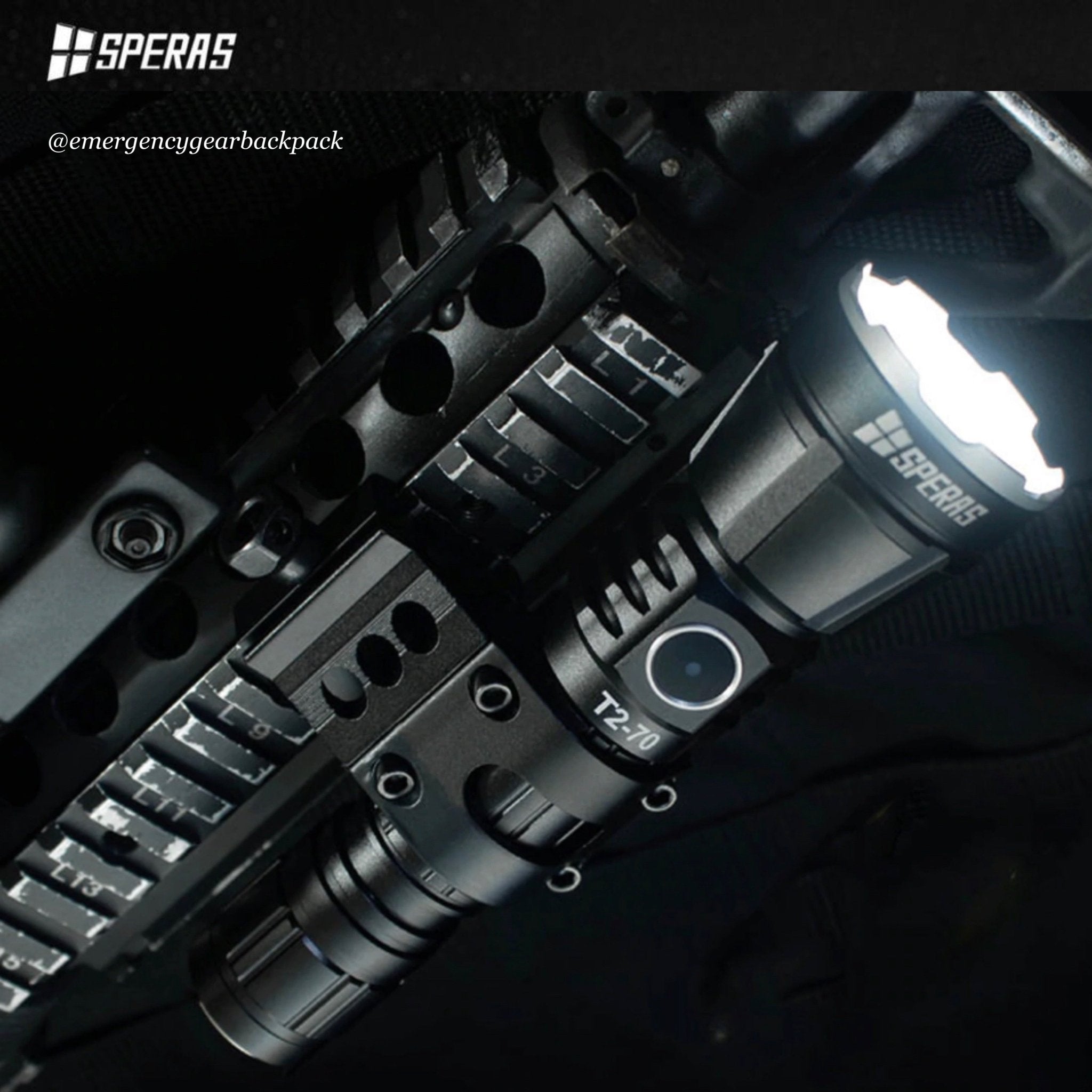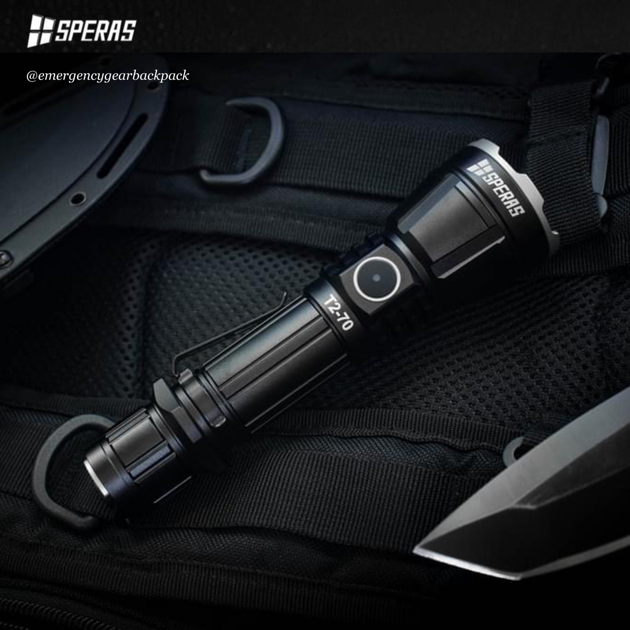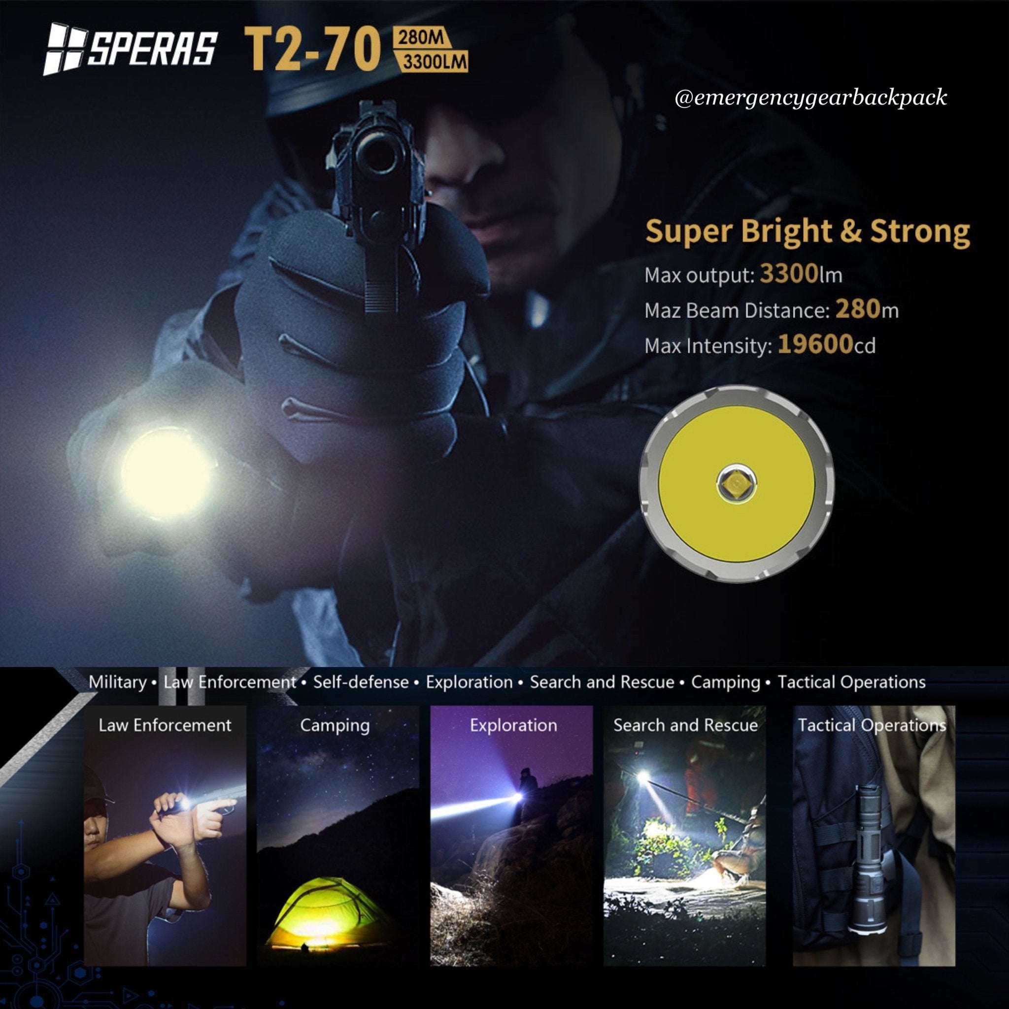 SPERAS T2-70 ไฟฉายแทคติคอลให้พลังแสงที่สว่างมากด้วยหลอด LED CREE XHP 70 3300LMS ลำแสงเข้มแสงพุ่งกว้าง ครอบคลุมพื้นที่ไกลสุด 280 เมตร