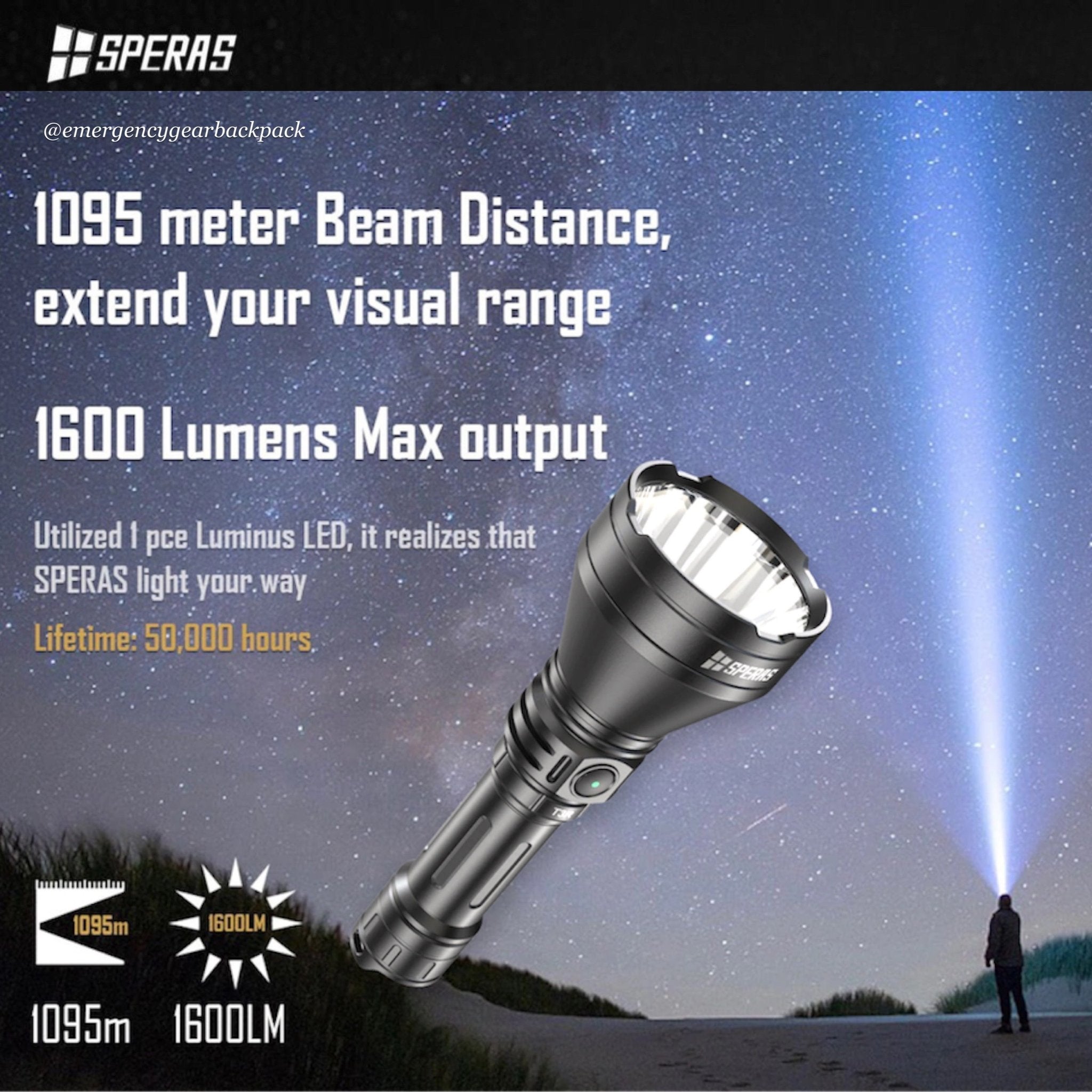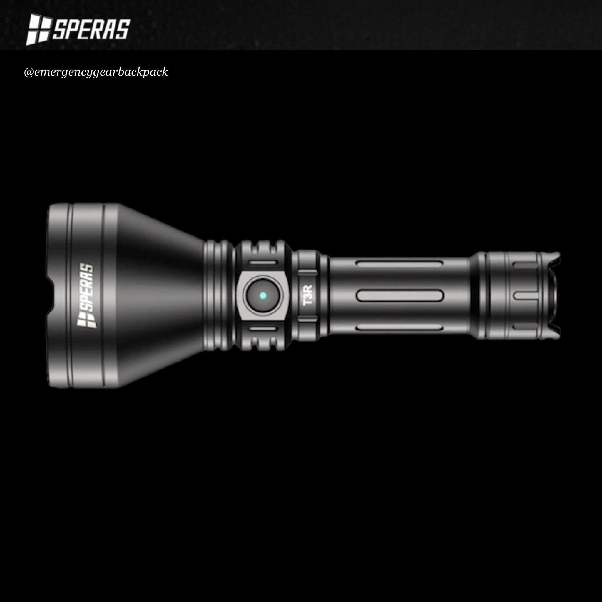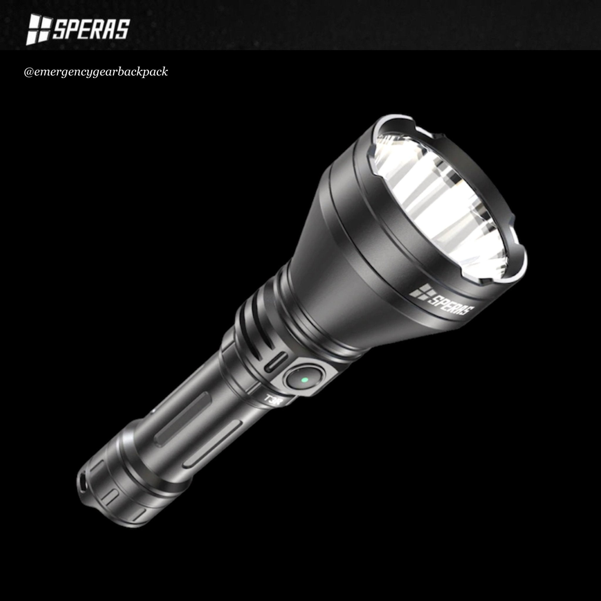 SPERAS T3R ไฟฉายแทคติคอลแสงพุ่งไกล ความร้อนต่ำ ใช้หลอด Luminus SFT-T40-W 1600LMS 300000CD อุณหภูมิสี 6500K โคมสะท้อนแสงอลูมิเนียมผิวเรียบและลึก ให้ Hotspot แสงเข้ม สปิลแสงกว้าง ลำแสงเข้มเป็นลำพุ่งไกล 1,095 เมตร