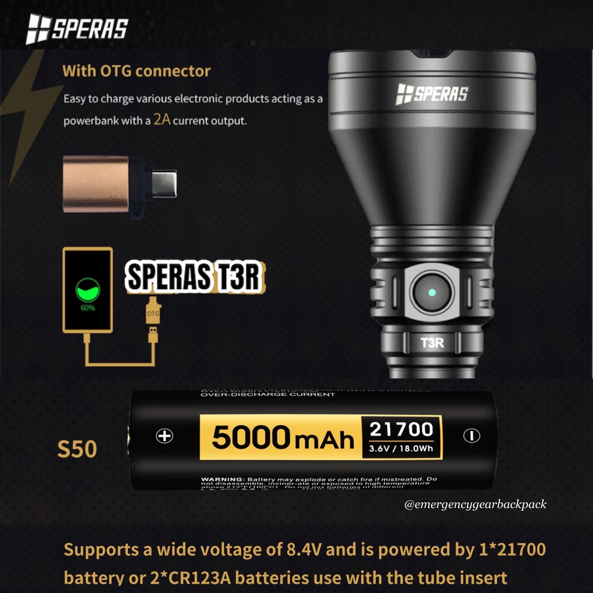 อุปกรณ์มาพร้อมแบตเตอรี่ SPERAS S50 21700 5000mAh 3.6V 18Wh PCB Protected ให้รันไทม์นานสุด 92 ชั่วโมง ในโหมด Eco 20LMS ชาร์จไฟผ่านพอร์ต USB Type-C มีอุปกรณ์เสริม On the Go Connector (OTG) เพิ่มฟังก์ชันเพาเวอร์แบงค์ จ่ายไฟจากแบตเตอรี่ให้กับอุปกรณ์ USB อื่น ๆ ที่ 5V/2A