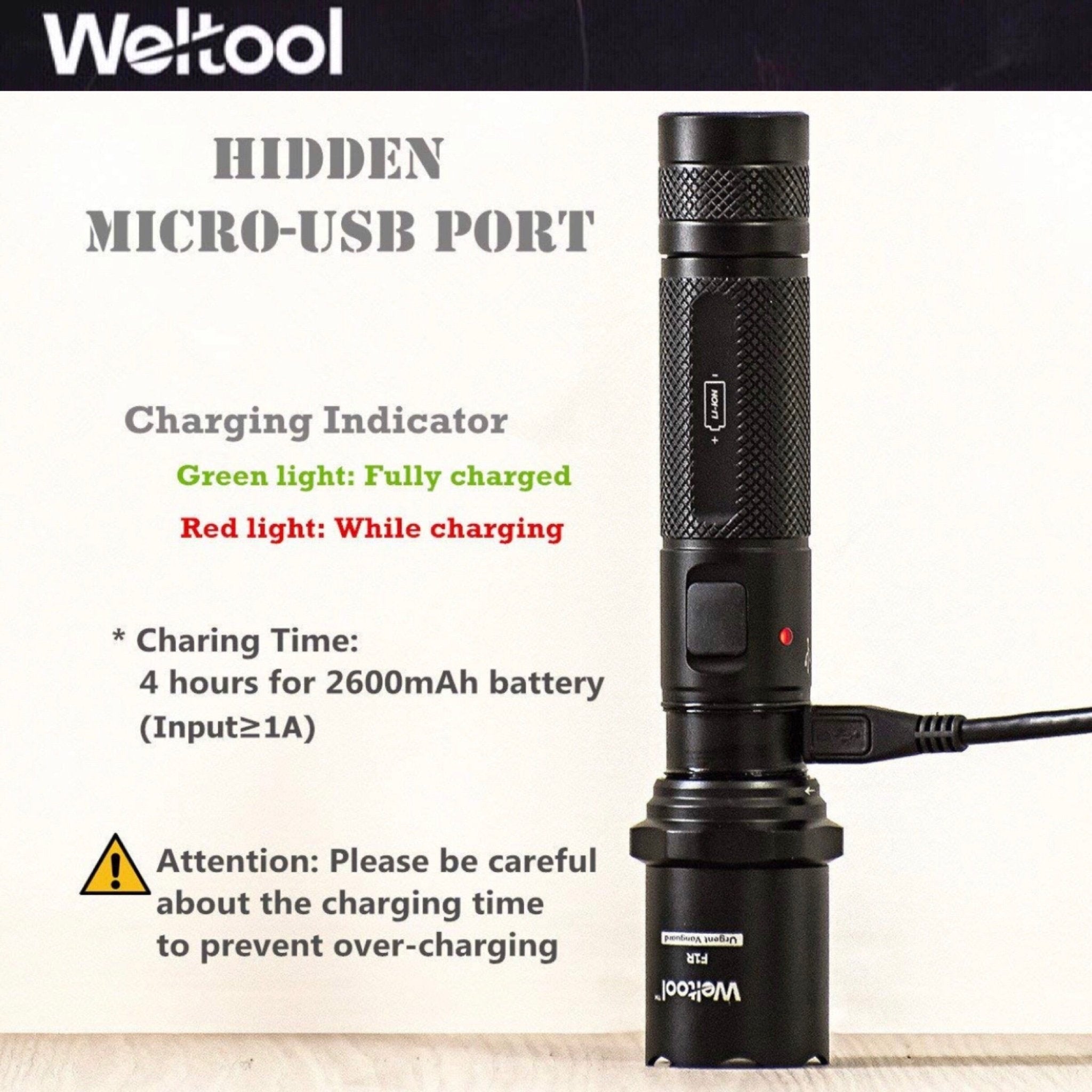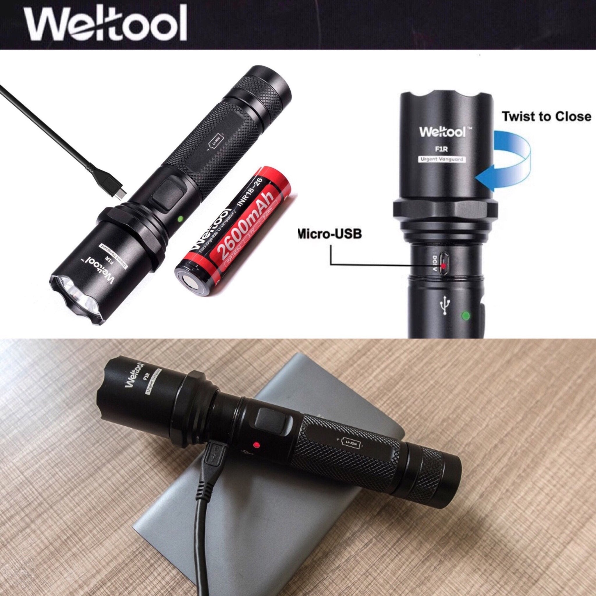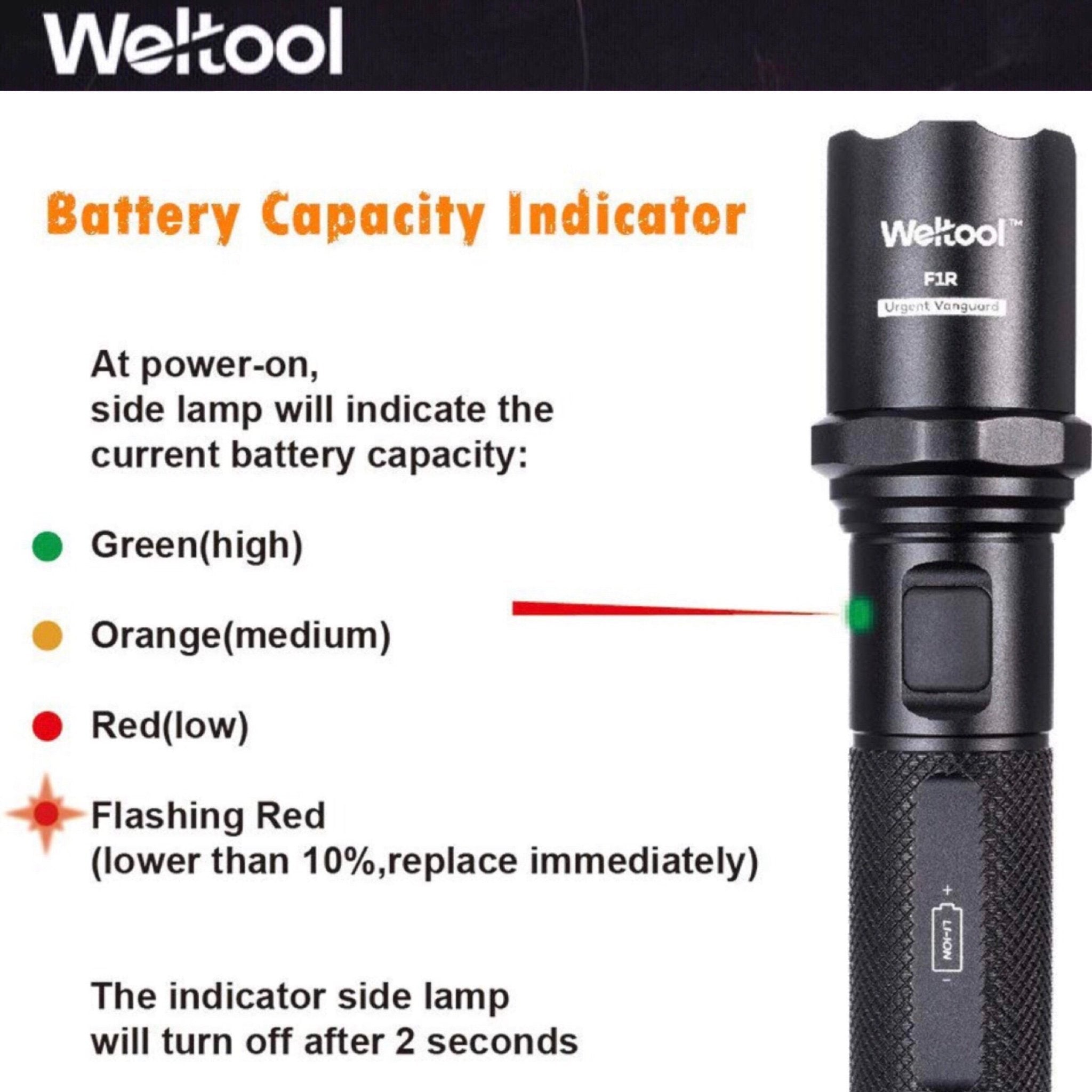 Weltool F1R มาพร้อม ระบบชาร์จในตัวแบบซ่อนพอร์ต (Hidden Micro USB) ที่ออกแบบมาอย่างชาญฉลาด เพียงบิดหัวไฟฉายตามเข็มนาฬิกา ก็สามารถเผยพอร์ต Micro USB เพื่อชาร์จได้ทันที การซ่อนพอร์ตนี้ยังช่วยป้องกันฝุ่นและความชื้นได้อย่างมีประสิทธิภาพ ในขณะชาร์จ ไฟ LED จะขึ้นสีแดง และเปลี่ยนเป็นสีเขียวเมื่อชาร์จเต็ม คุณสามารถเชื่อมต่อสาย USB ที่ให้มากับแหล่งพลังงาน USB ใดก็ได้ (เช่น ในรถยนต์, คอมพิวเตอร์, หรืออะแดปเตอร์ผนัง) เพื่อให้ไฟฉายของคุณพร้อมใช้งานเสมอ รองรับการใช้งานแบตเตอรี่ Li-ion 18650 เพียงก้อนเดียว