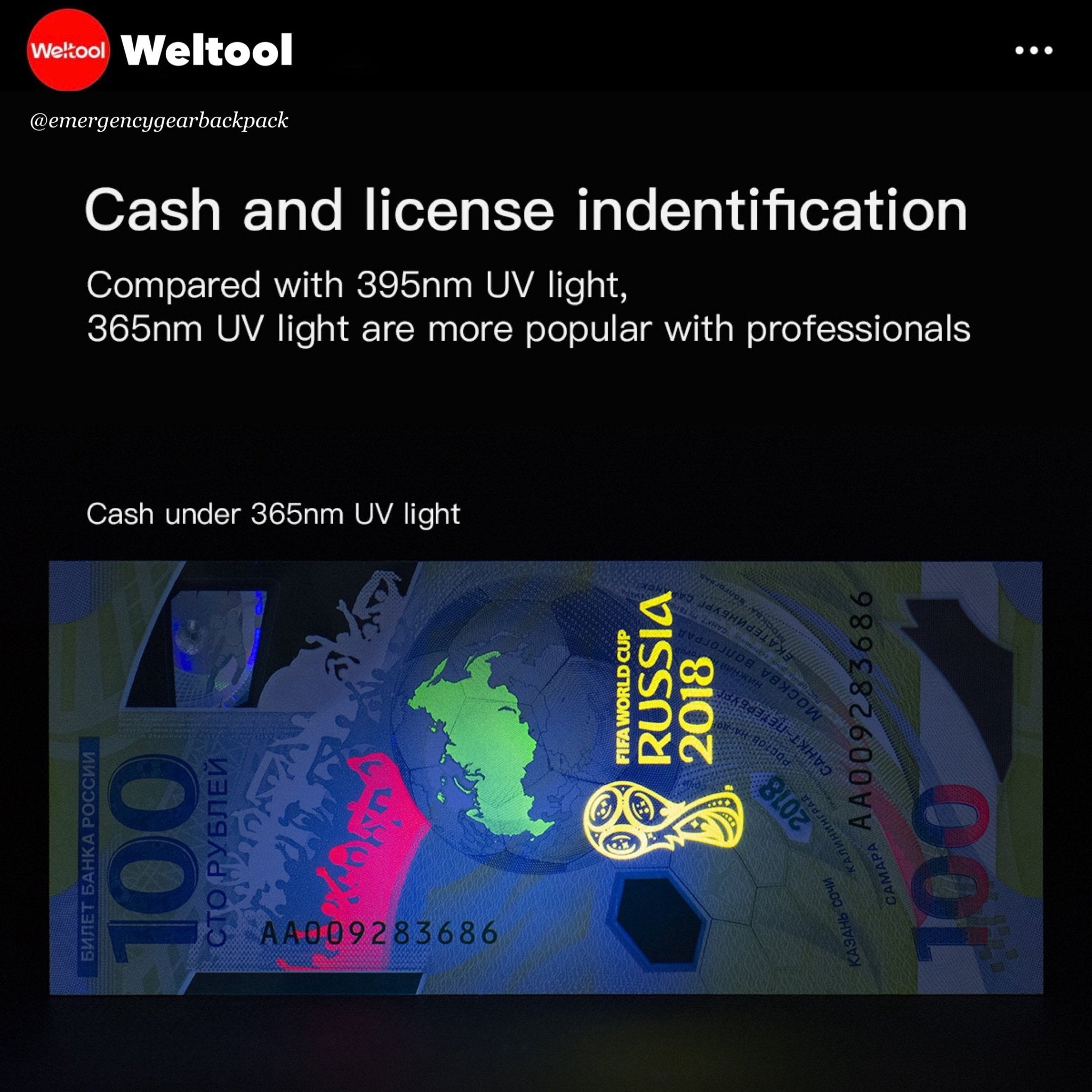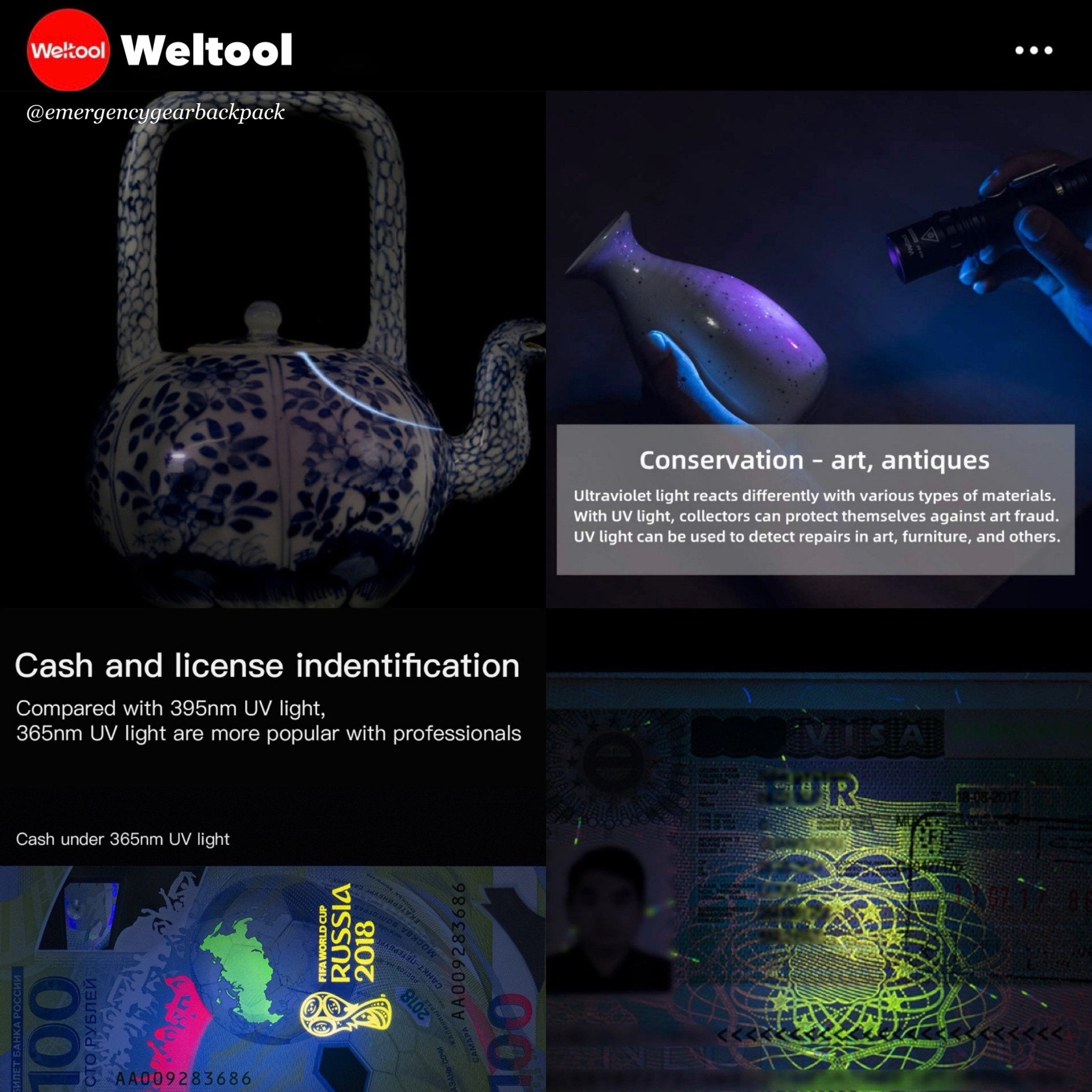 Weltool M2-BF ให้แสงอัลตร้าไวโอเล็ตที่ความยาวคลื่น 365nm ใช้โคมสะท้อนแสงอะลูมิเนียมอัลลอยและฟิลเตอร์เลนส์สีดำคุณภาพสูง กรองแสงที่ไม่ใช่ UV 365nm ออกไปเพื่อให้ได้แสงที่บริสุทธิ์และเข้มข้น