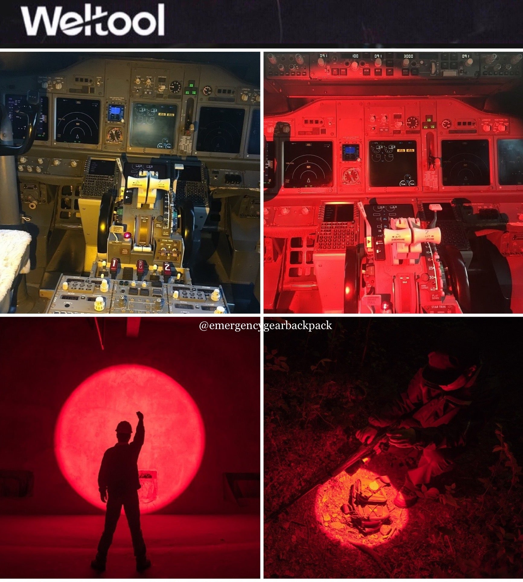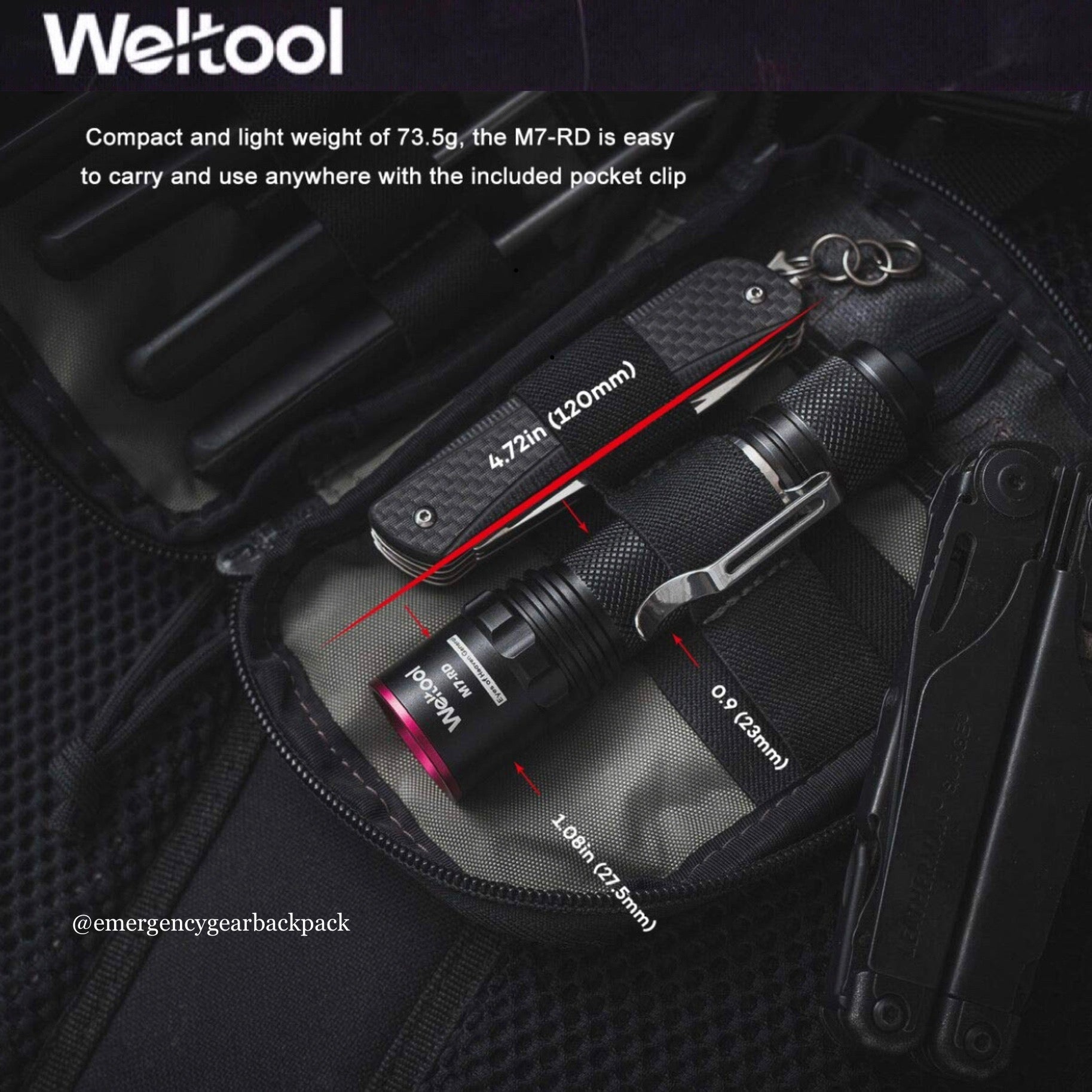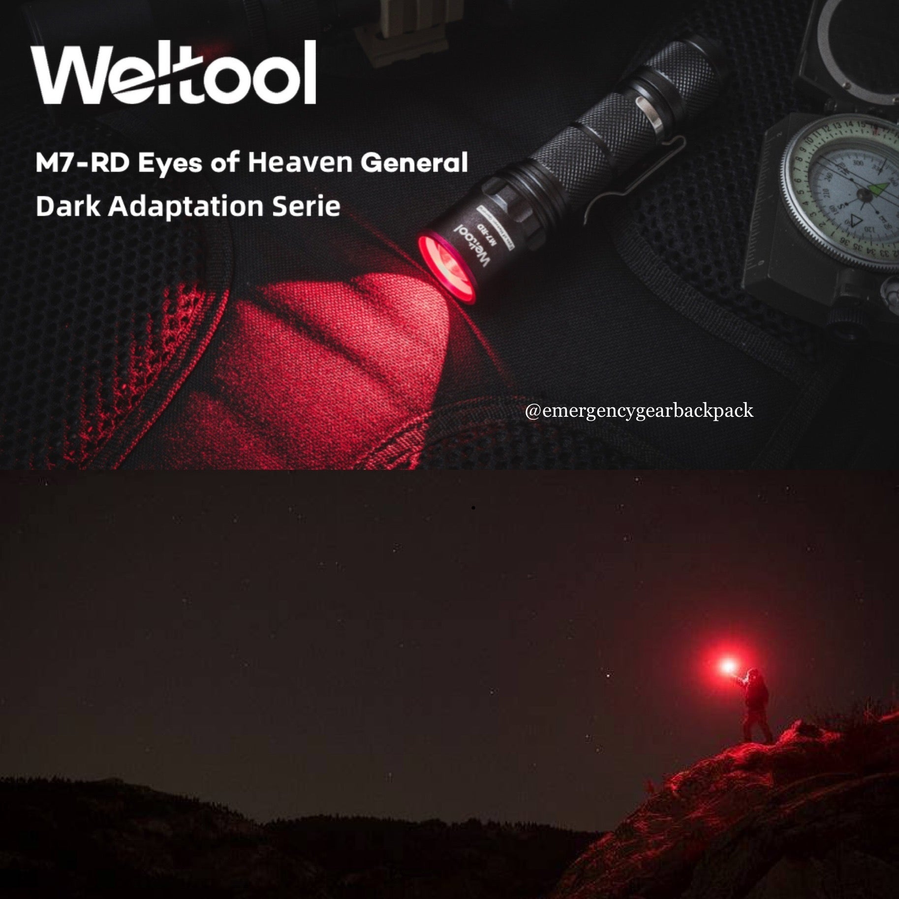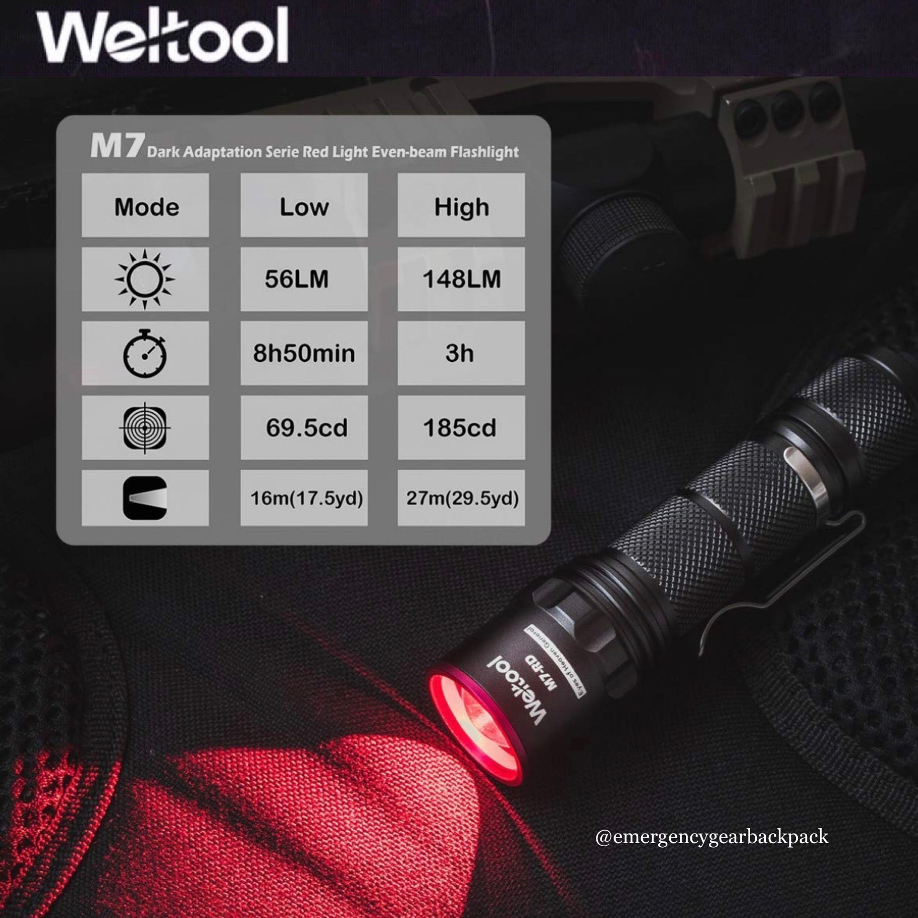Weltool M7-RD ให้คลื่นแสงสีแดงไม่รบกวนต่อความไวของม่านตาที่ขยายตัวเมื่อแสงน้อย และหดตัวเมื่อได้รับแสงมาก ในการปฏิบัติงานในที่มืดม่านตาเราจะขยายเต็มที่เพื่อให้เห็นภาพได้ชัดเจนมากขึ้นการใช้ไฟฉายแสงขาวจะทำให้ม่านตาหดตัวลง เมื่อปิดไฟฉายทันทีม่านตาเราจะปรับตัวไม่ทันทำให้เกิดอาการตาพร่ามัวไปชั่วขณะ การเปิดปิดไฟฉายในที่มืดโดยใช้แสงสีแดงไม่ทำให้ม่านตาหดตัวเมื่อได้รับแสง เมื่อปิดไฟฉายสายตาเราจะมองเห็นในความมืดได้เหมือนเดิม