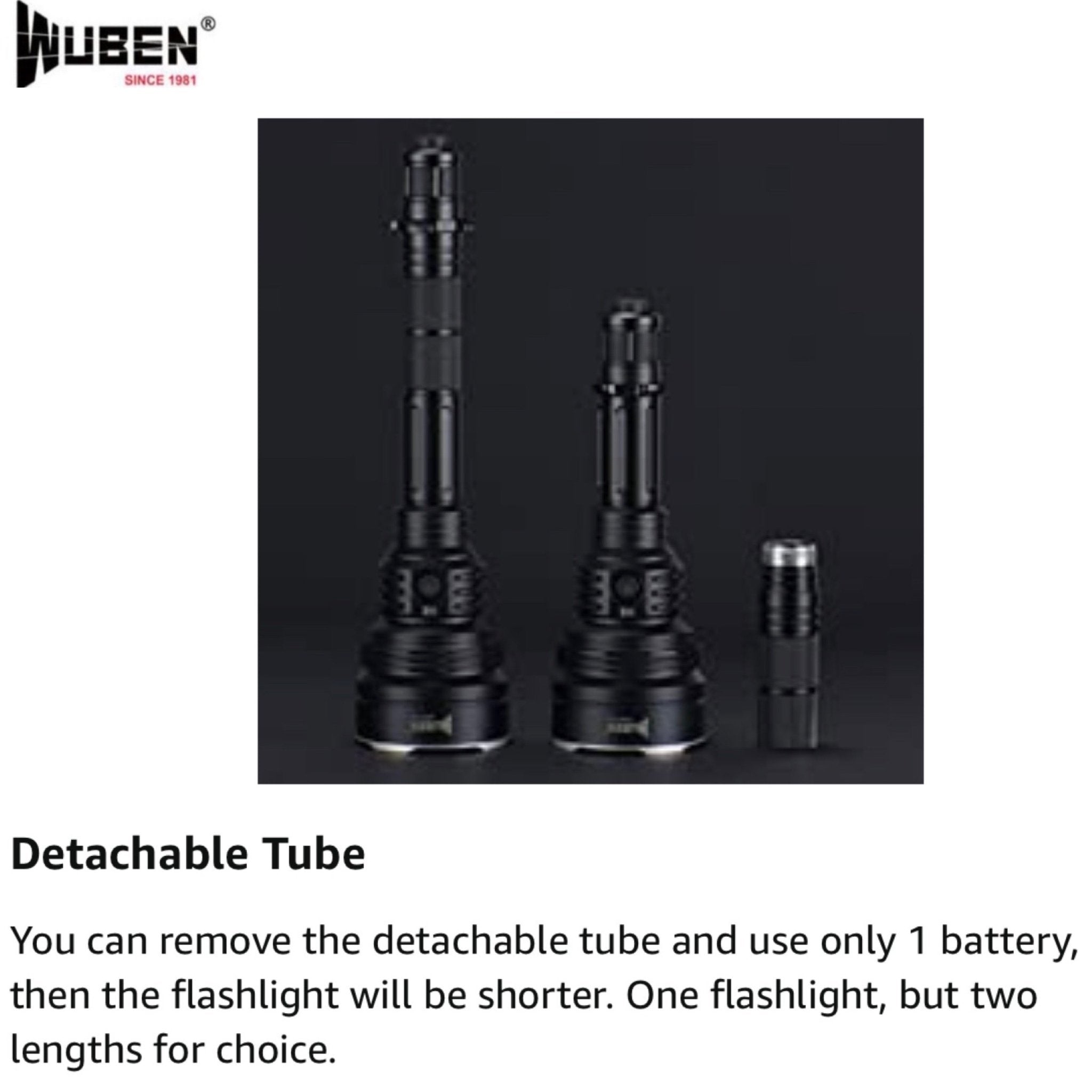 Detachable battery tube: สามารถถอดท่อกลางลำตัวเพื่อลดความยาวของไฟฉาย และใช้แบตเตอรี่เพียง 1 ก้อน
