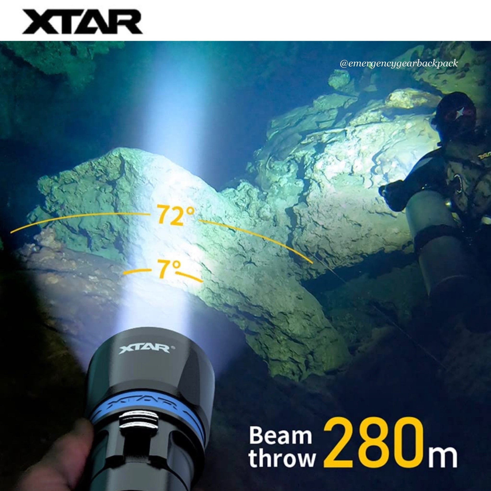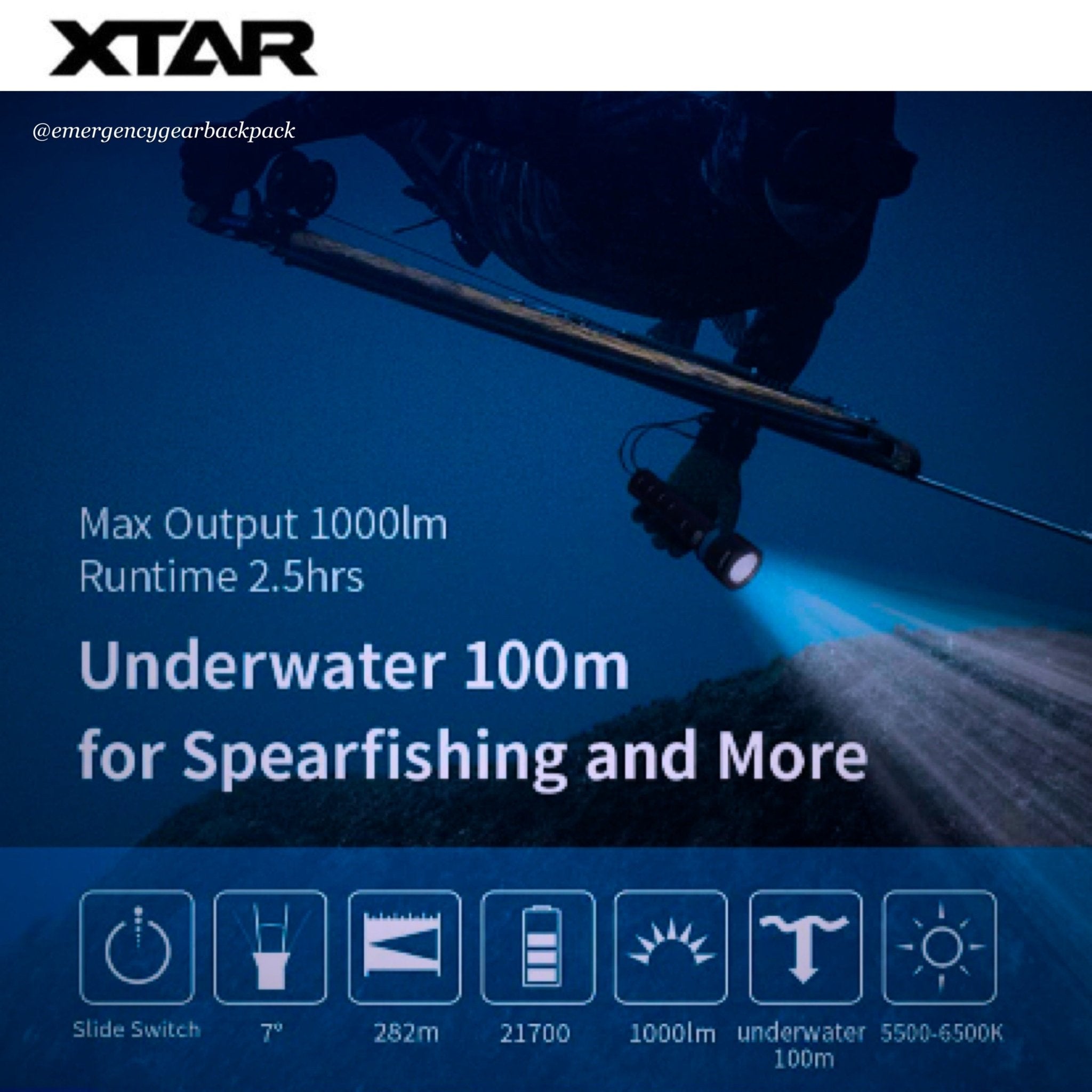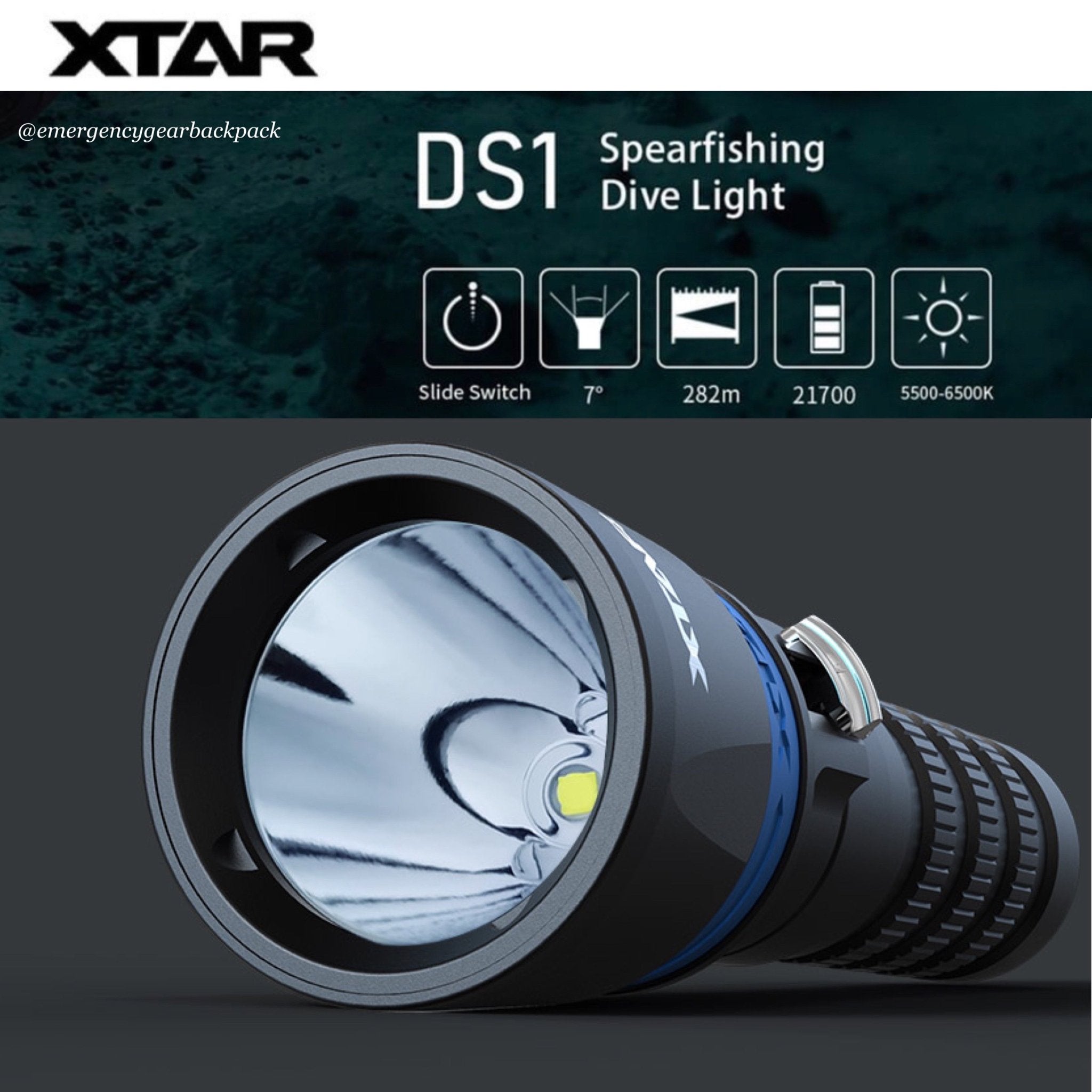 XTAR DS1 Spearfishing Diving Flashlight ไฟฉายดำน้ำคุณภาพสูง ออกแบบมาสำหรับนักดำน้ำมืออาชีพและกิจกรรมใต้น้ำทุกประเภท ใช้หลอด CREE® XP-L2 LED ให้ความสว่างสูงสุด 1000 ลูเมนส์ ความเข้มแสง 20,032 แคนเดลา อุณหภูมิสี 5500–6500K ลำแสงพุ่งไกล 282 เมตร