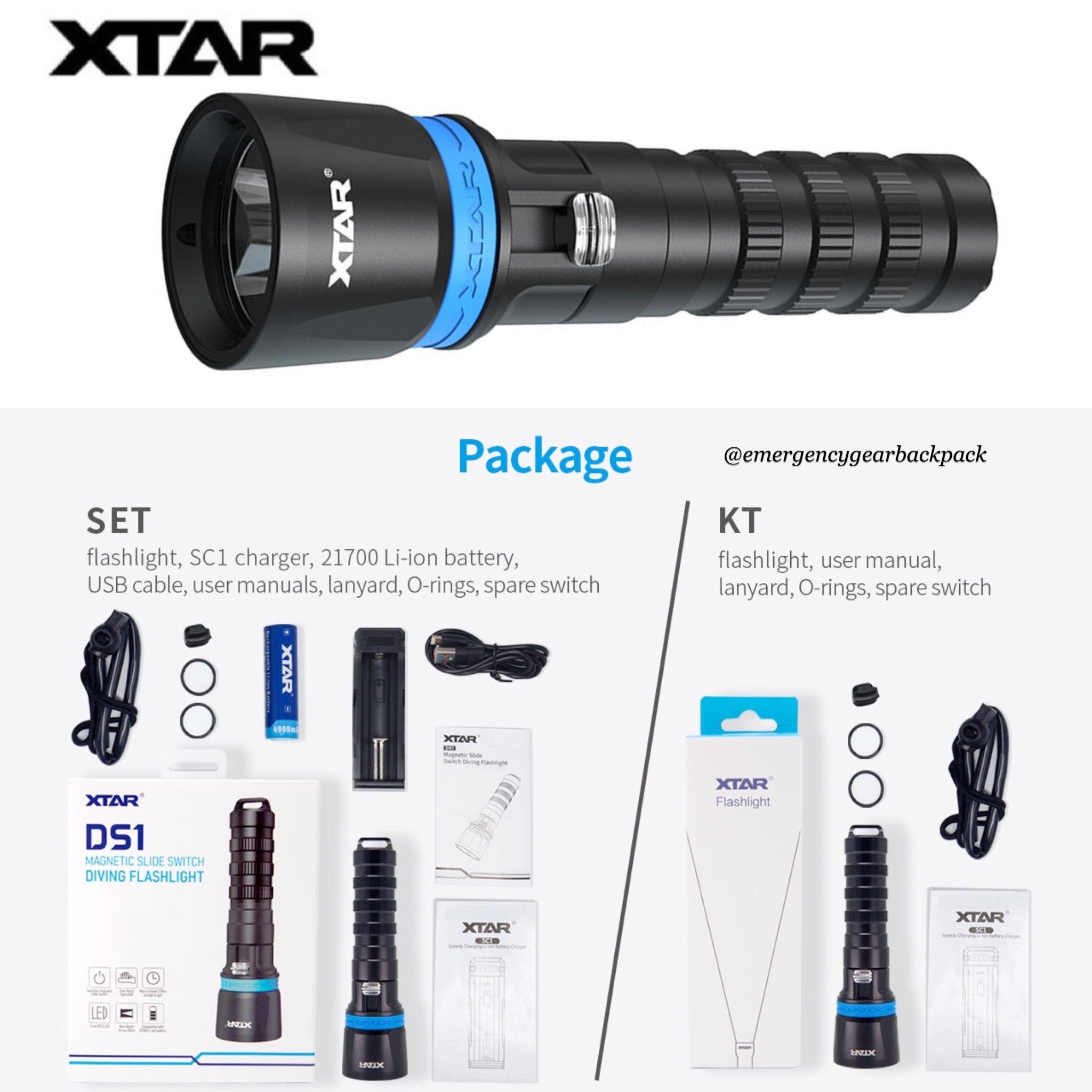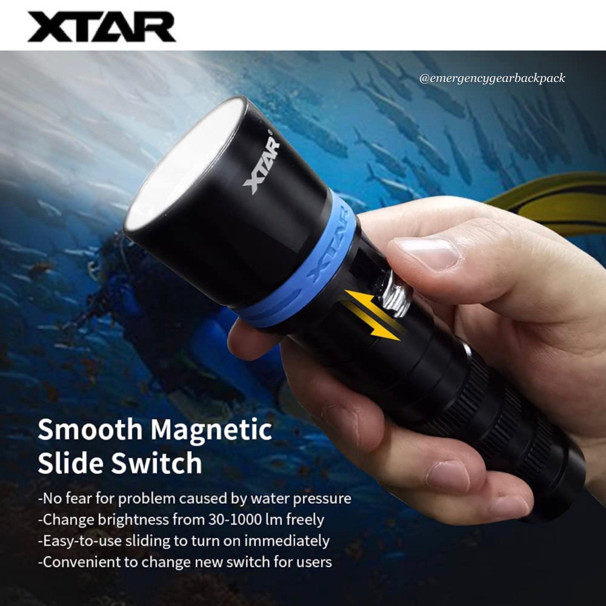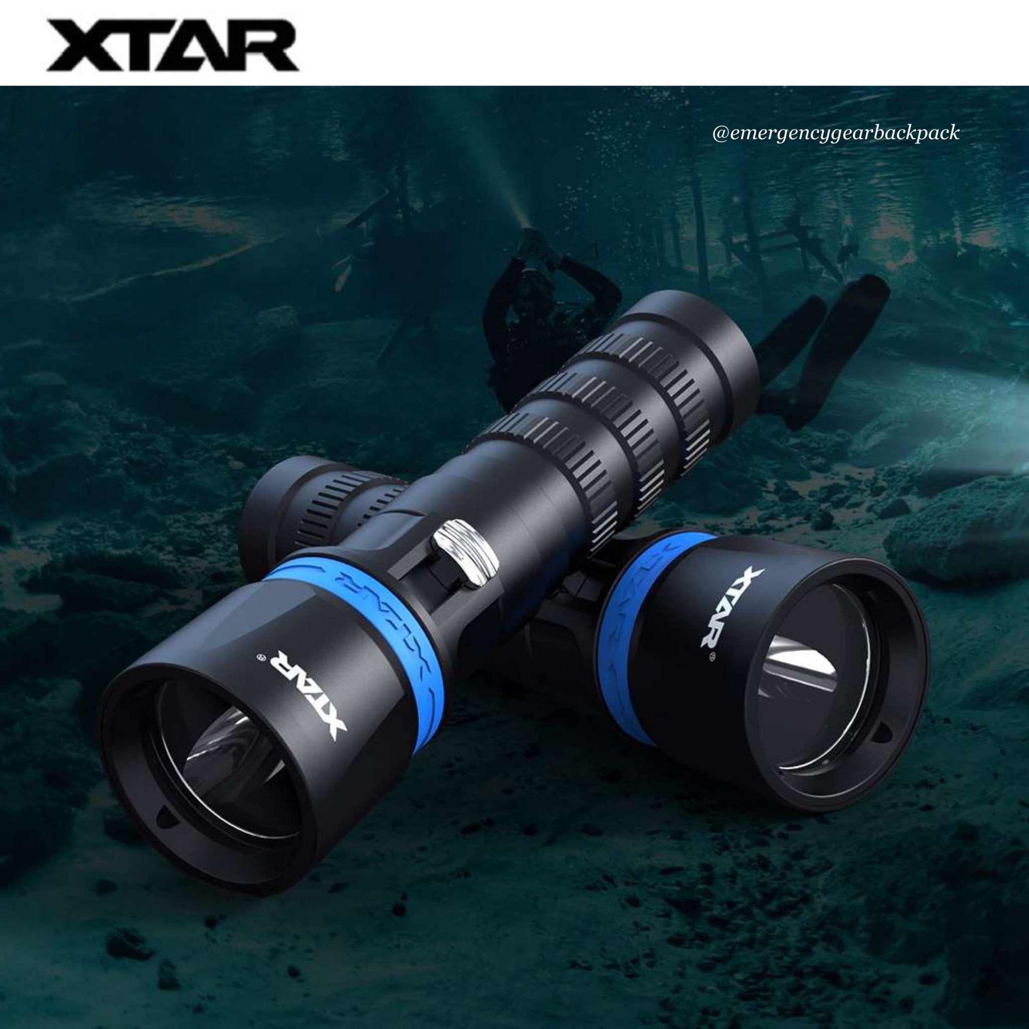 XTAR DS1 Spearfishing Diving Flashlight ไฟฉายดำน้ำคุณภาพสูง ออกแบบมาสำหรับนักดำน้ำมืออาชีพและกิจกรรมใต้น้ำทุกประเภท ใช้หลอด CREE® XP-L2 LED ให้ความสว่างสูงสุด 1000 ลูเมนส์ ความเข้มแสง 20,032 แคนเดลา อุณหภูมิสี 5500–6500K ลำแสงพุ่งไกล 282 เมตร