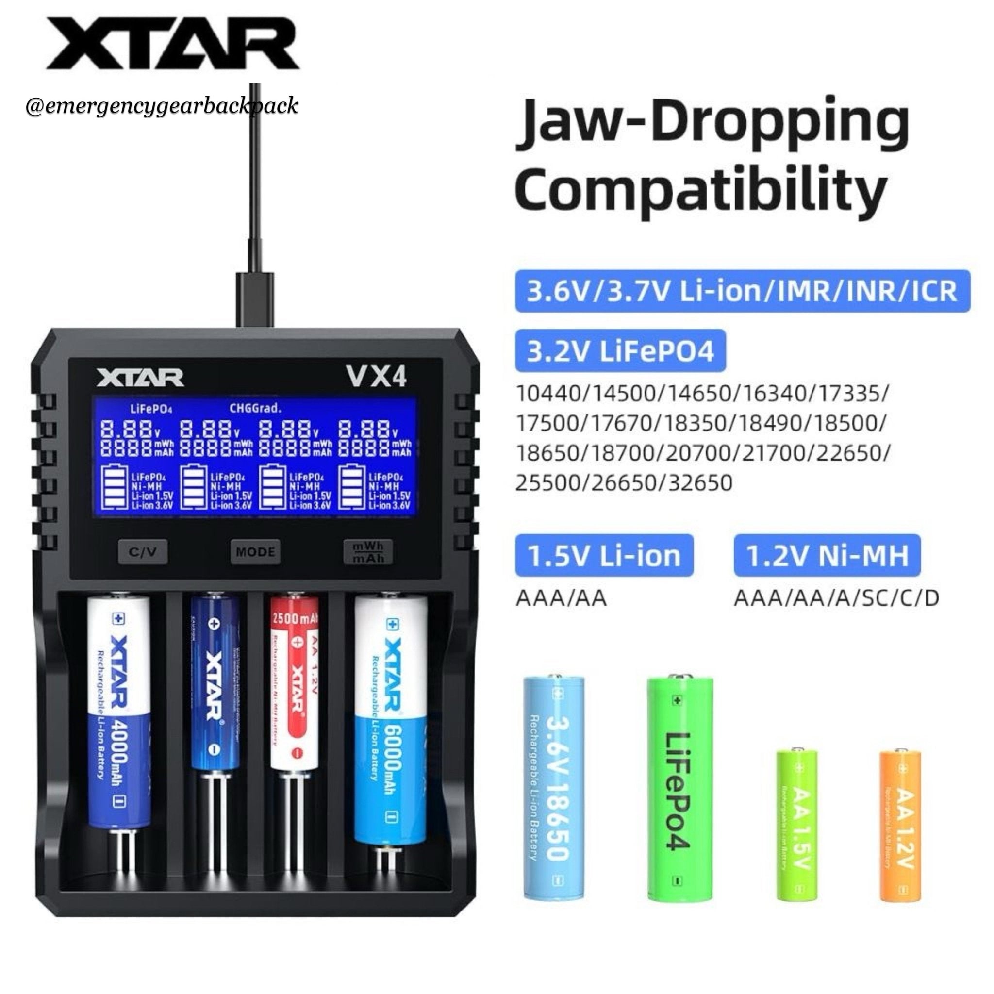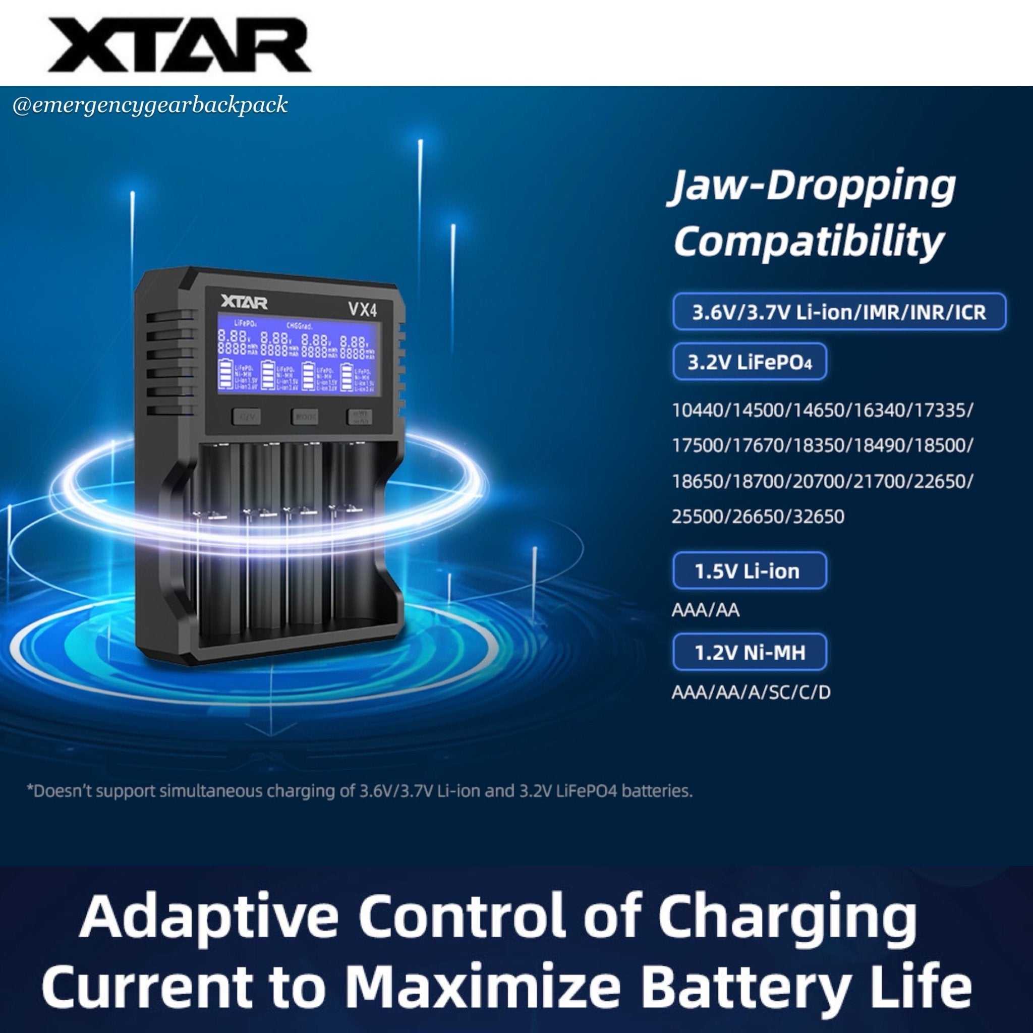 - รองรับแบตเตอรี่หลายขนาด: VX4 รองรับแบตเตอรี่ที่มีเส้นผ่าศูนย์กลาง: 10-32mm และความยาว 34-80mm ซึ่งรวมถึงแบตเตอรี่ขนาดต่างๆ เช่น Li-ion 3.6V/3.7V, LiFePO4 3.2V, NI-MH 1.2V ทำให้สามารถชาร์จแบตเตอรี่หลากหลายรูปแบบในเครื่องเดียว